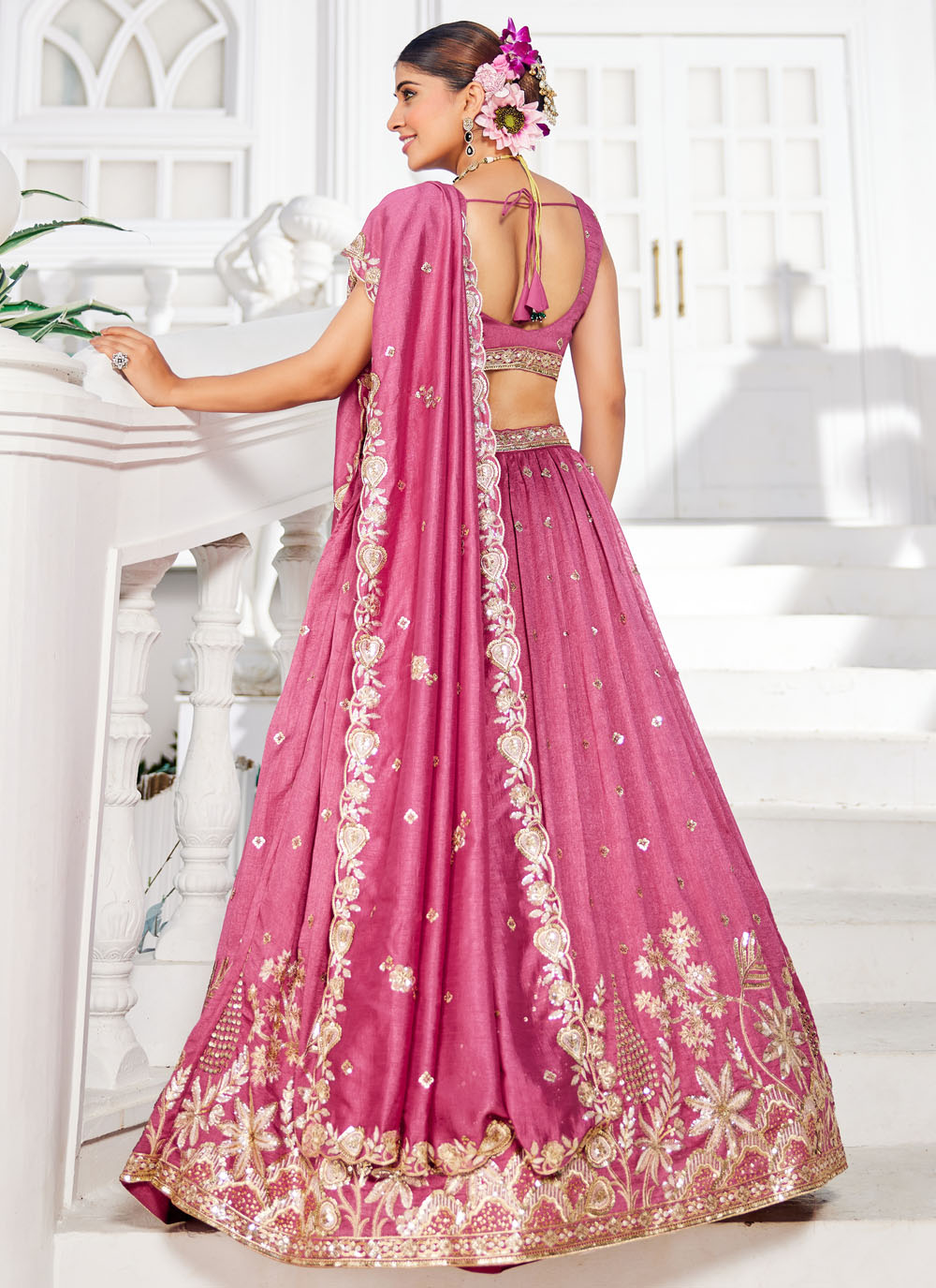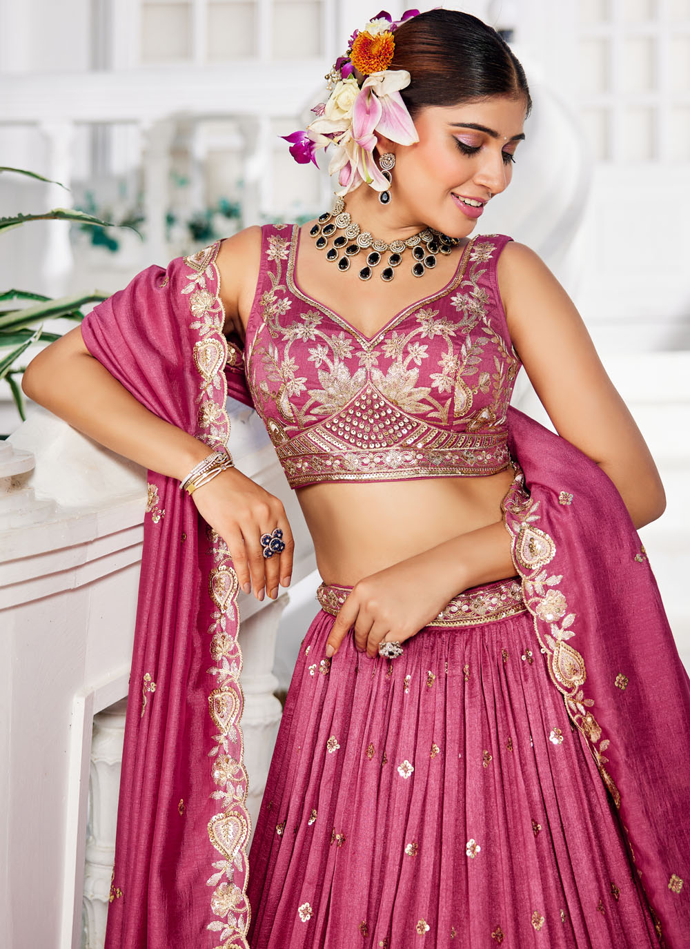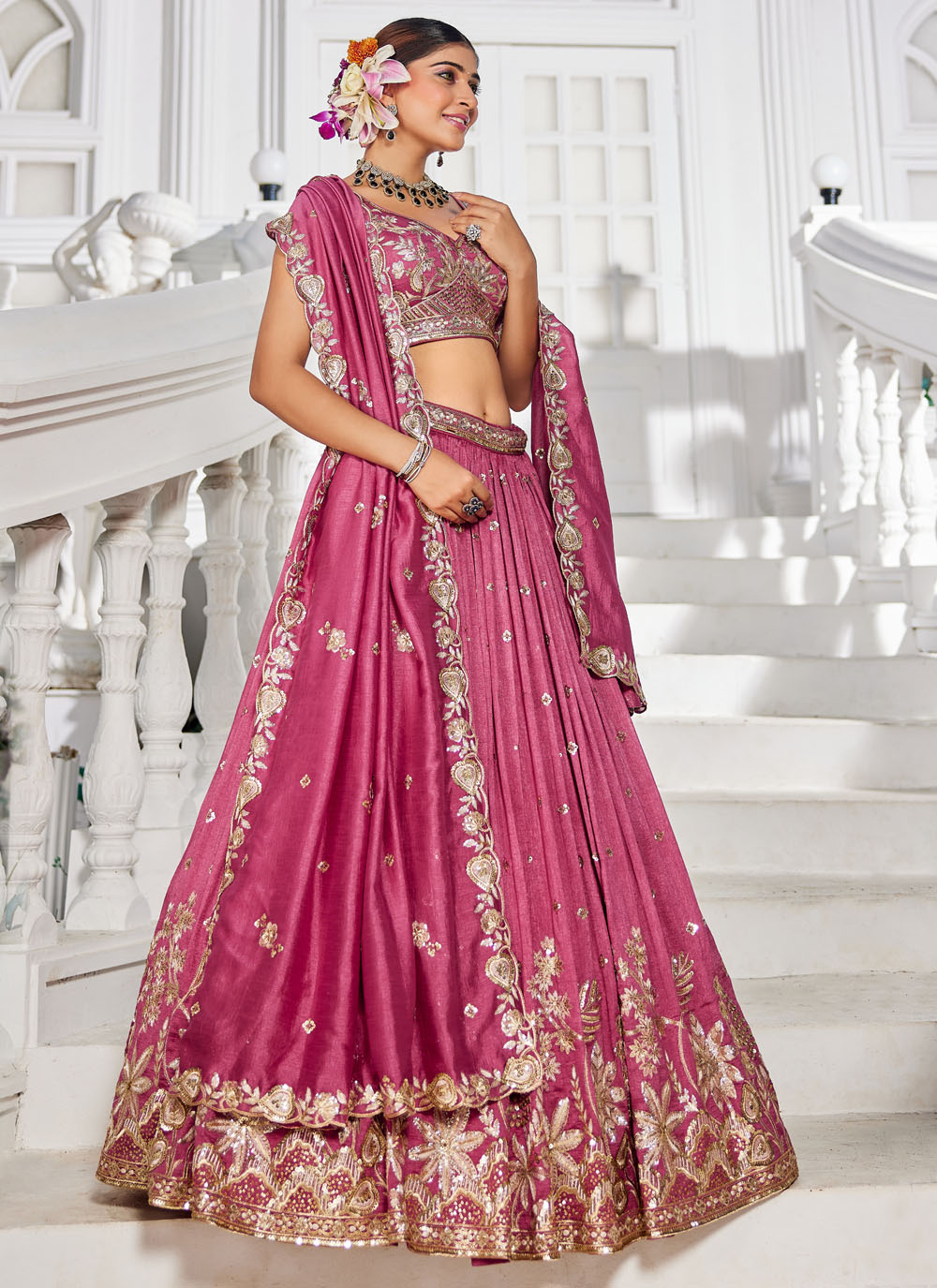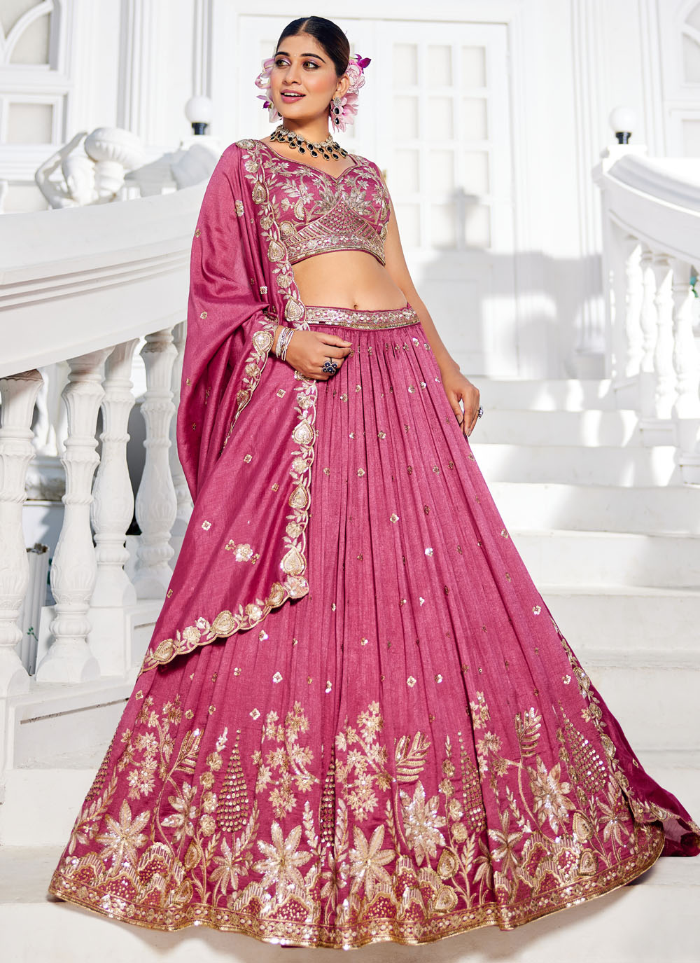 Designed for wedding charm, this pink embroidered georgette lehenga choli captures the spirit of festivity. The luxe embroidery work paired with its lightweight drape makes it a flawless choice for bridesmaids or guests. Comes with matching choli and dupatta.