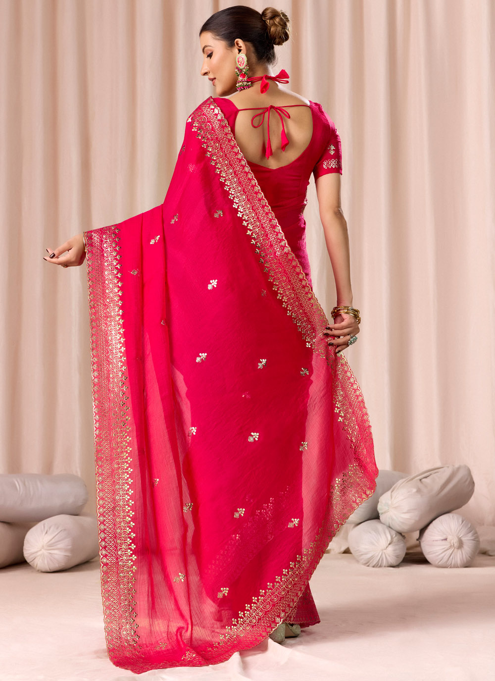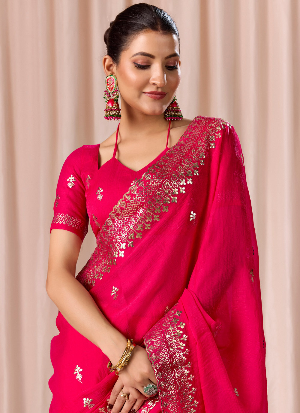 Designed for contemporary style lovers, this Embroidered Pink Chiffon Saree offers comfort with elegance. The refreshing pink shade and detailed embroidery make it a must-have for festive occasions. Comes with matching blouse.