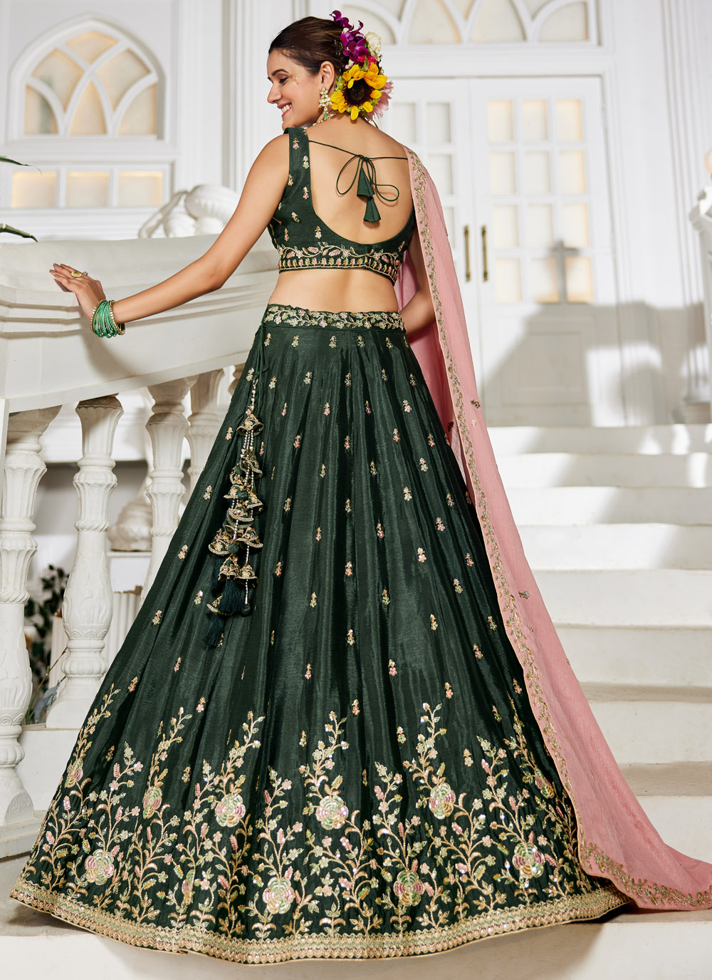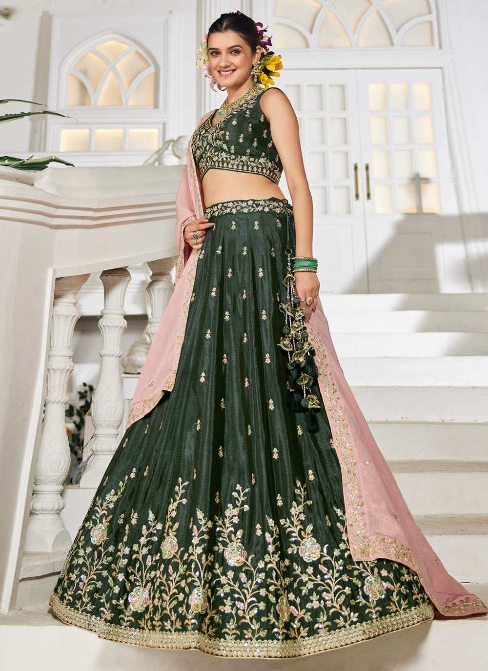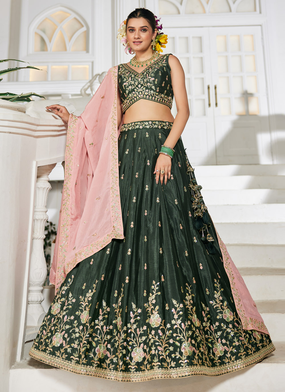 Exude charm in this Green Chiffon A-Line Lehenga Choli, beautifully detailed with shimmering sequins and delicate thread embroidery. The airy chiffon fabric ensures a graceful silhouette, making it an ideal choice for festive functions, weddings and sangeet nights. Comes with matching choli and dupatta.