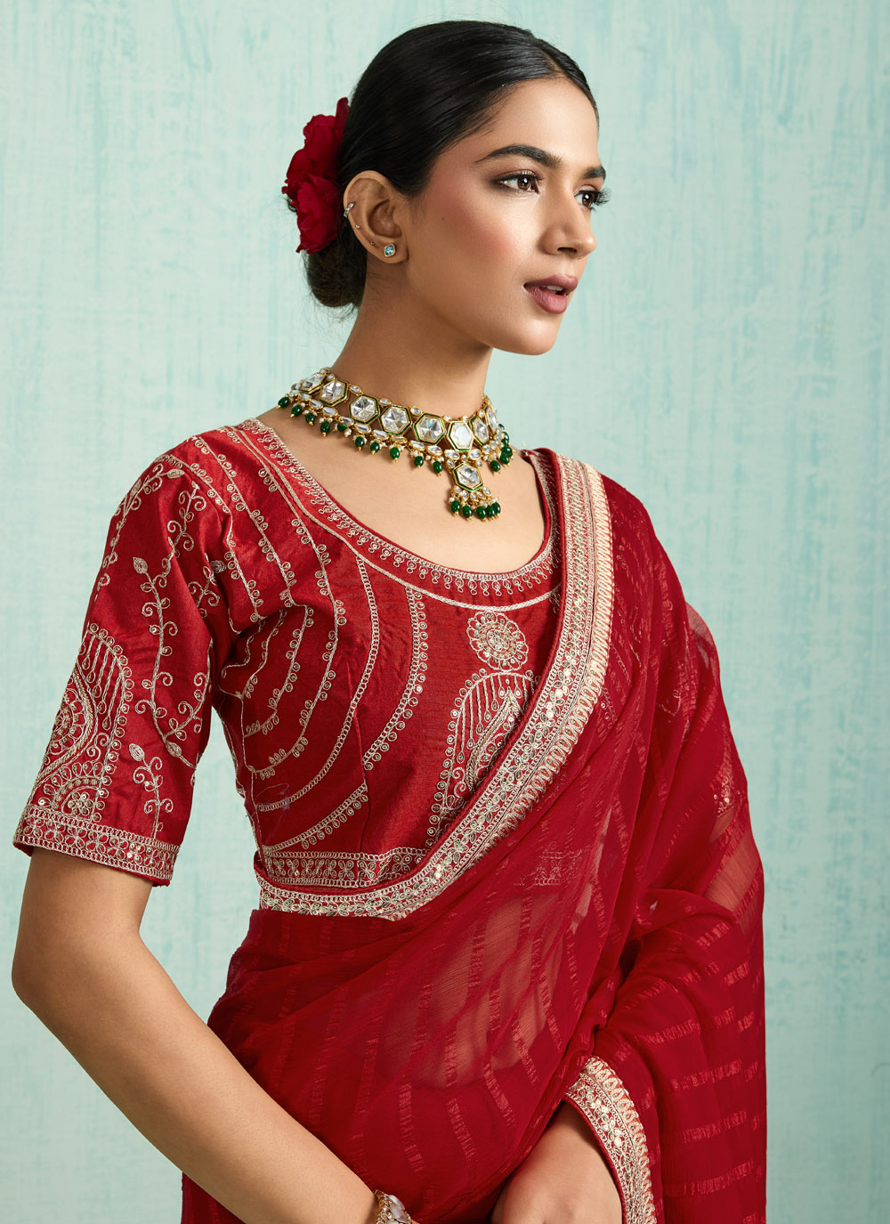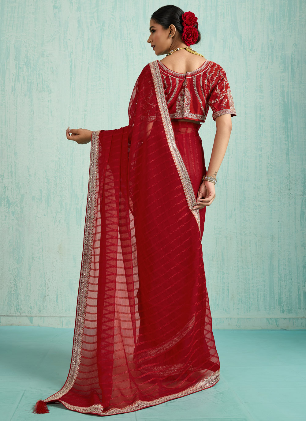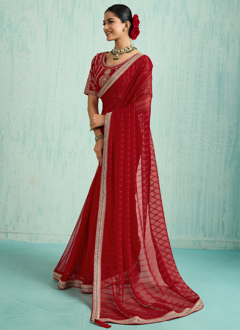 Step into festive elegance with this red chiffon saree adorned with sequins and zari embroidered borders. The lightweight chiffon fabric flows gracefully, while the shimmer of sequins adds the perfect festive sparkle. Comes with matching blouse.