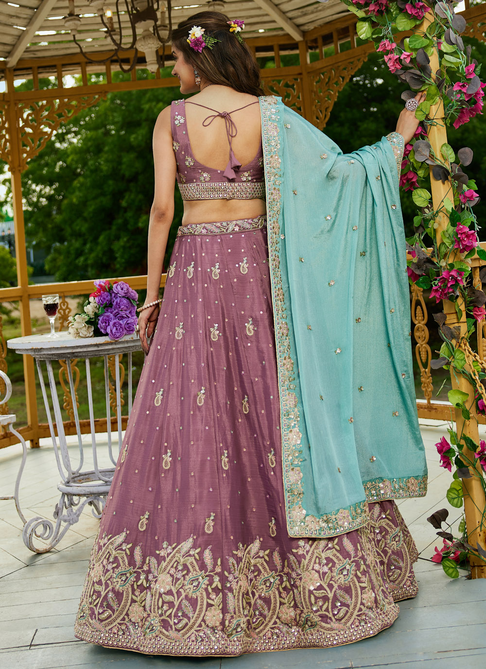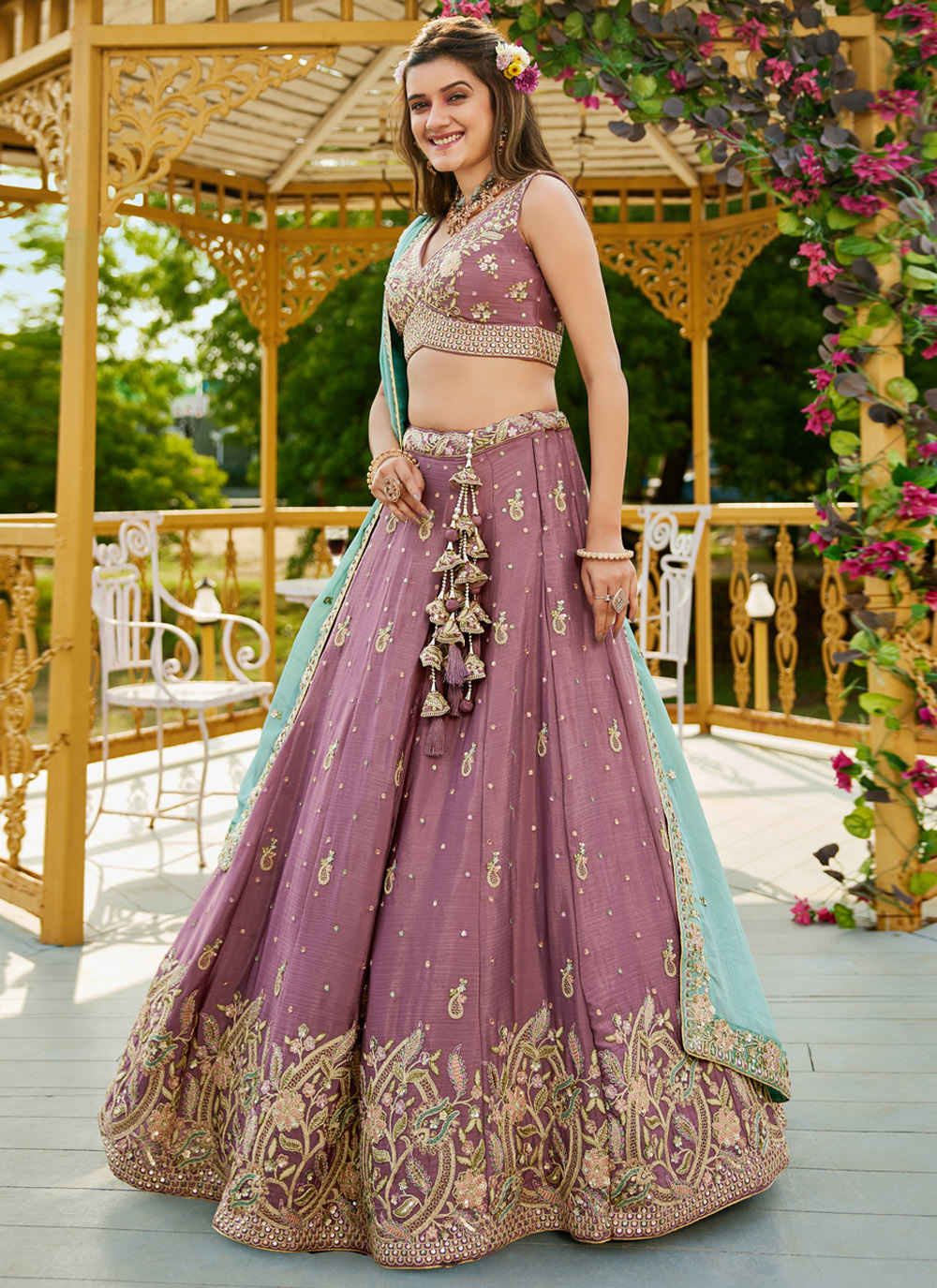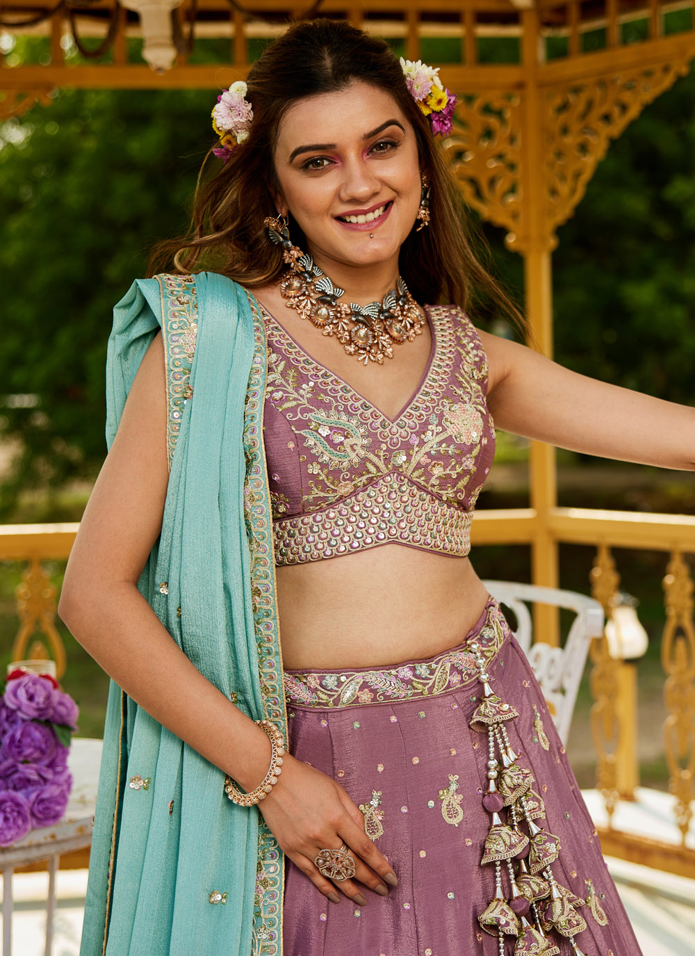 This stunning purple lehenga choli in chiffon features intricate threadwork, sparkling sequins and elegant zari detailing. Lightweight yet richly adorned, it’s an ideal ensemble for sangeet nights and wedding festivities. Comes with matching choli and dupatta.