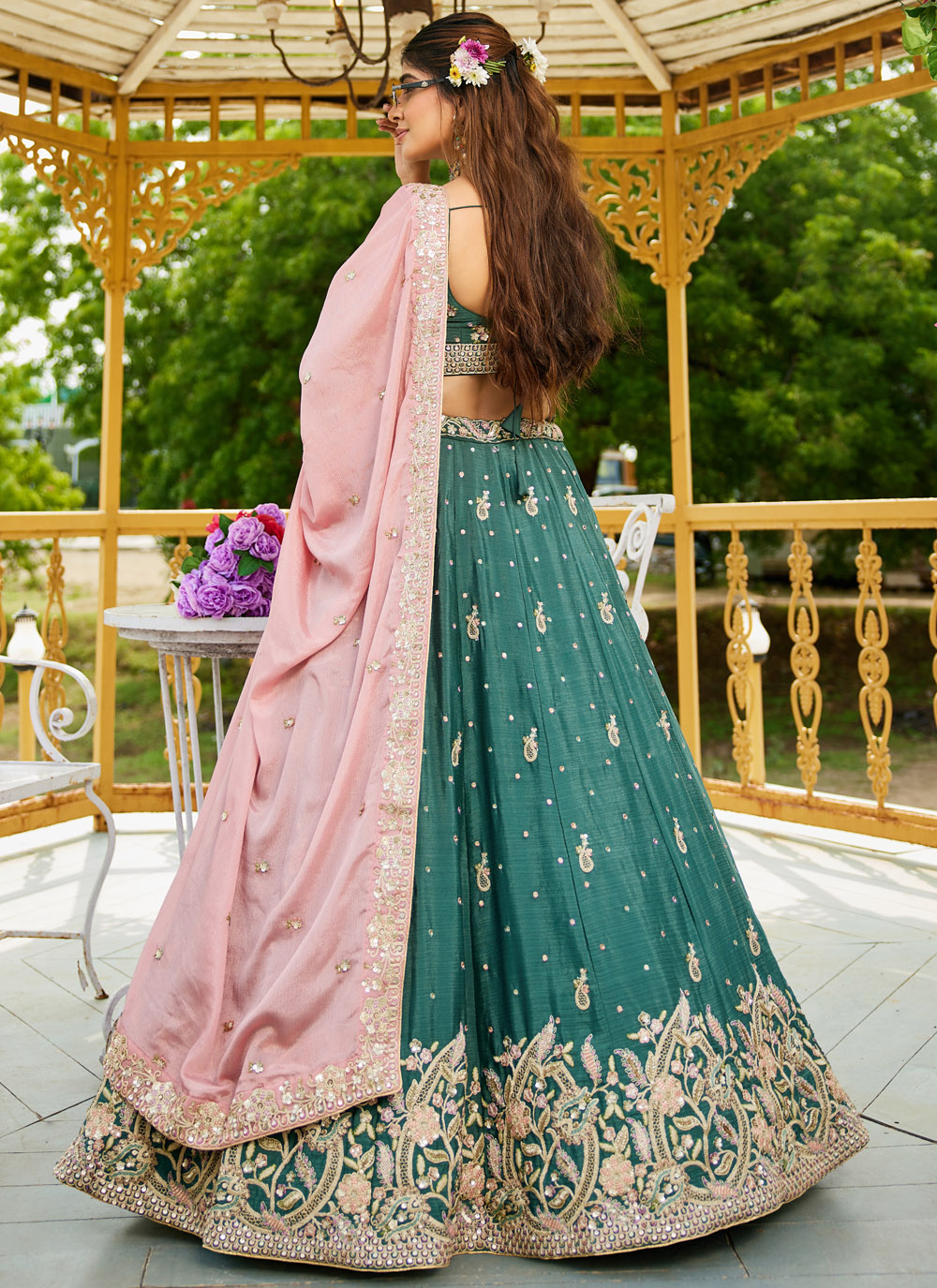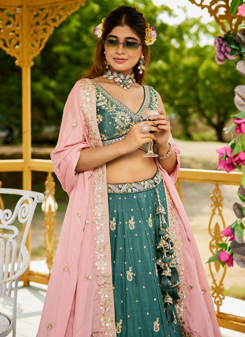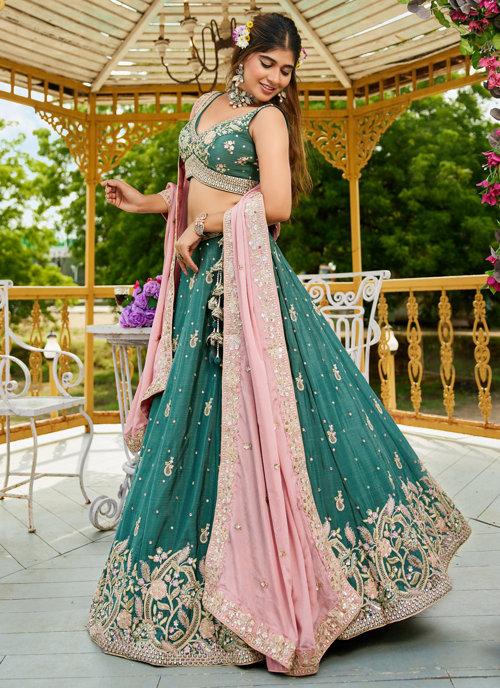 Turn heads in this teal chiffon A-line lehenga choli, Intricate thread and zari embroidery beautifully enhance the flowy chiffon fabric, creating an effortlessly stylish look. The flattering A-line silhouette makes it ideal for festive events, pre-wedding functions and celebrations Comes with matching choli and dupatta.