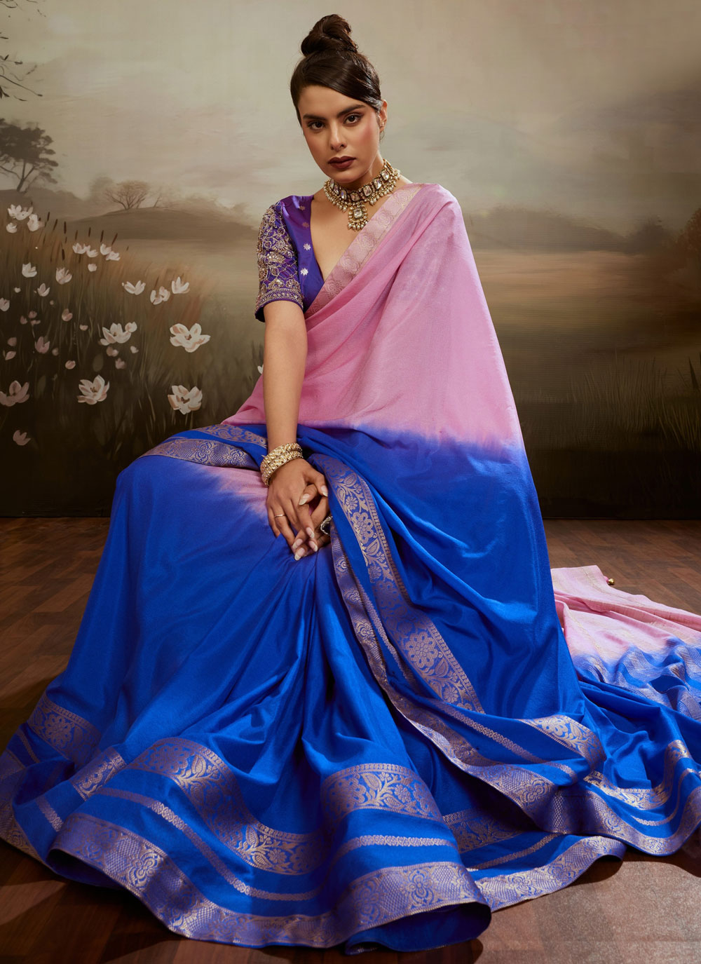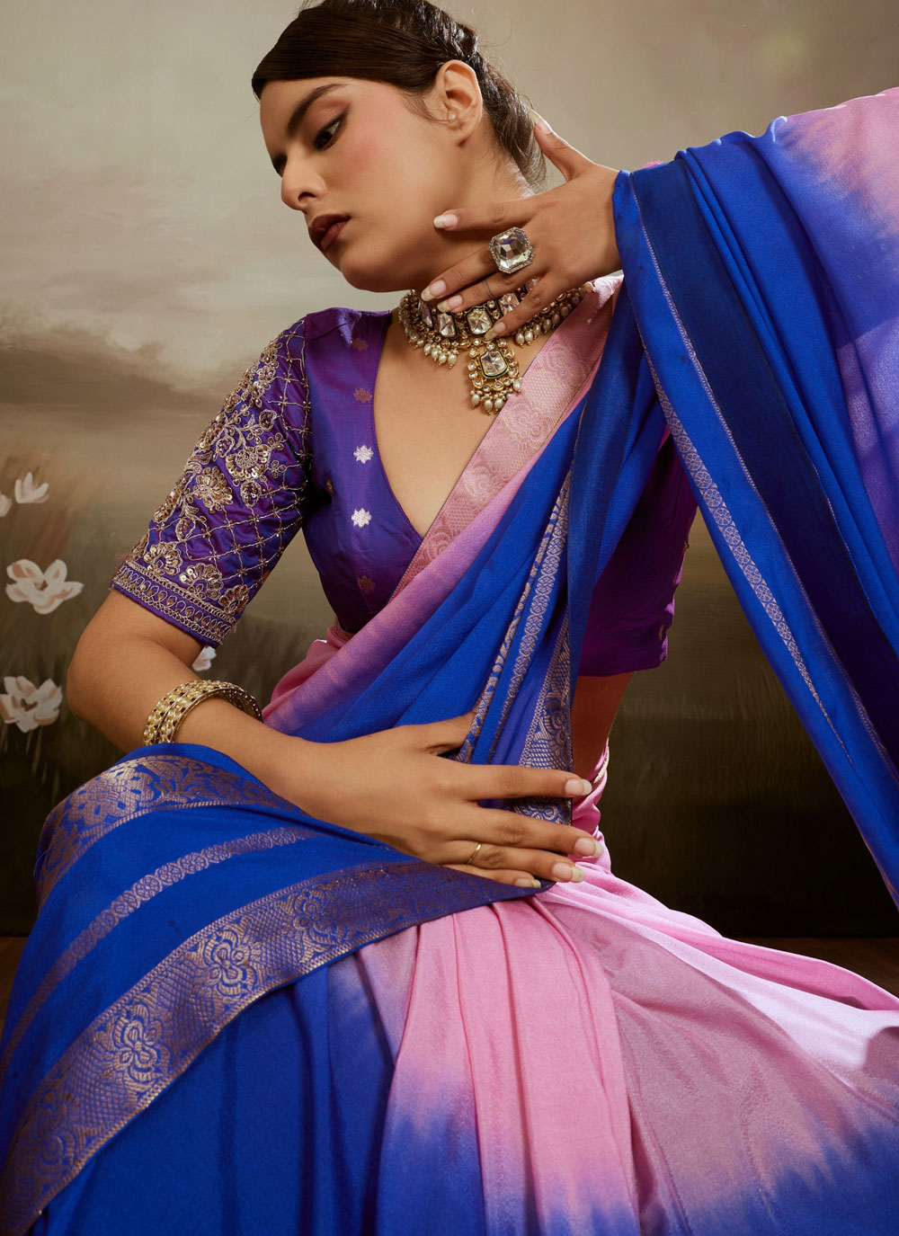 Elegant and versatile, this Chiffon Woven Blue and Pink Classic Saree is ideal for women who appreciate comfortable and stylish ethnic wear. The vibrant colour pairing combined with tasteful woven artistry creates a sophisticated look. Comes with matching blouse.