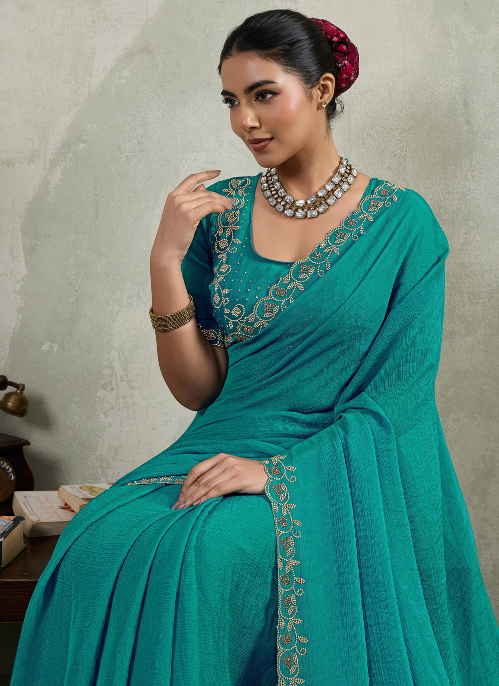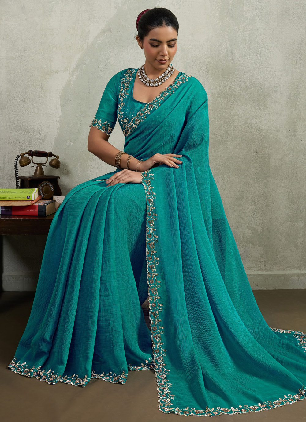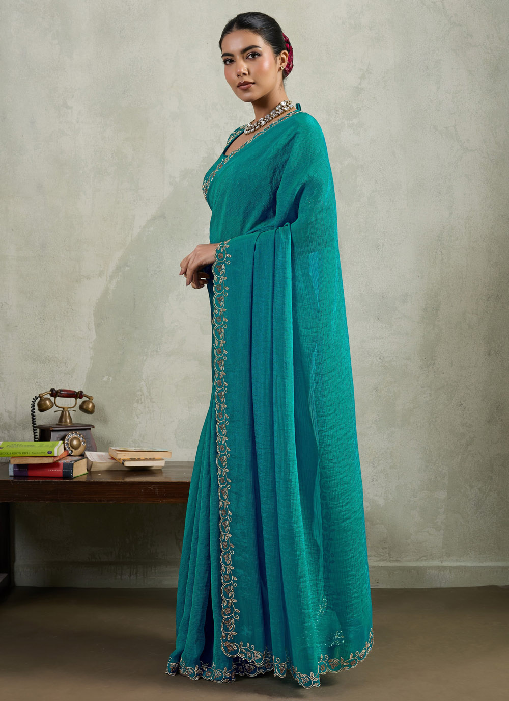 Designed for elegance, this Classic Sea Green Saree combines velvet chiffon fabric with fine zarkan work and cut work border detailing, ensuring a refined look for festivals and special celebrations. Comes with matching blouse.
