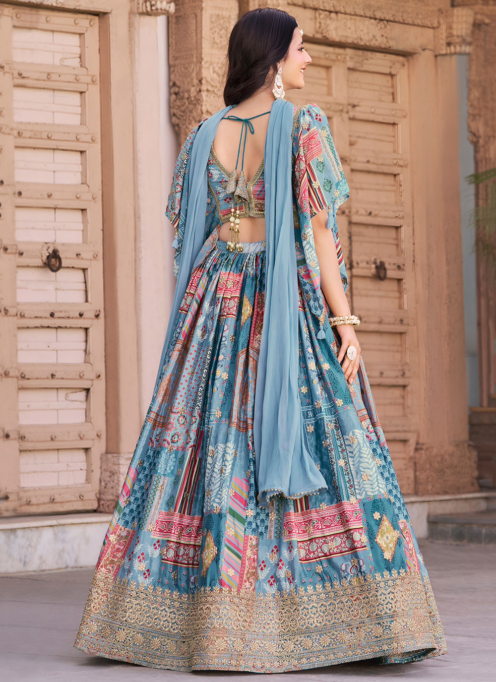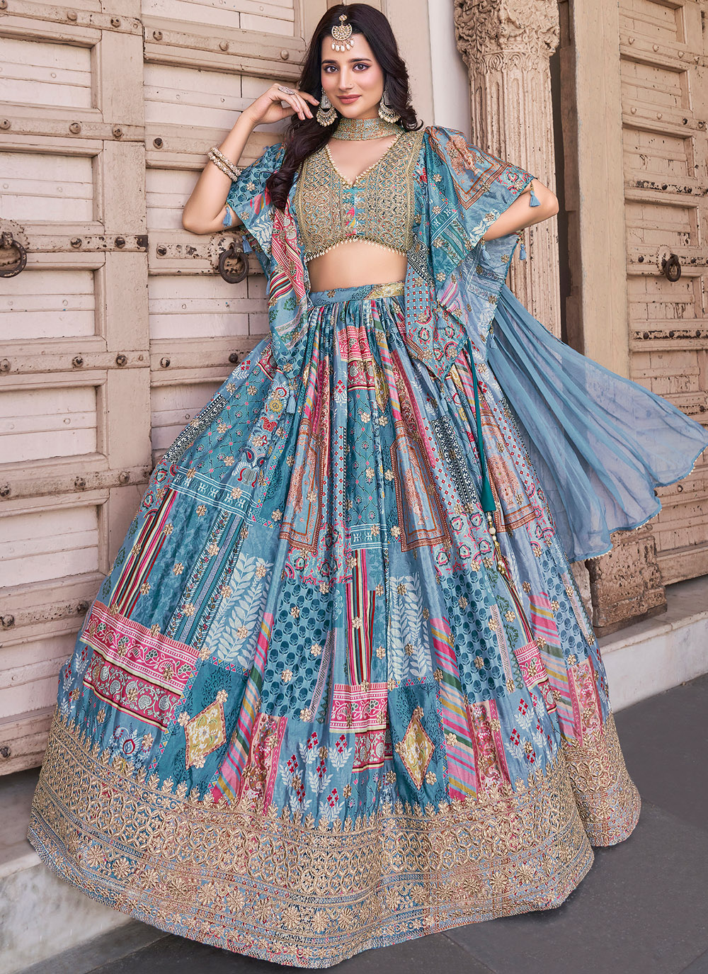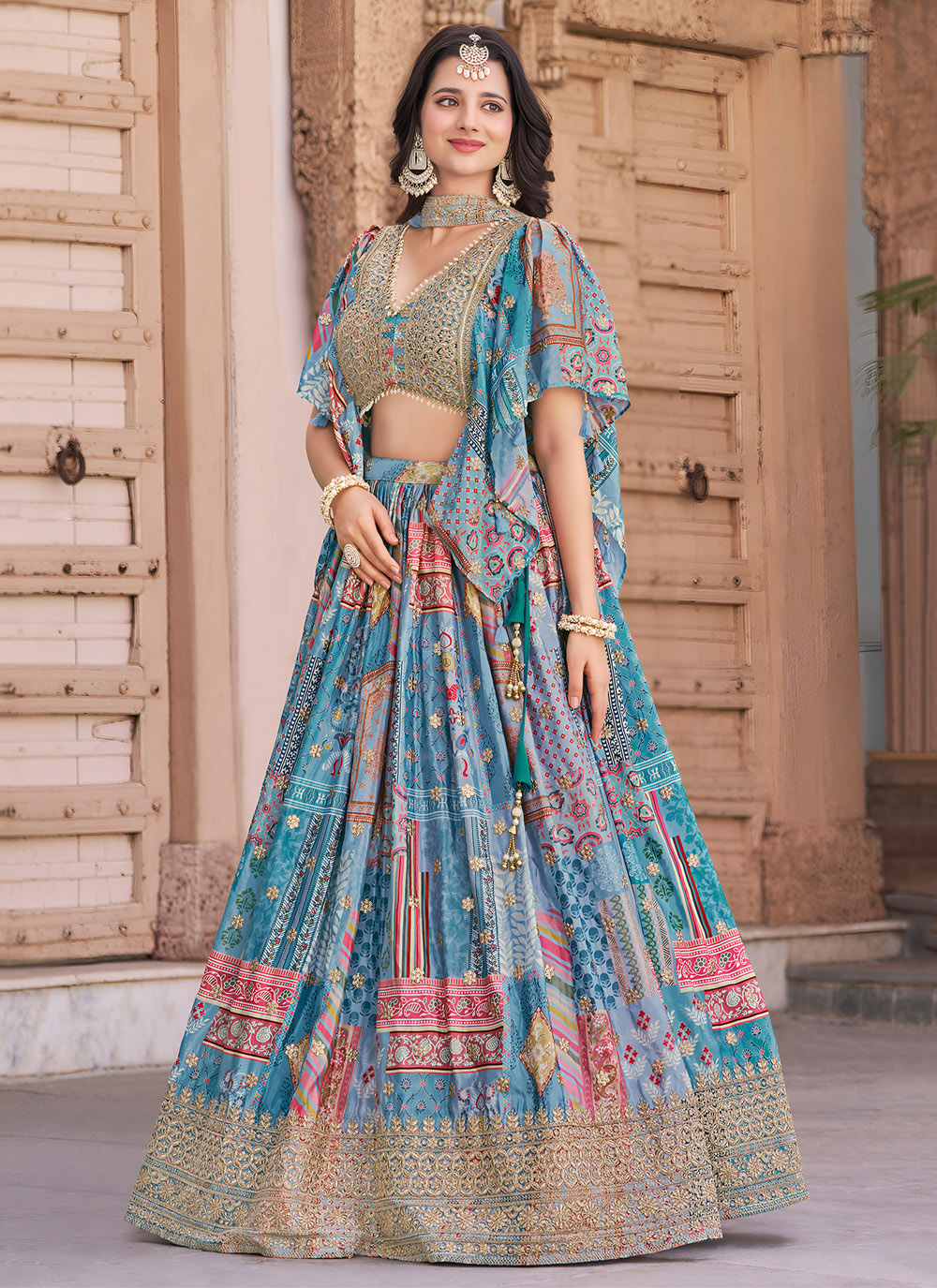 This Chinon aqua blue lehenga choli blends contemporary digital prints with classic zari craftsmanship, creating a visual symphony of design. Lightweight and vibrant, it’s a fashionable choice for haldi, mehndi or sangeet ceremonies. Comes with matching choli and dupatta.