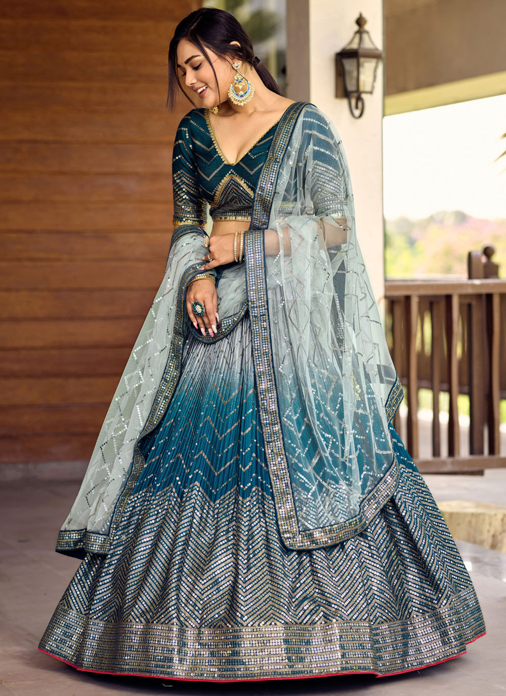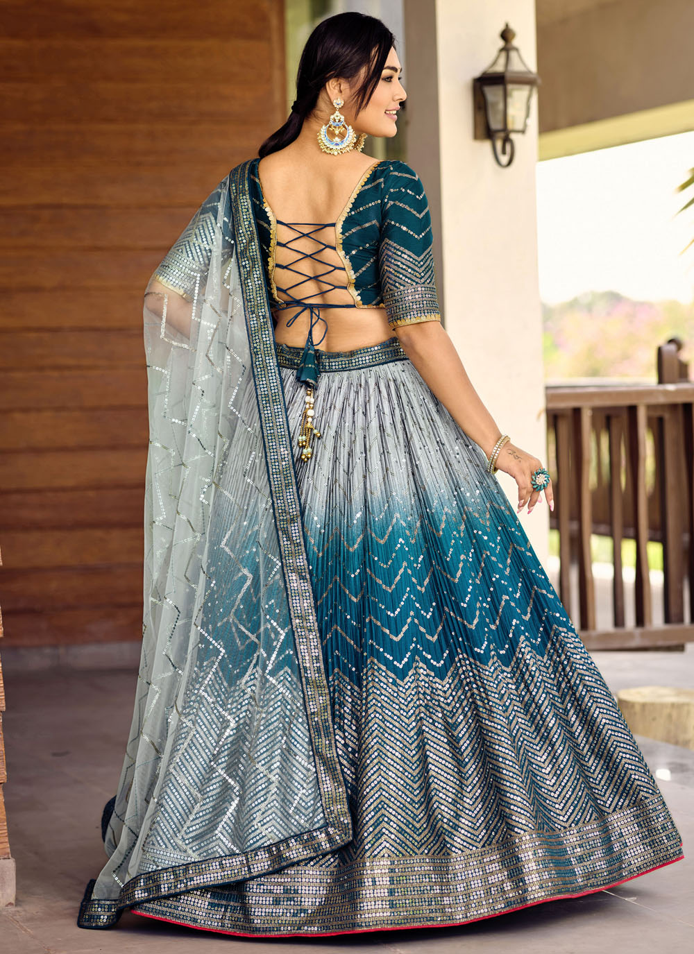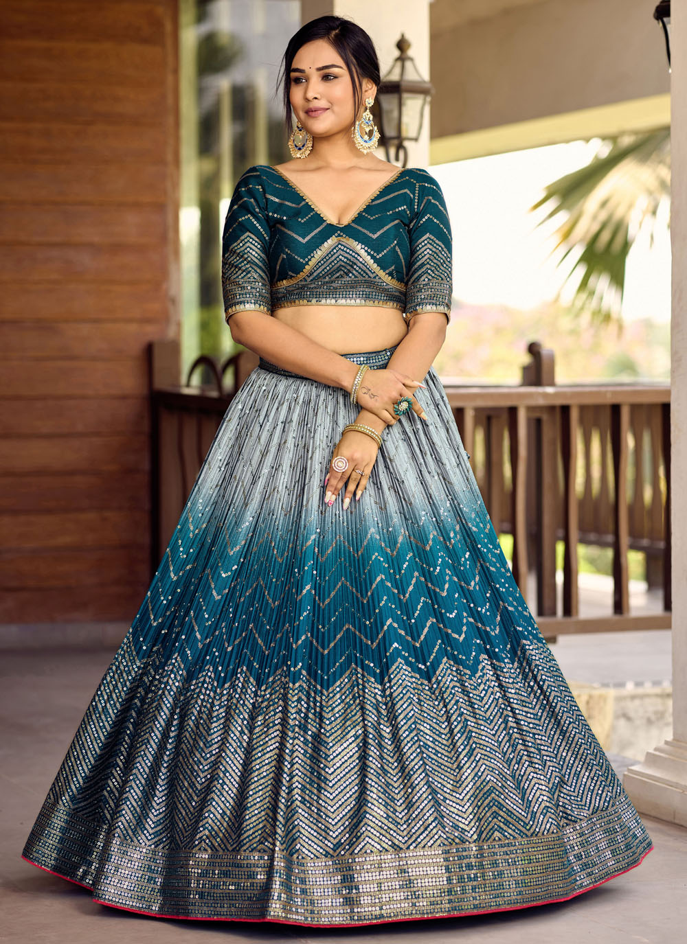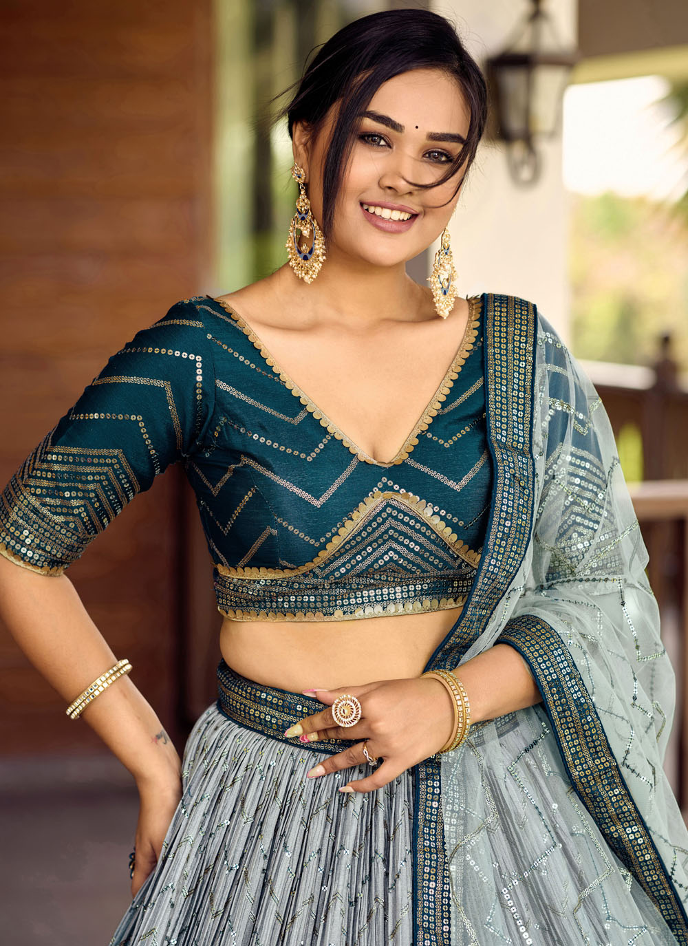 Designed for women who appreciate refined ethnic fashion, this blue sequins embroidered Chinon lehenga choli offers a perfect blend of tradition and contemporary style. Comes with matching choli and dupatta.