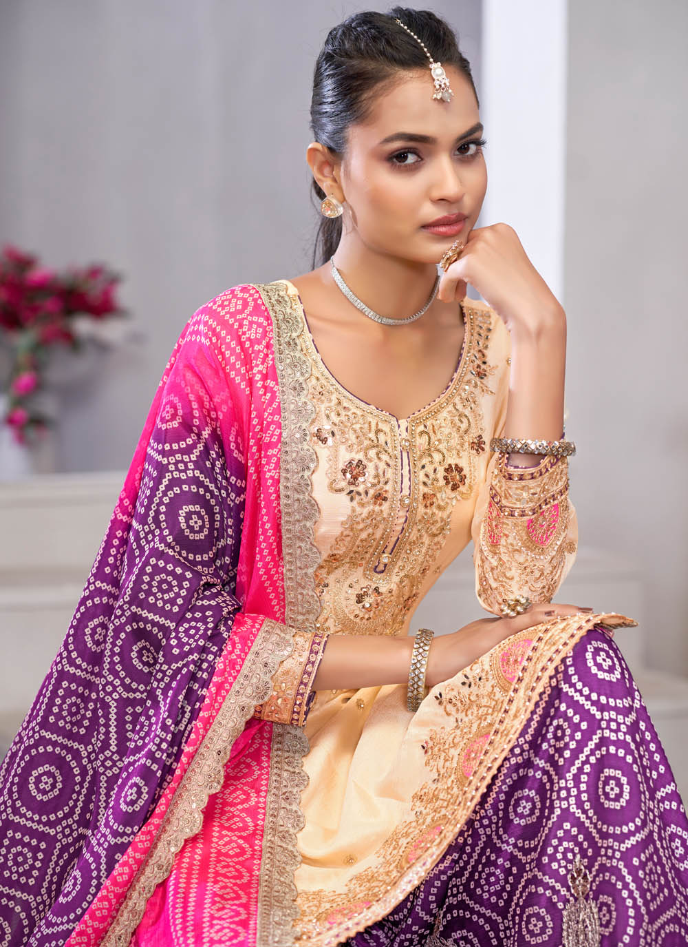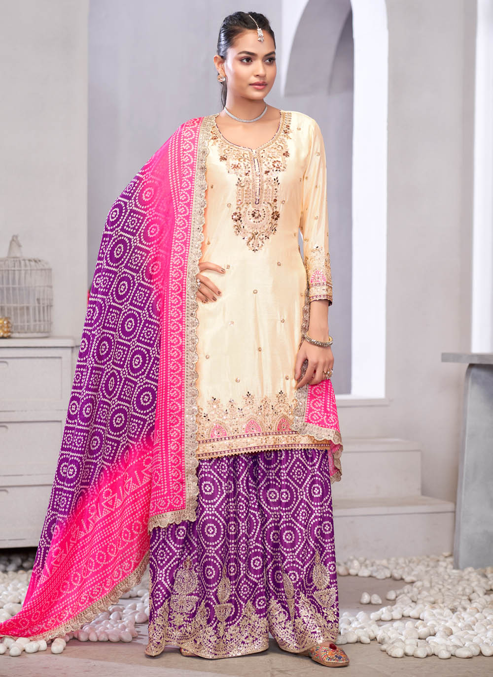 Step into sophistication with this Embroidered Cream Chinon Palazzo Suit, a blend of classic tradition and modern appeal. The rich fabric drapes beautifully, while the delicate embroidery adds depth and detail to its design. Comes with matching bottom and dupatta.