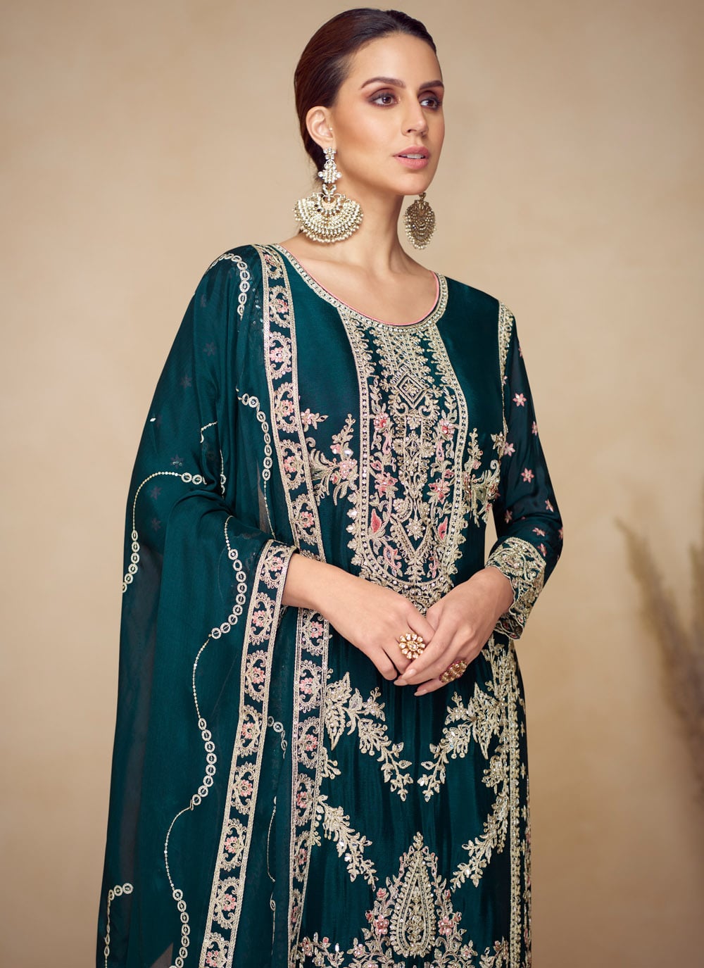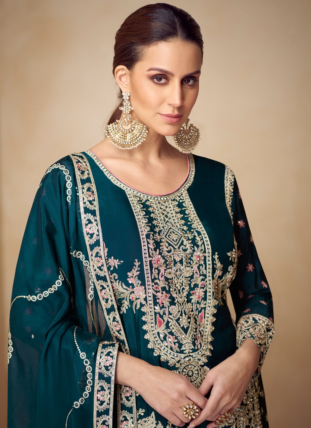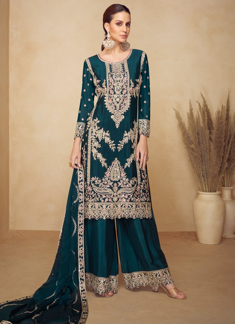 This readymade teal palazzo suit combines modern trends with traditional elegance. The chinon fabric ensures a graceful drape, while delicate embroidery elevates the overall look, making it a chic choice for semi-formal occasions and celebrations. Comes with matching bottom and dupatta.