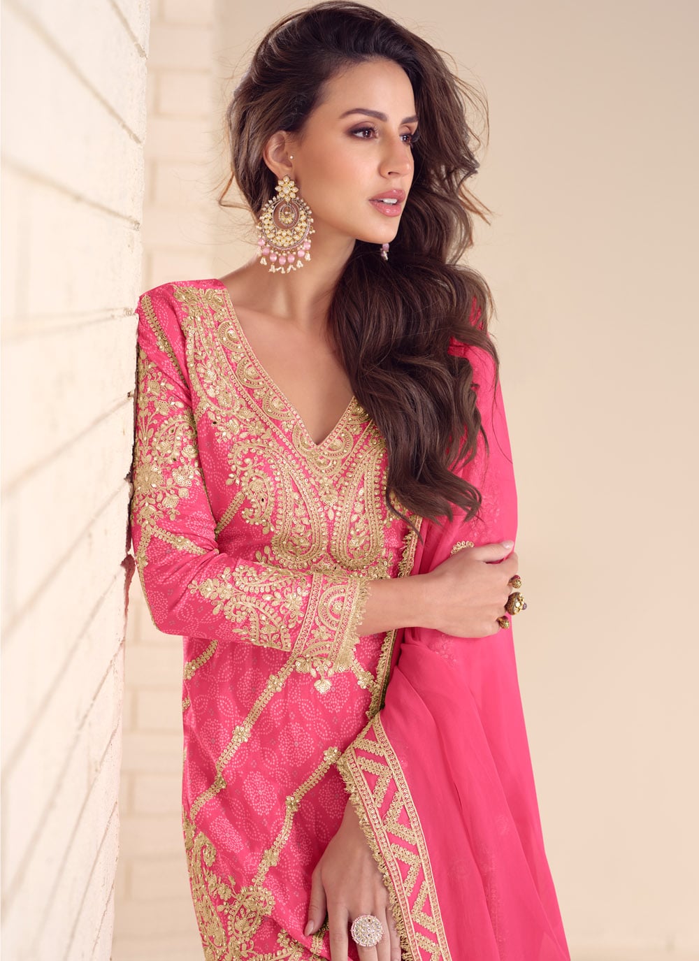 Make a lasting impression with this Chinon Pink Salwar Kameez, featuring a stunning mix of embroidered motifs, sequin shimmer, zari craftsmanship and digital prints. Perfect for ceremonies, festive wear and stylish celebrations. Comes with matching bottom and dupatta.