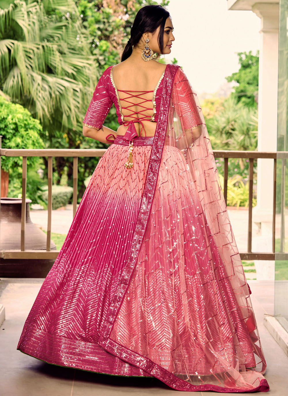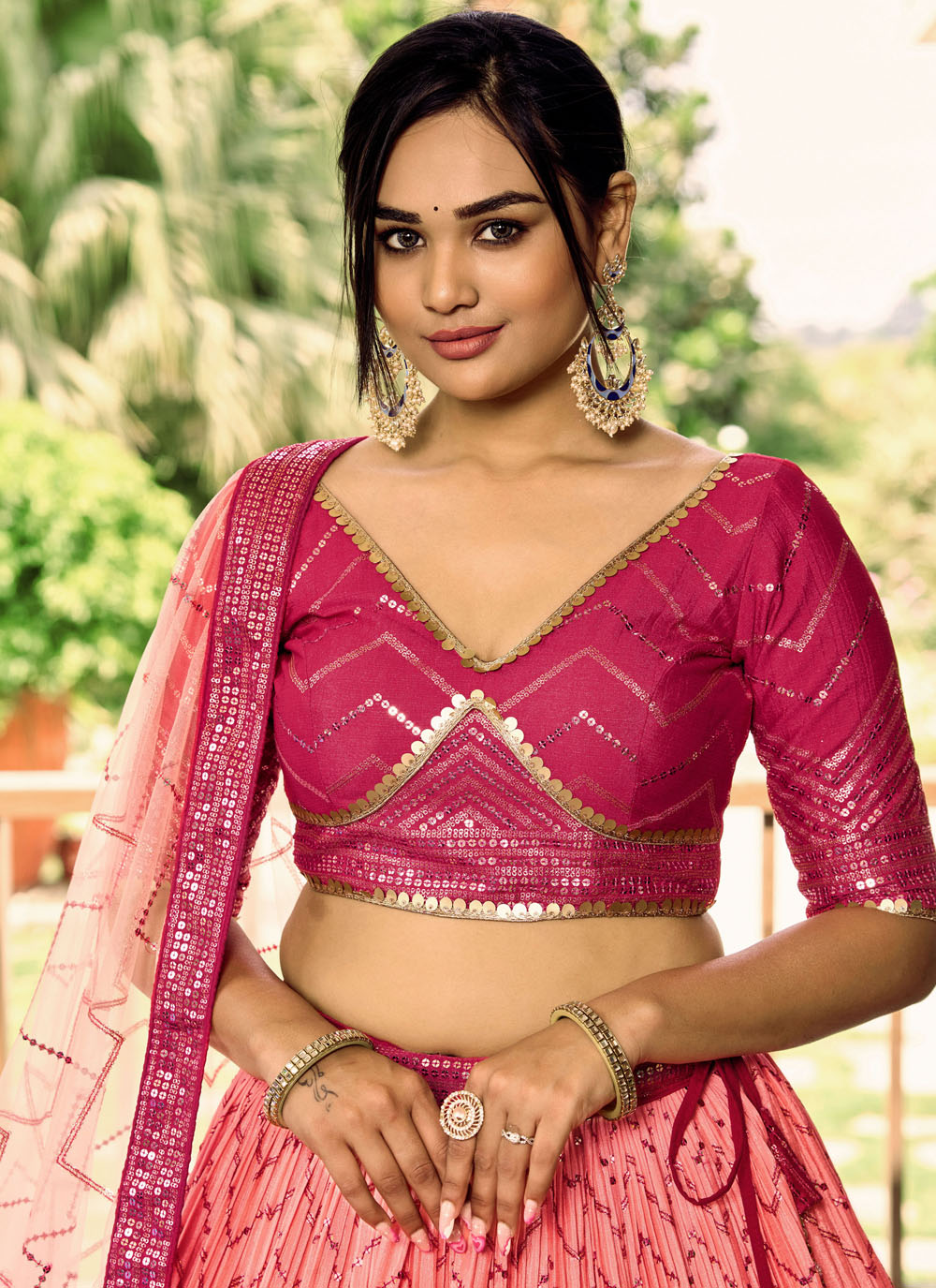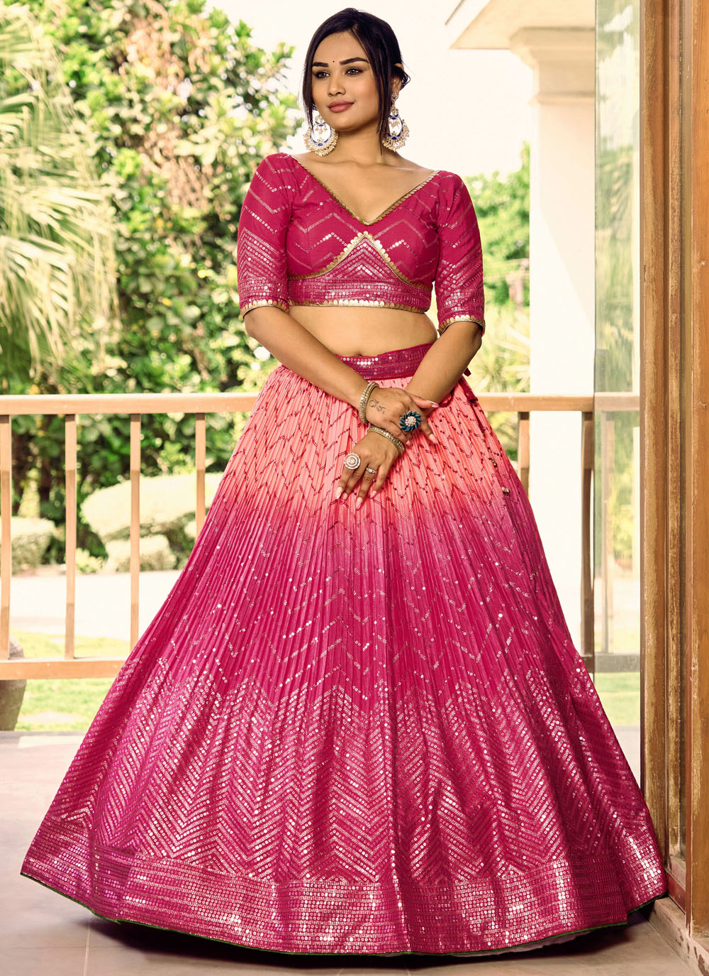 Crafted for women who appreciate modern ethnic fashion, this pink sequins embroidered Chinon A line lehenga choli offers timeless elegance. The intricate embroidery and stylish design create a beautiful ethnic look. Comes with matching choli and dupatta.