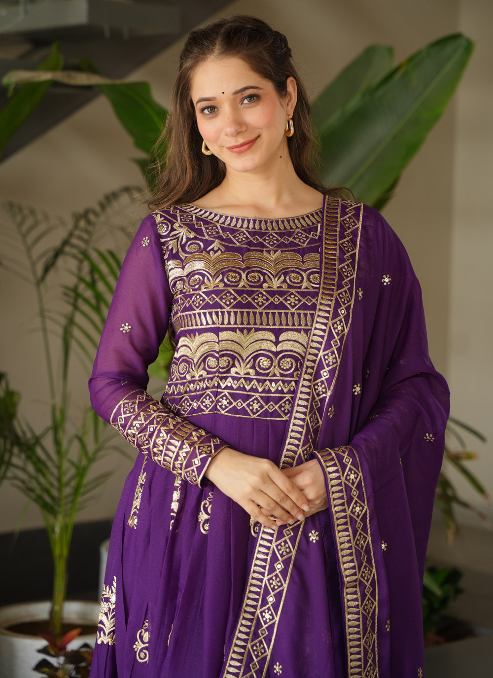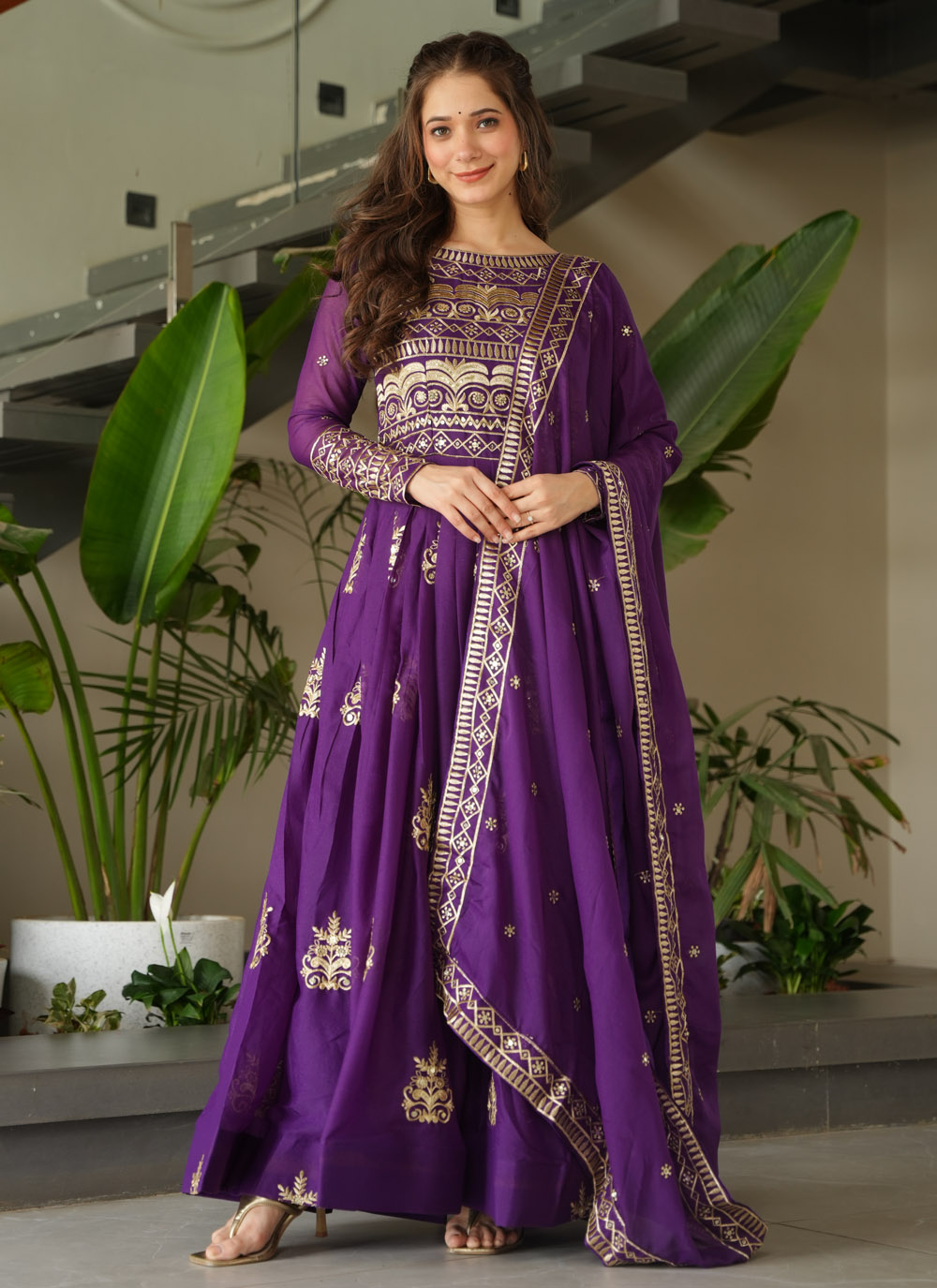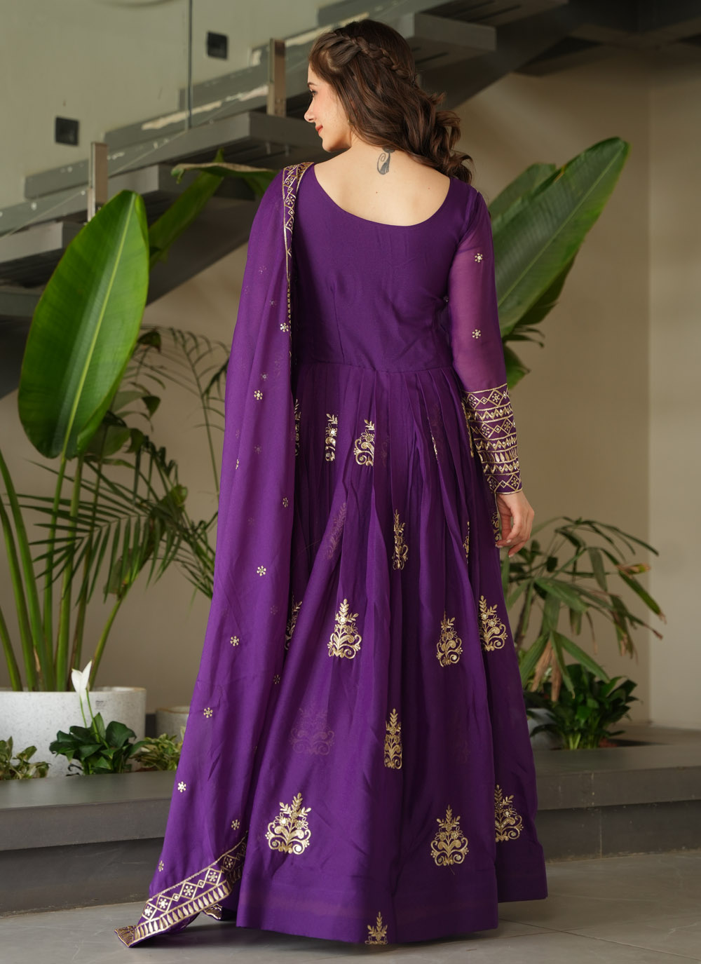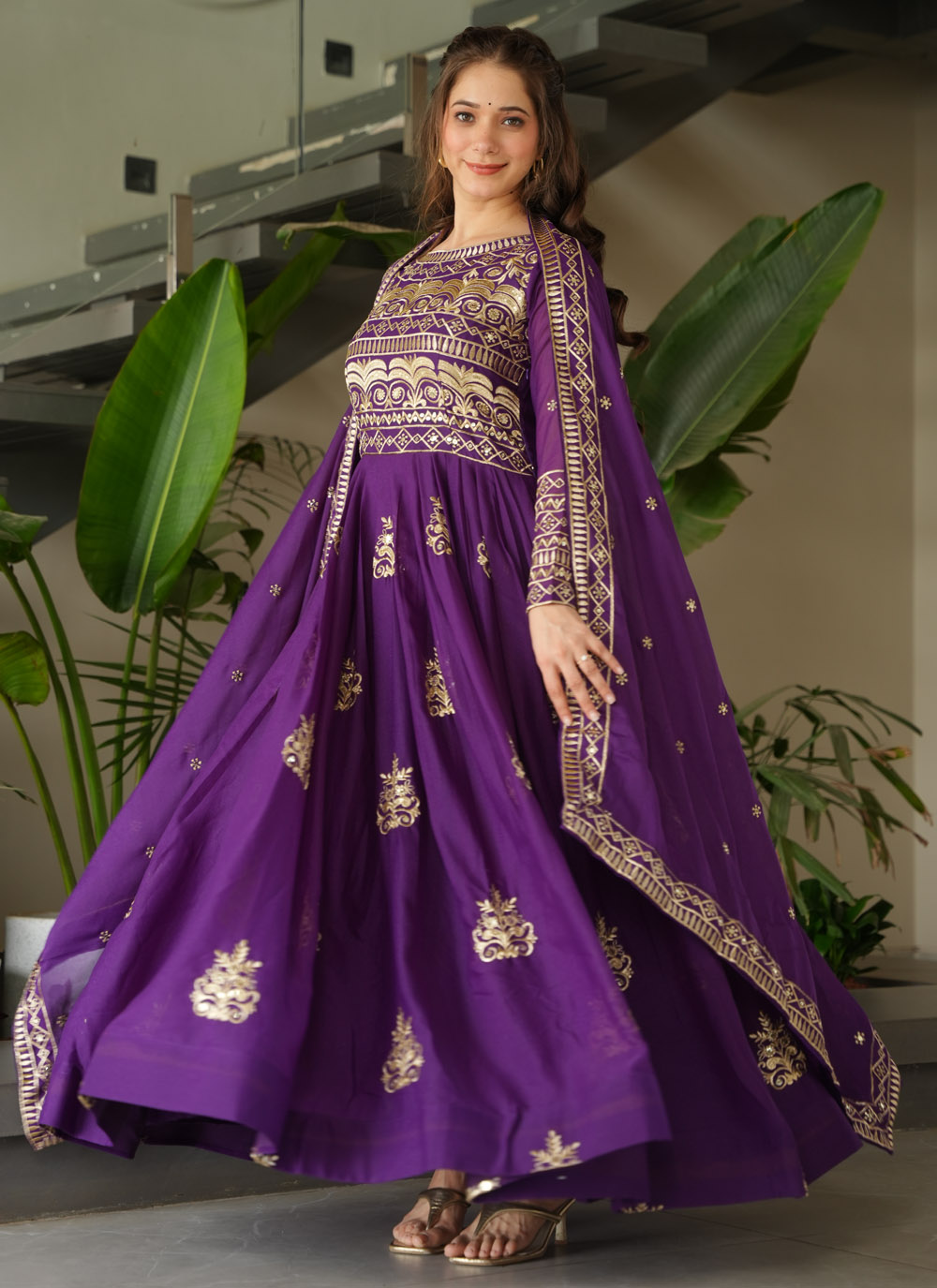 Celebrate tradition with a modern twist in this purple Chinon designer gown. The ensemble is richly adorned with multi-color embroidery and shimmering sequin accents, making it the perfect choice for weddings, receptions or festivals. Comes with matching dupatta.