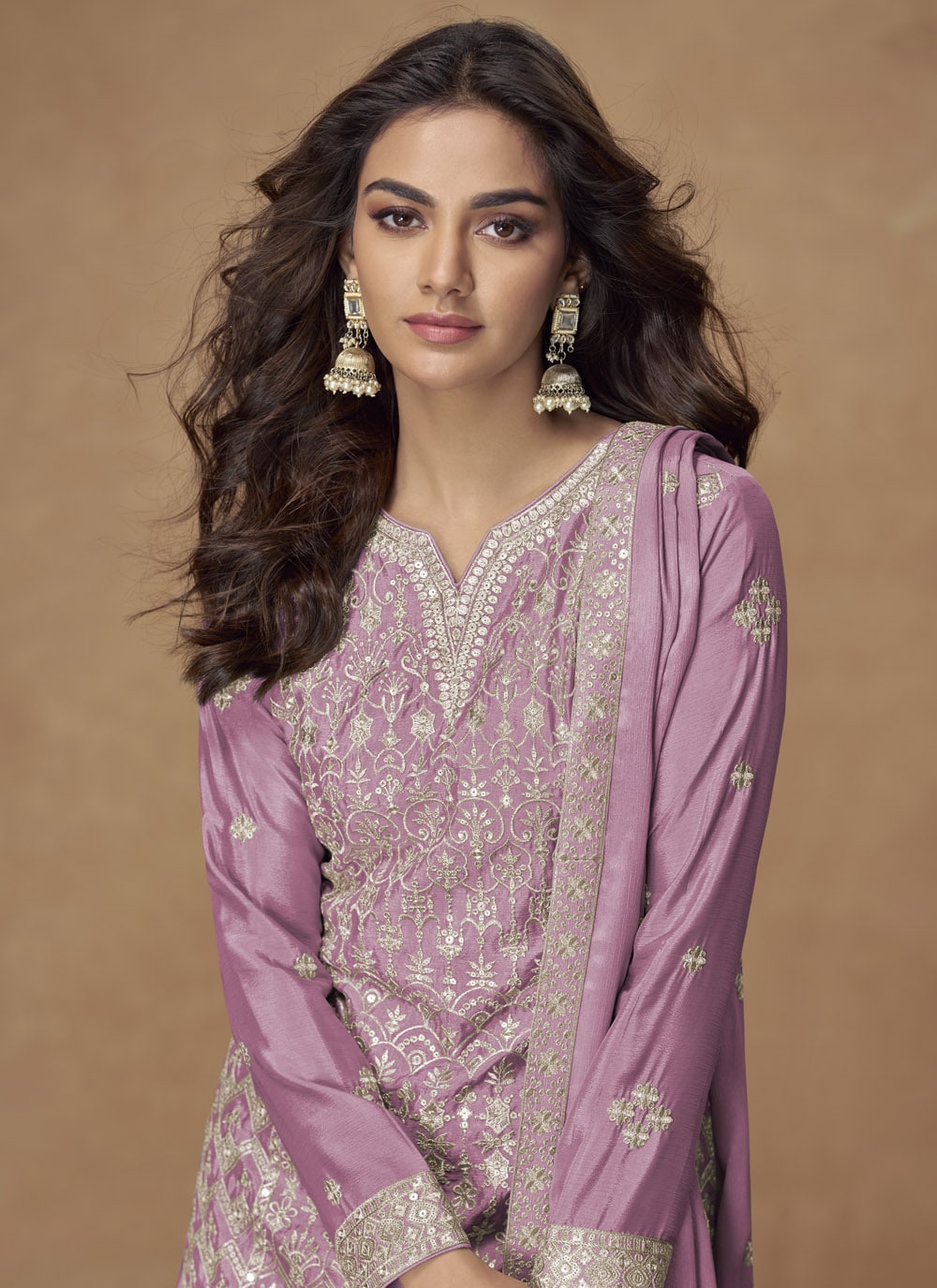 Make an unforgettable impression in this Chinon palazzo suit in a striking purple shade, highlighted by traditional zari embroidery. The comfortable fabric and flowing cut ensure ease of movement while adding a regal touch to your ethnic wardrobe. Comes with matching bottom and dupatta.
