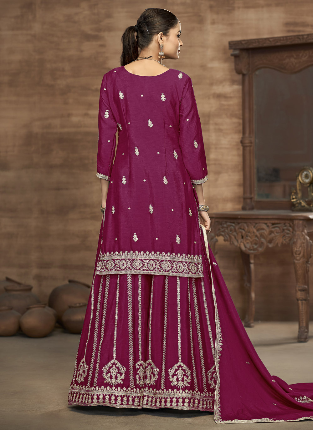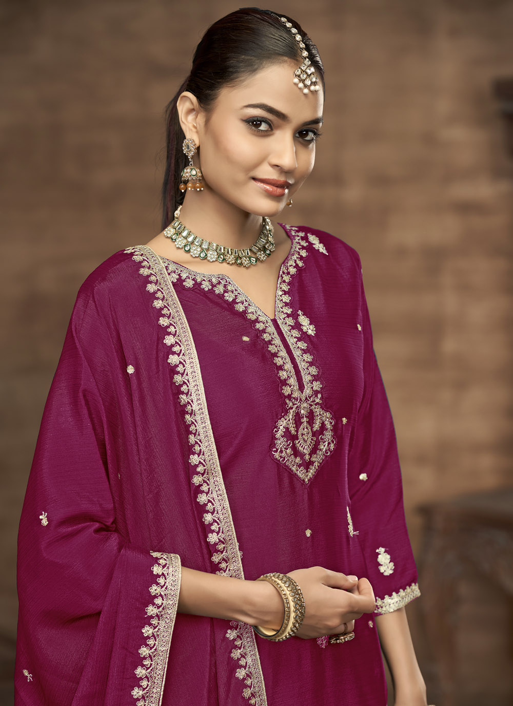 Grace any festive occasion in style with this Rani color chinon salwar suit, beautifully adorned with intricate zari work and sparkling sequins embroidery. Perfect for weddings, parties, and grand celebrations. Comes with matching bottom and dupatta.
