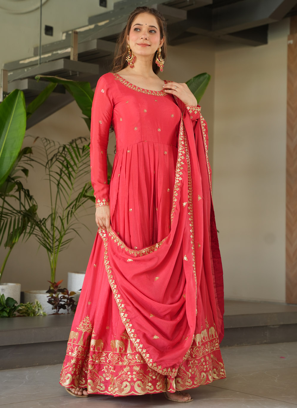 This Chinon sequin embroidered gown in a peach hue is a sophisticated pick for any celebration. The gown is beautifully embellished with delicate sequin embroidery, giving it a subtle shimmer ideal for festive and formal occasions. Comes with matching dupatta.