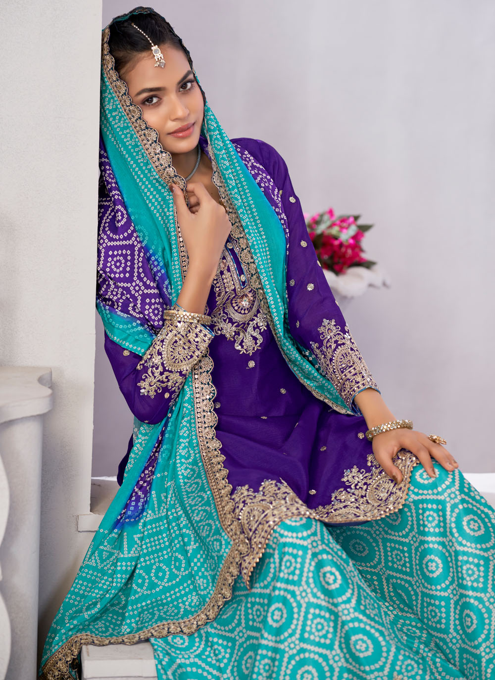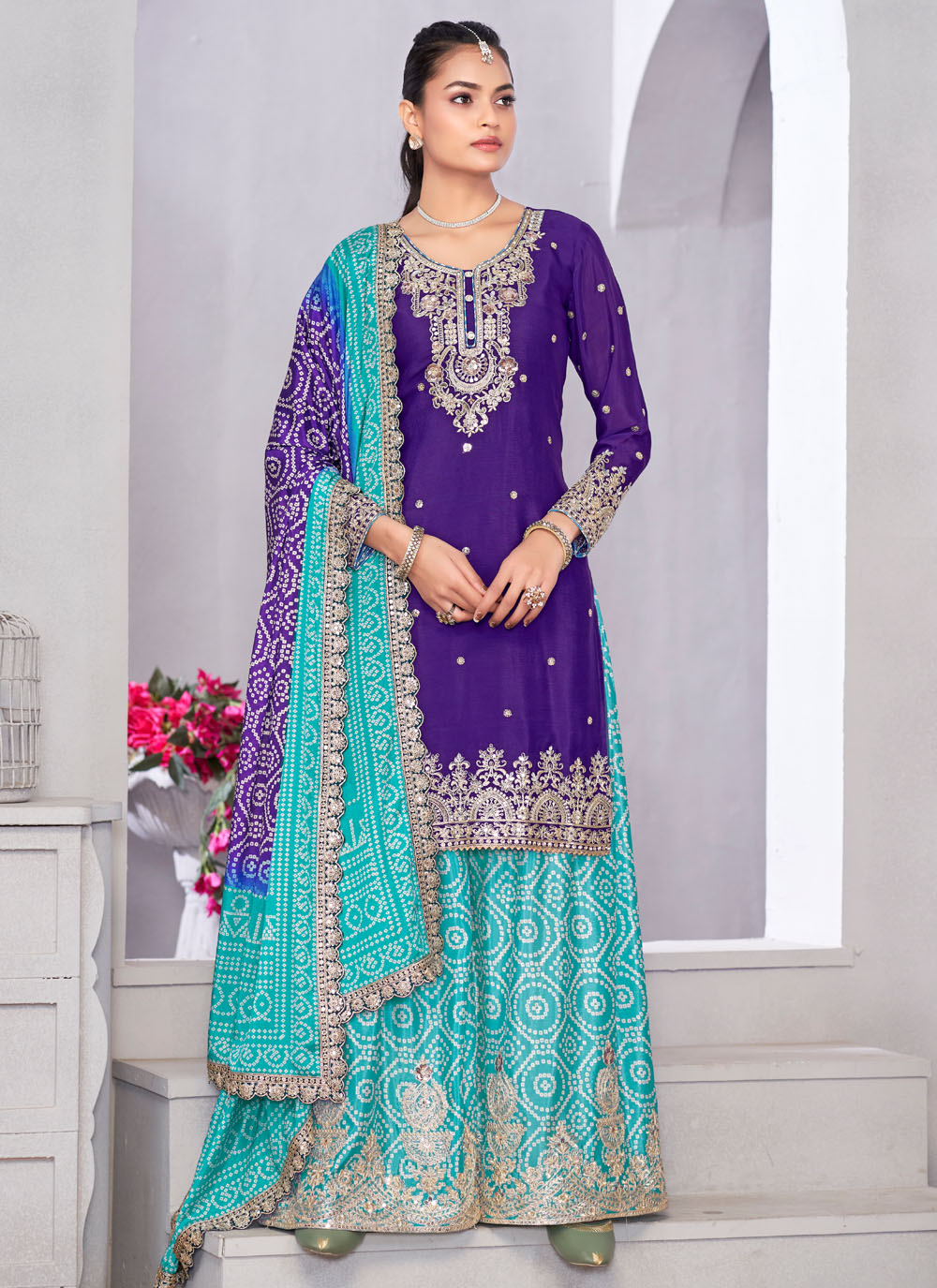Celebrate in style with this Chinon Violet Salwar Kameez, featuring exquisite mirror, zari, and sequins embroidery. The fabric’s natural sheen complements the embellishments, making it a striking outfit for weddings, festive dinners and traditional functions. Comes with matching bottom and dupatta.