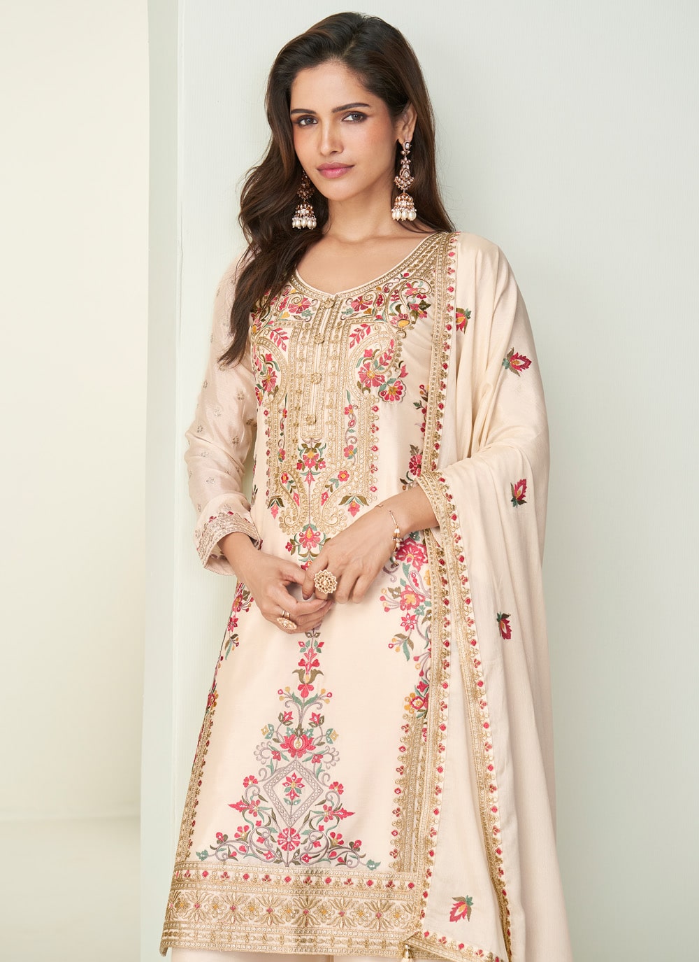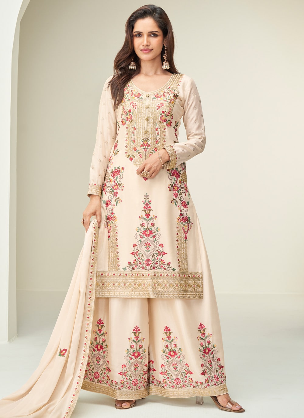 Grace your festive wardrobe with this cream Chinon silk salwar kameez, beautifully enhanced with thread embroidery. The pastel tone gives a classy, serene vibe. ideal for women who prefer understated elegance with a designer touch. Comes with matching bottom and dupatta.