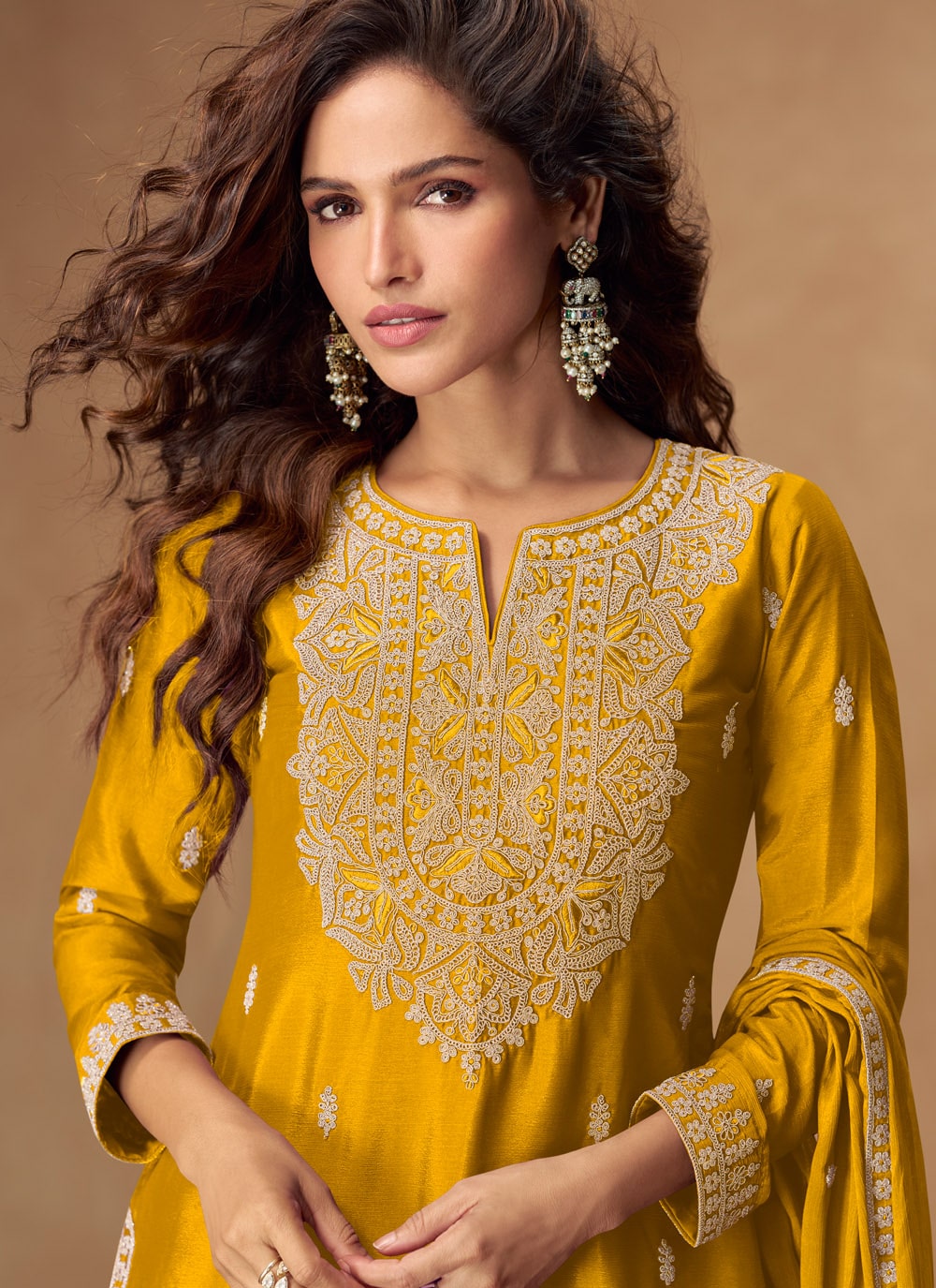 Bright and graceful, this mustard chinon silk palazzo salwar suit is the perfect choice for women who love a mix of comfort and style. The intricate embroidery adds a festive richness to the outfit, while the flowy palazzo design brings in a modern, effortless vibe. Comes with matching bottom and dupatta.