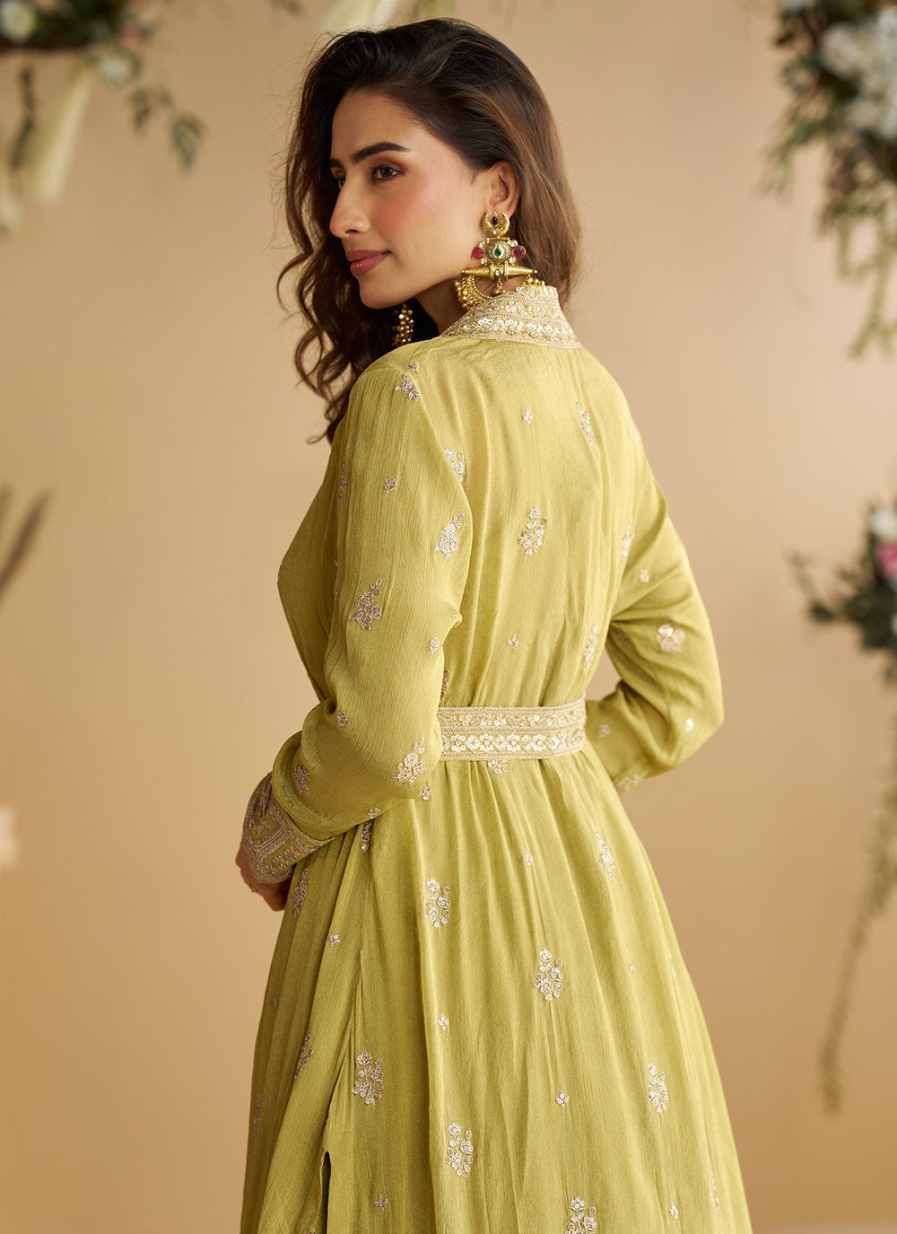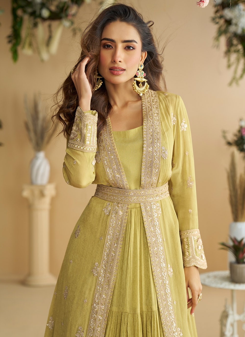 This green designer wedding gown in Chinon silk exudes elegance with elaborate sequins and zari embellishments, ideal for bridal functions and ceremonial events.