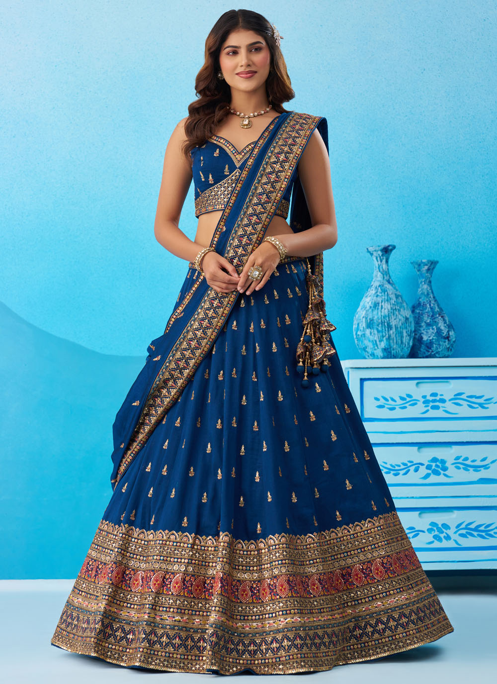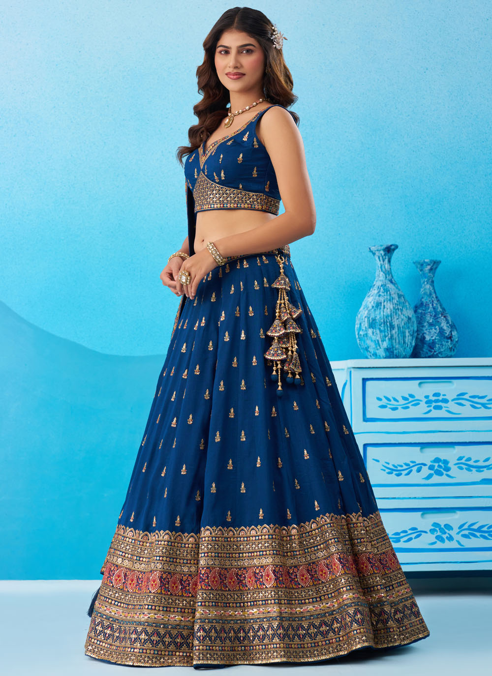 Step into celebration with the Chinon Teal Thread Sequins Embroidered Designer Lehenga Choli. The detailed embroidery work highlights the beauty of the premium chinon fabric, while the sequins add a subtle shine that catches the light beautifully. Comes with matching choli and dupatta.