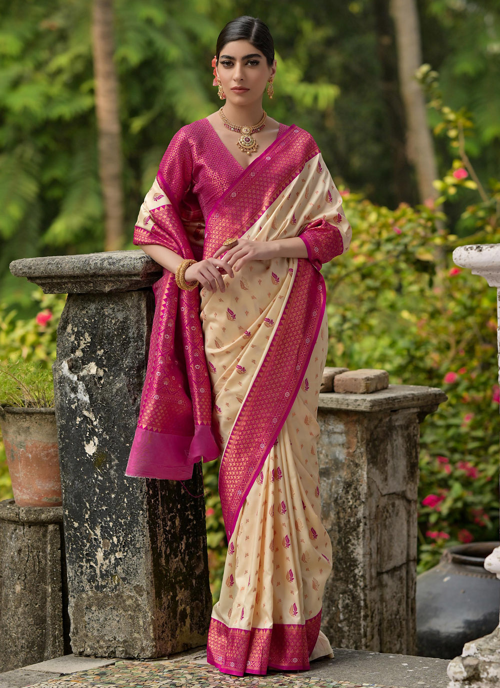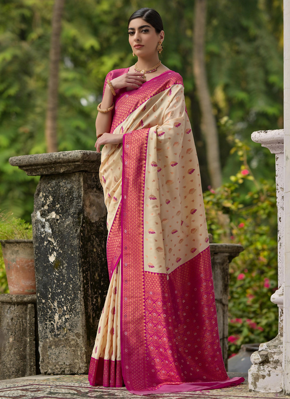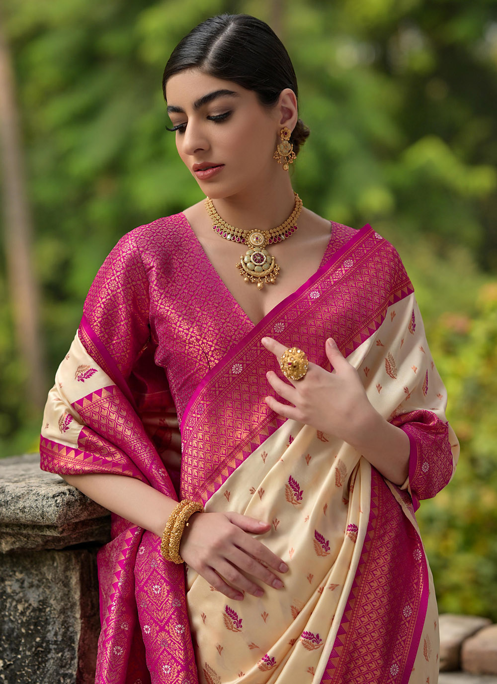 The Classic Banarasi Silk Cream Woven Designer Saree is a fusion of tradition and luxury. Its rich silk fabric, enhanced with exquisite woven zari details, offers a refined look that never goes out of style. The soft cream color adds a touch of understated elegance, making this saree a perfect choice for weddings, receptions, or festive celebrations. Comes with matching blouse.