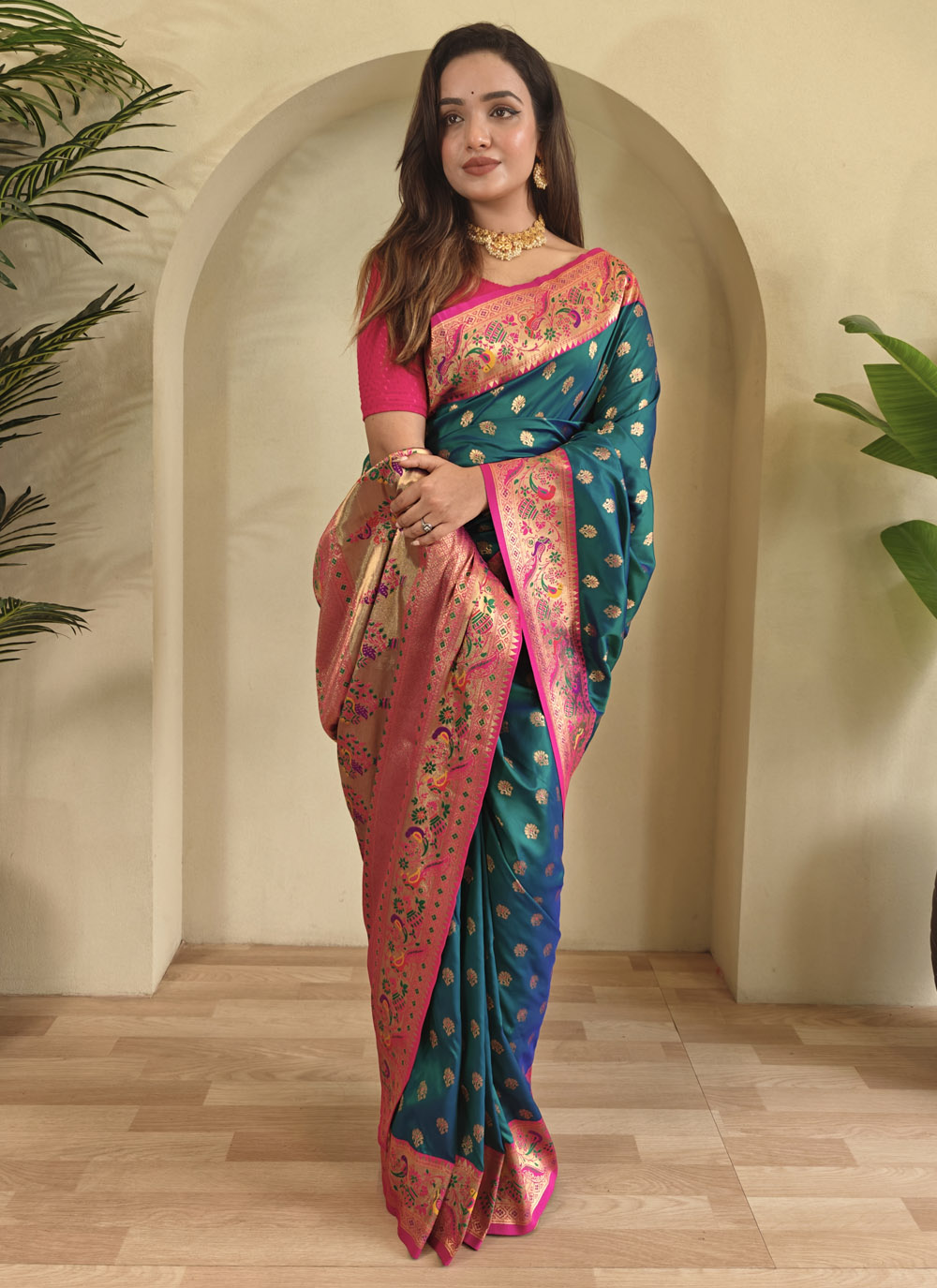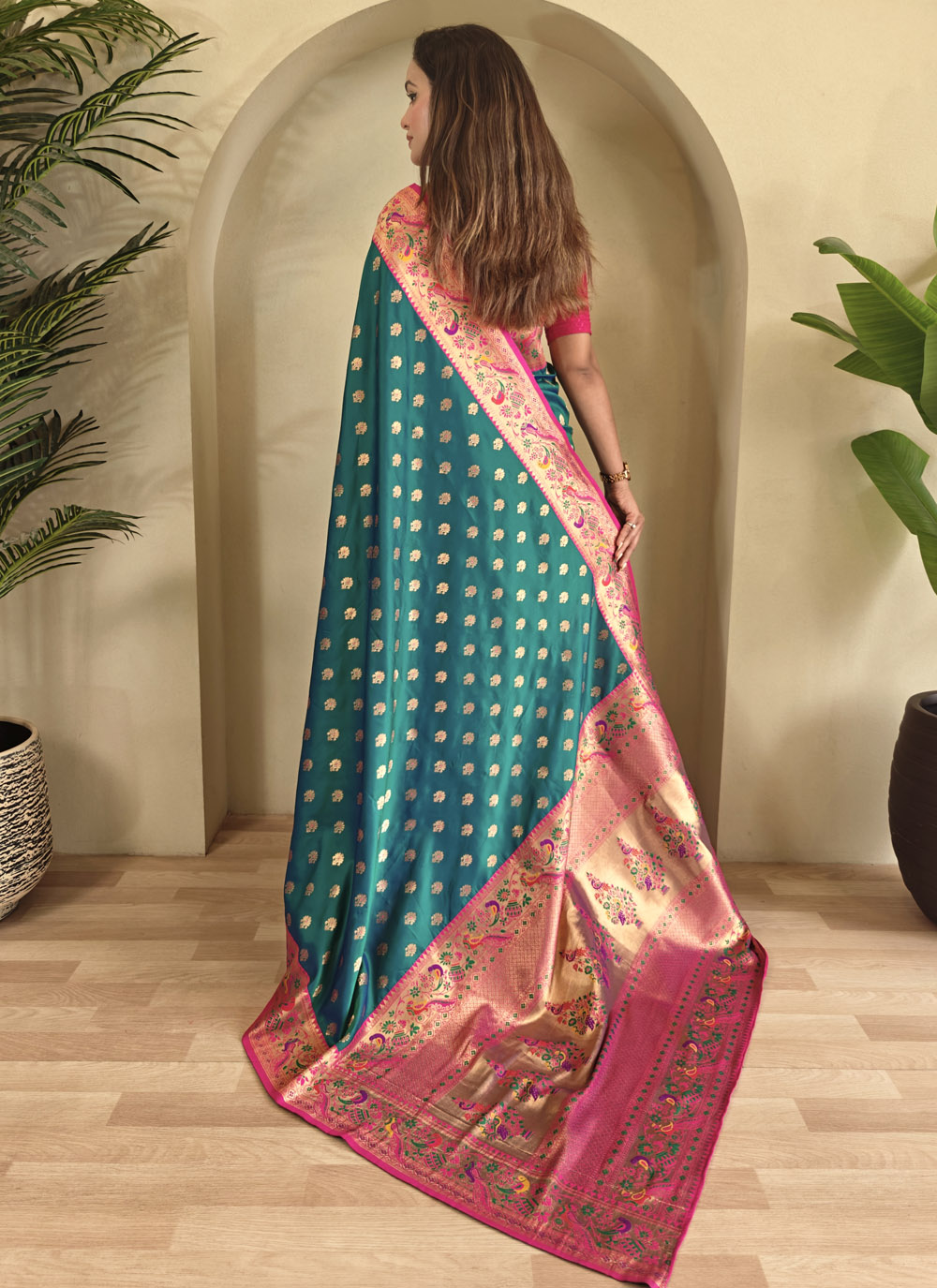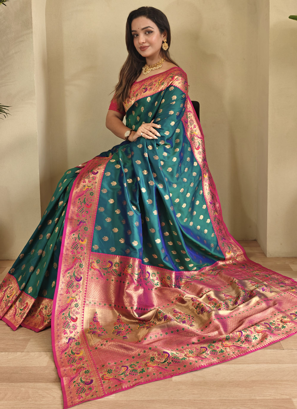 Make a graceful impression with this teal-colored silk saree, intricately woven with traditional zari motifs. Whether it's a wedding reception or a festive celebration, this drape adds a regal touch to your ethnic wardrobe. Comes with matching blouse.