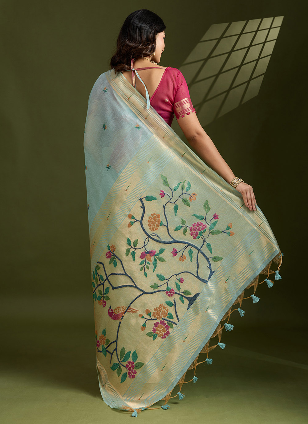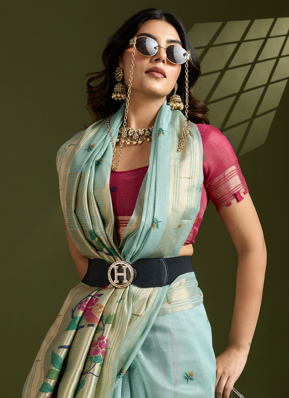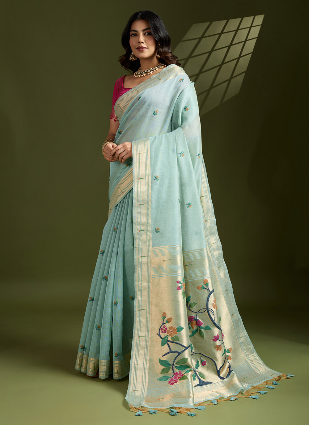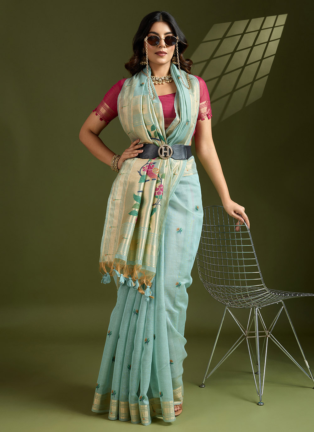 This classic aqua blue saree is crafted in breathable cotton and adorned with exquisite resham and zari weaving along the borders and pallu. The serene hue and refined details create a sophisticated ensemble perfect for festive occasions and celebrations. Comes with matching blouse.