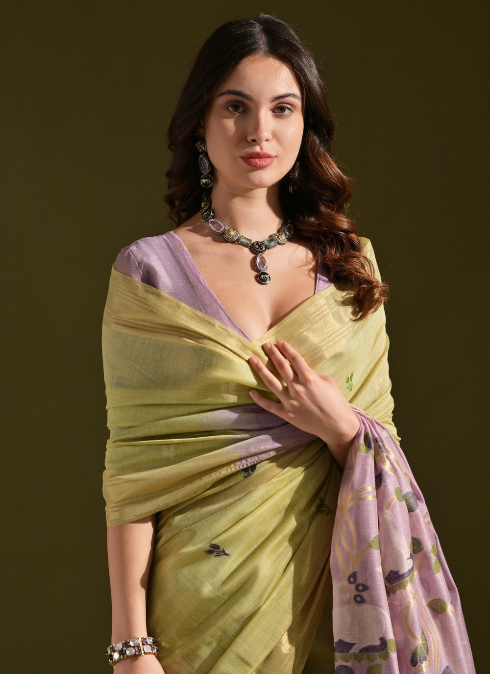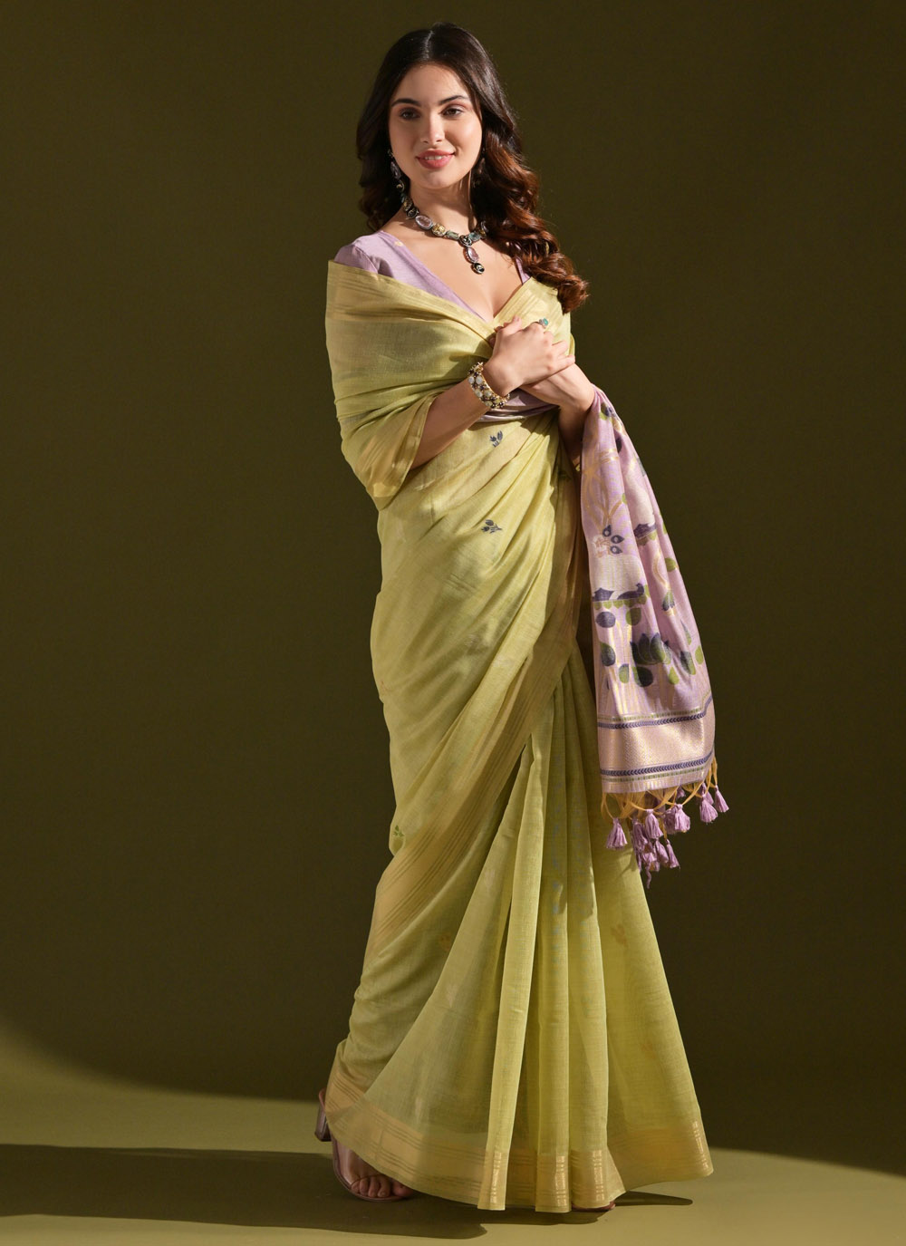 Celebrate every moment in timeless style with this Cotton Green Woven Festival Saree. The rich green tone, enhanced with traditional woven patterns, adds a vibrant charm perfect for festive occasions. Light, breathable and effortlessly graceful. Comes with matching blouse.