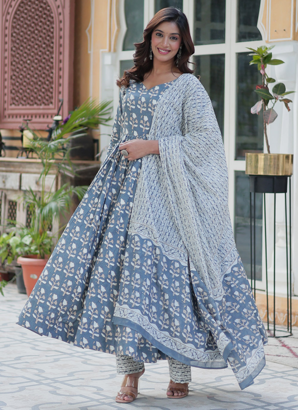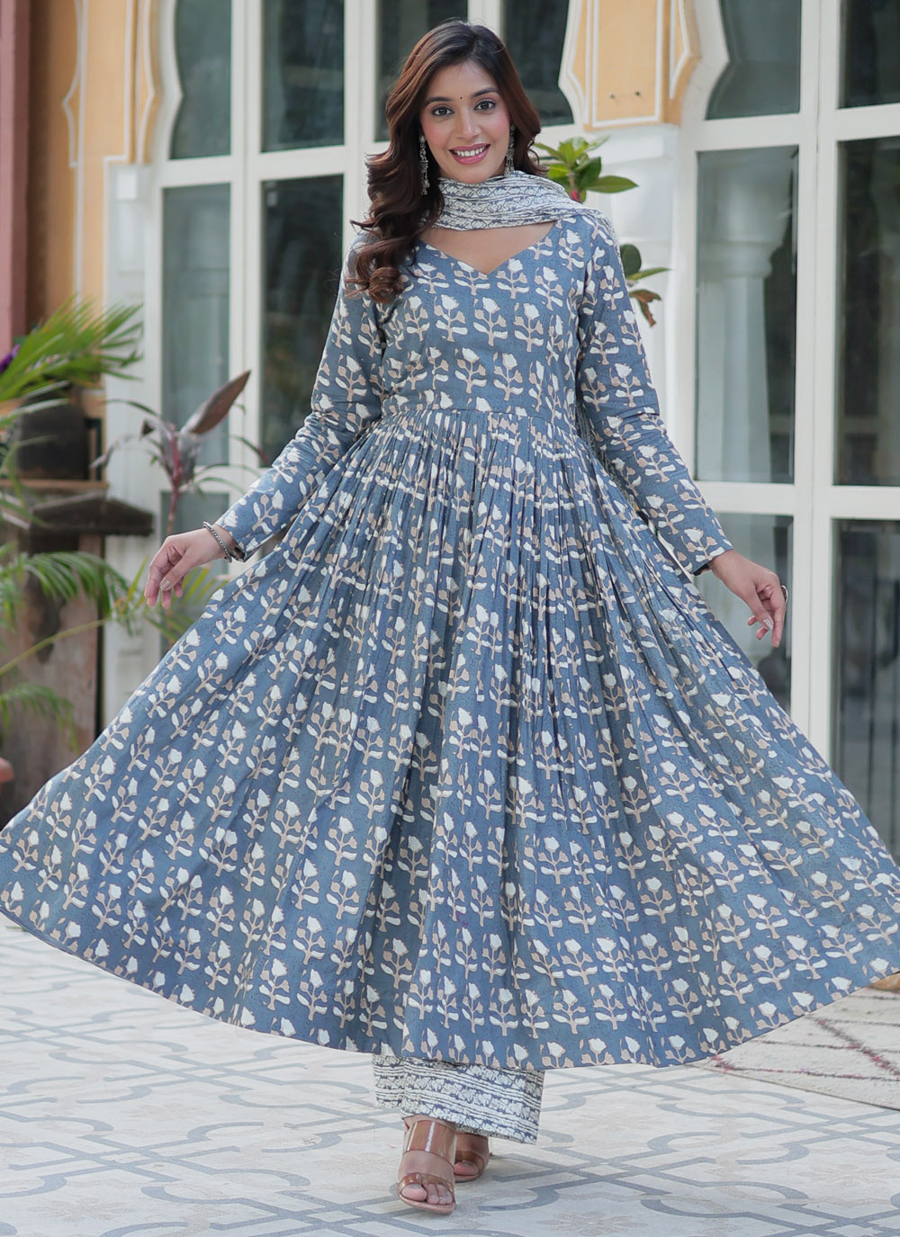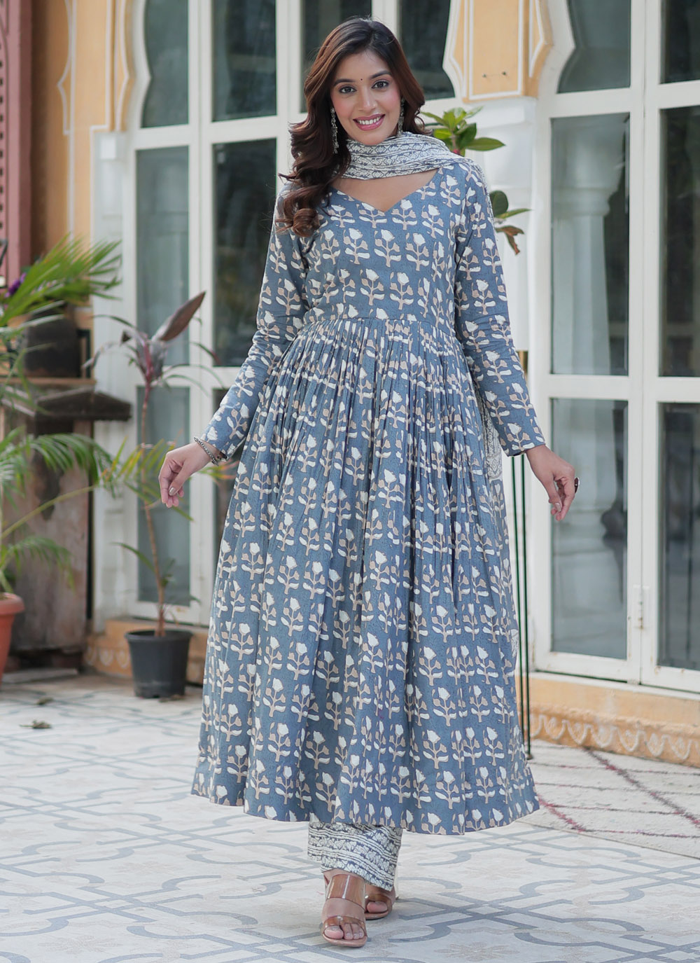 Upgrade your ethnic wardrobe with this Cotton Grey Printed Readymade Salwar Kameez. Featuring a beautiful blend of traditional charm and modern appeal, this set comes in a flattering fit with elegant printed motifs. Ideal for daily wear, casual functions, or a relaxed festive gathering. Comes with matching bottom and dupatta.