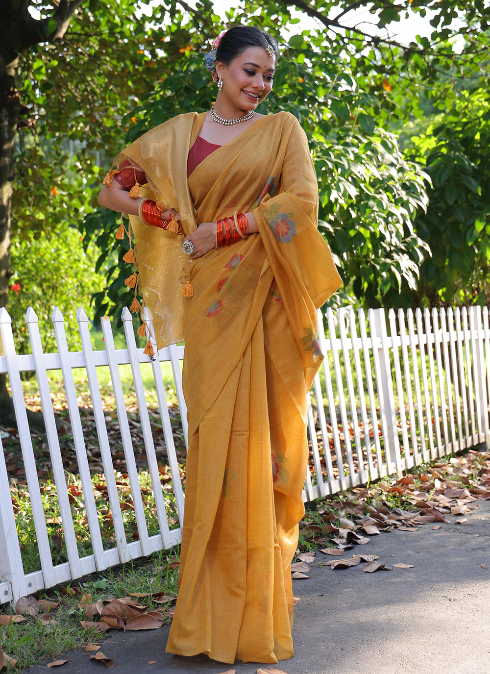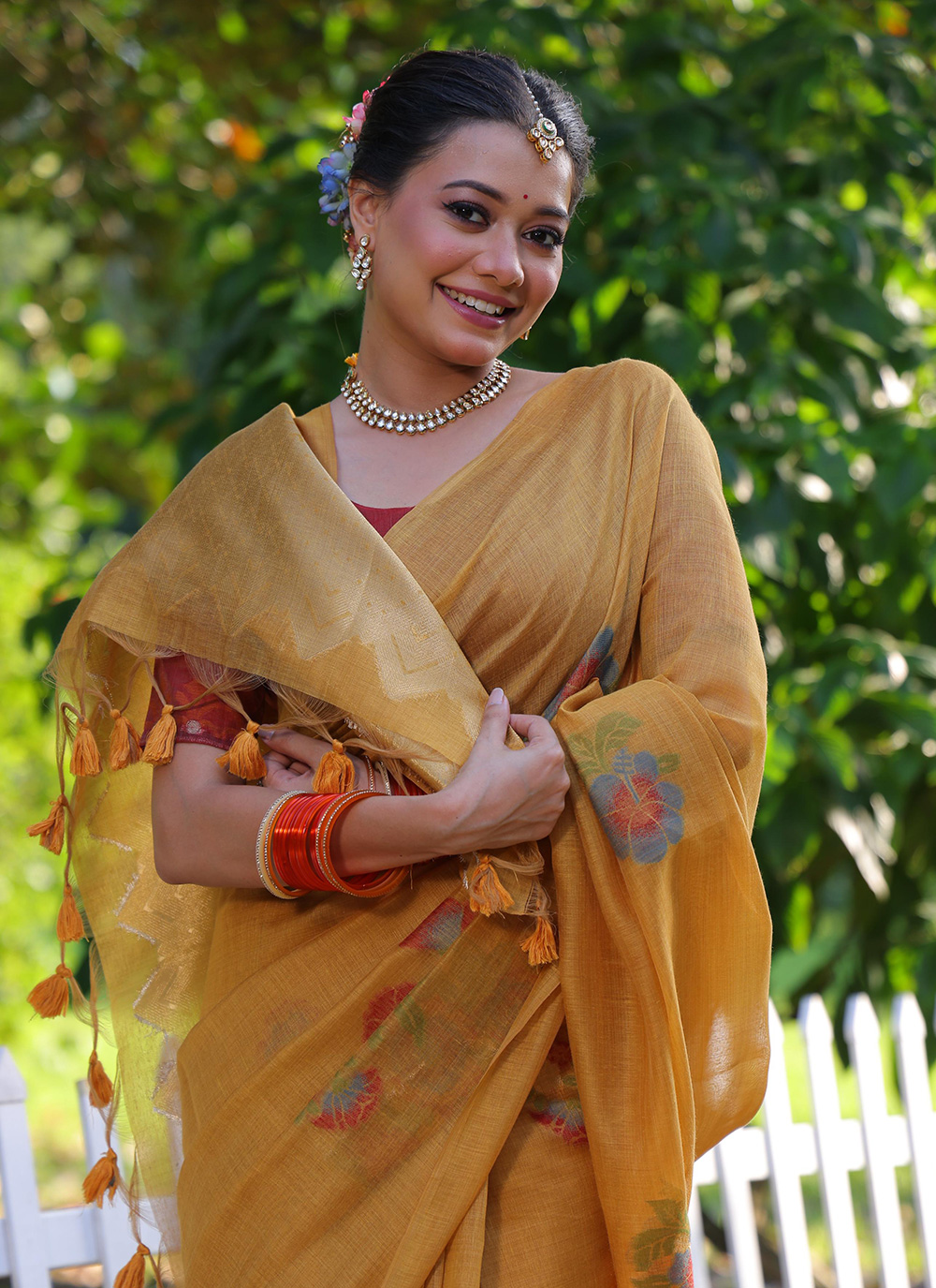 The Cotton Printed Casual Saree in Mustard is a beautiful blend of comfort and style. Featuring vibrant prints on soft cotton fabric, this saree is perfect for casual occasions. It comes with a matching blouse, ensuring a complete and elegant look for everyday wear.