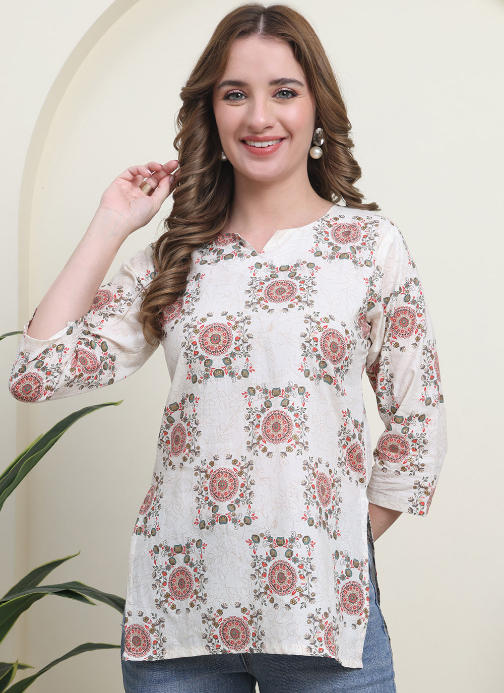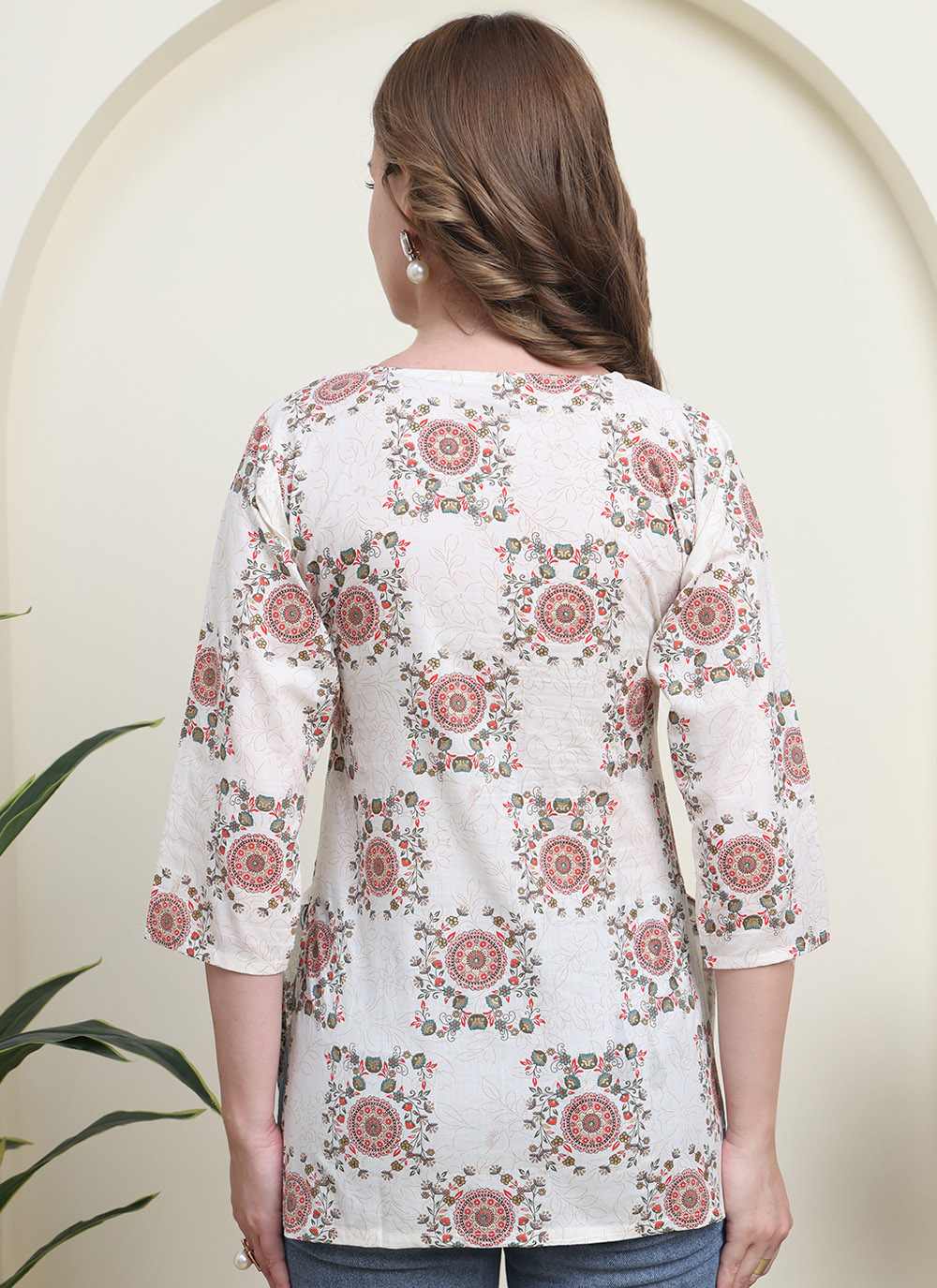 Add subtle style to your wardrobe with this cotton printed off white kurti. The designer print work brings a graceful touch, while the breathable cotton fabric ensures all-day comfort for regular and casual wear.