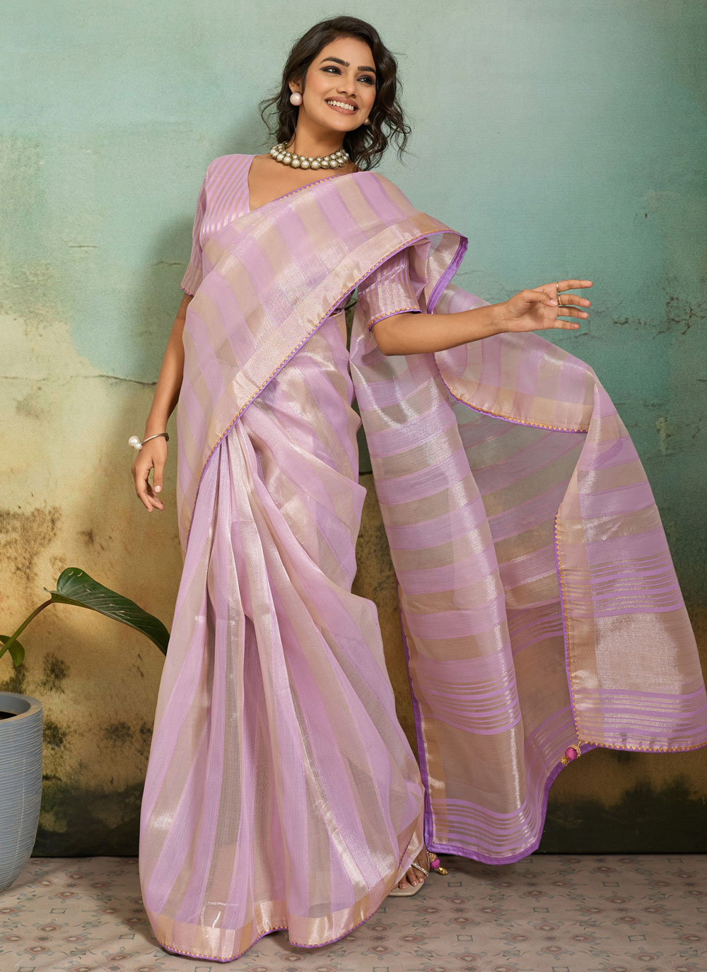 Designed with simplicity and sophistication, this lavender cotton silk saree features beautiful woven work that enhances its graceful appearance. Comes with matching blouse.