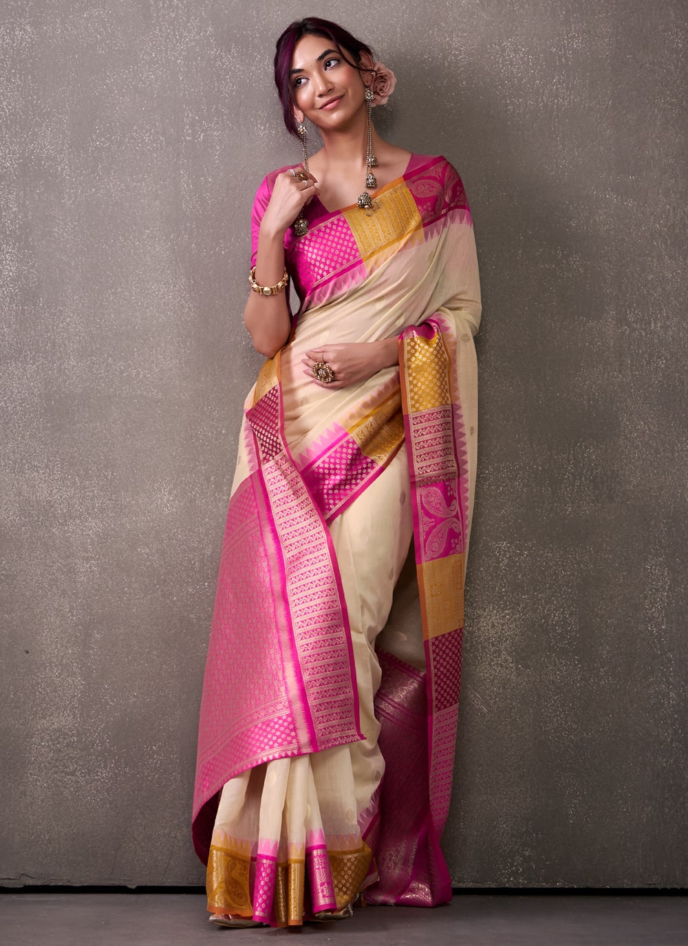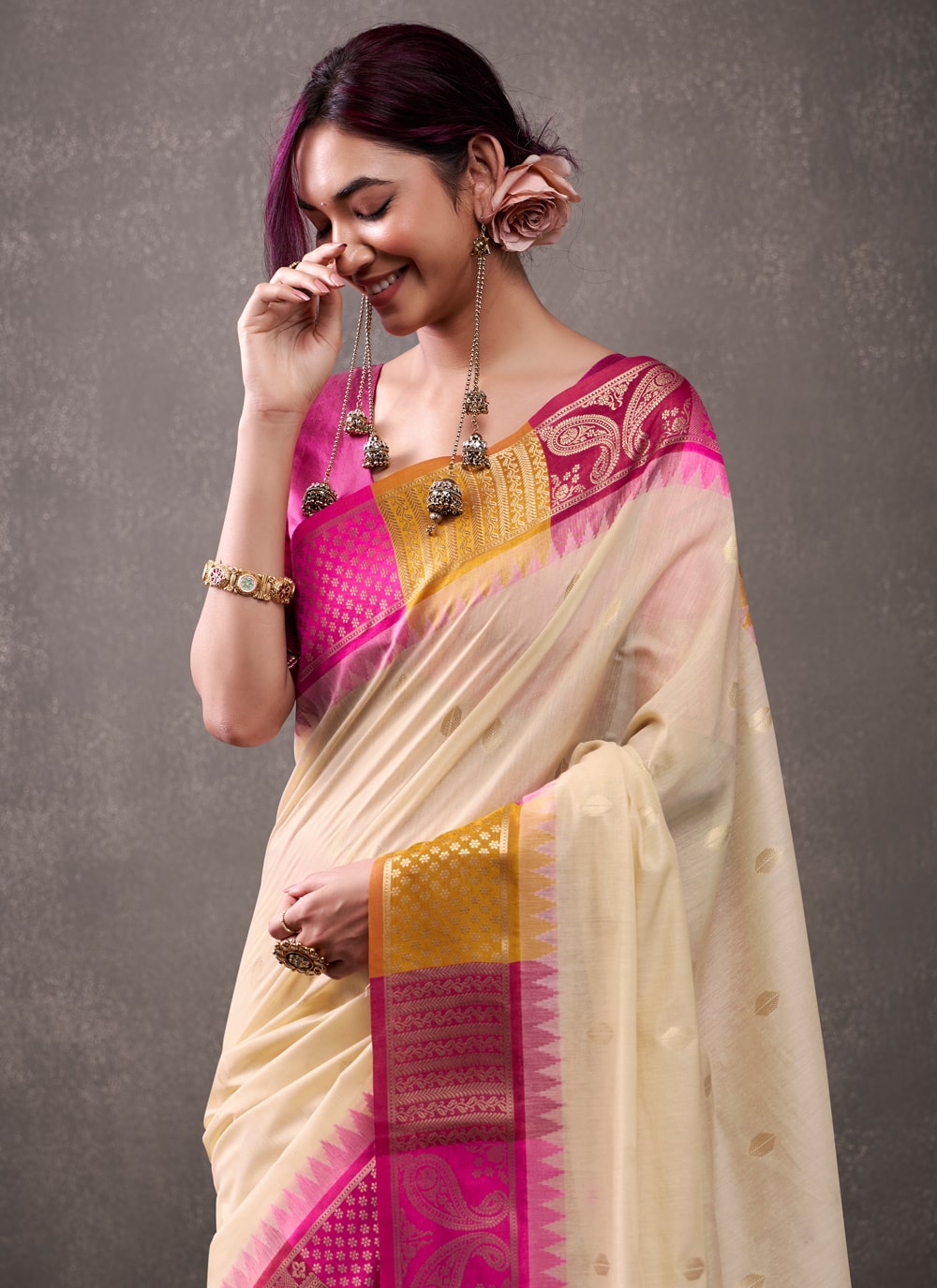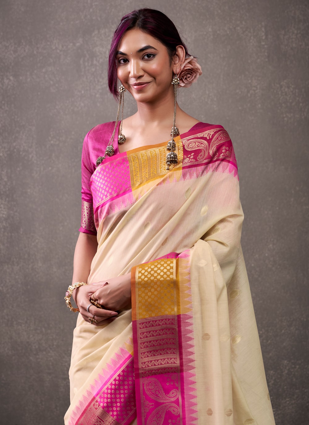 Embrace the essence of Indian tradition in this Cream Cotton Weaving Saree. Its breathable fabric, paired with delicate woven detailing, creates a graceful look ideal for festivals, family gatherings and cultural events. Comes with matching blouse.