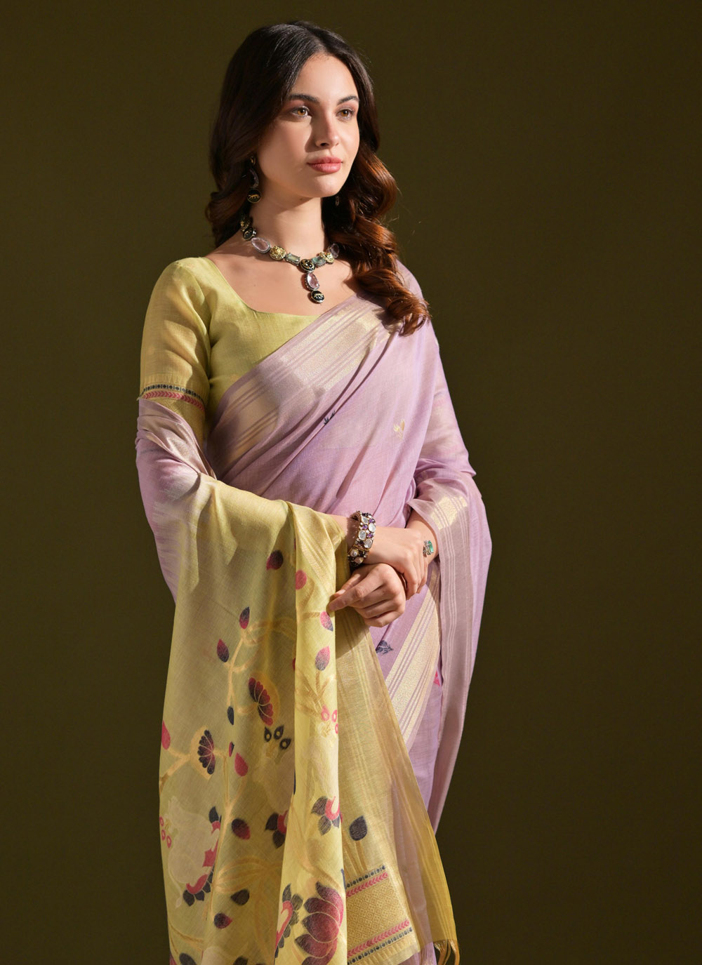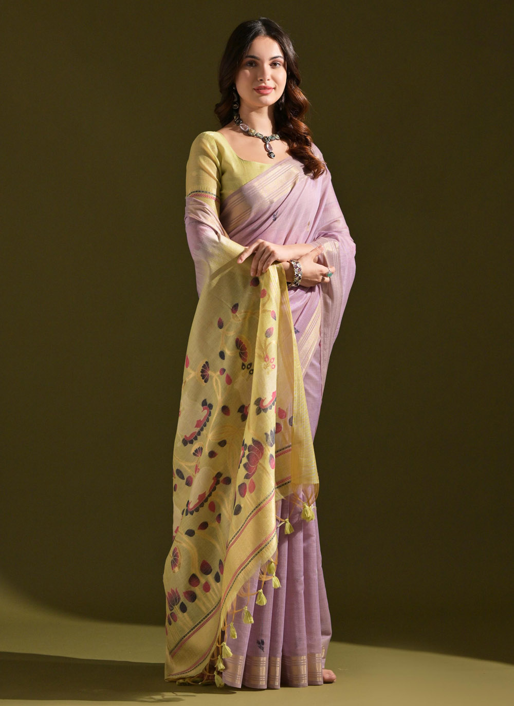 Elevate your ethnic wardrobe with this refreshing Lavender Woven Cotton Saree. The lightweight cotton fabric ensures all-day comfort, while the trendy woven designs make it a versatile pick for both contemporary and traditional looks. Comes with matching blouse.