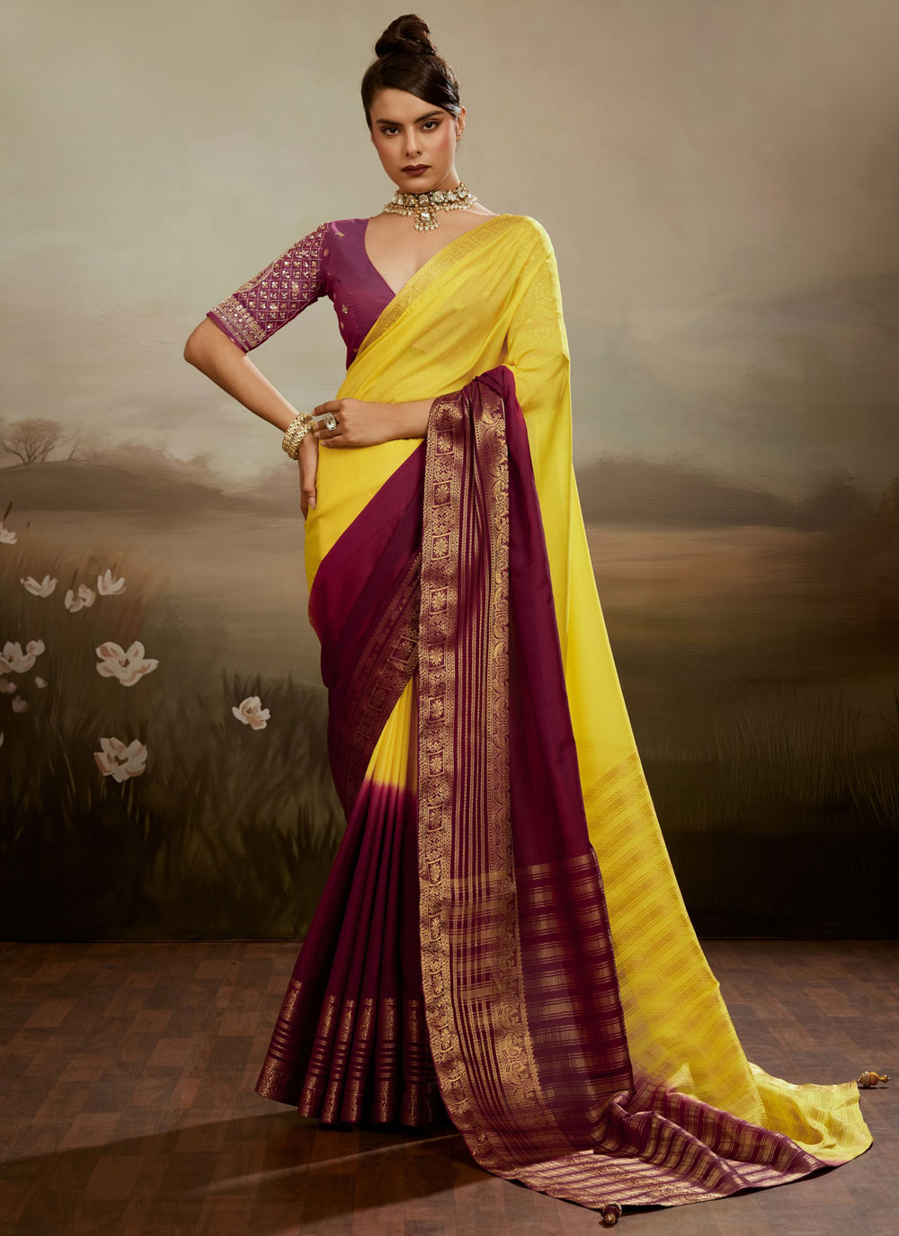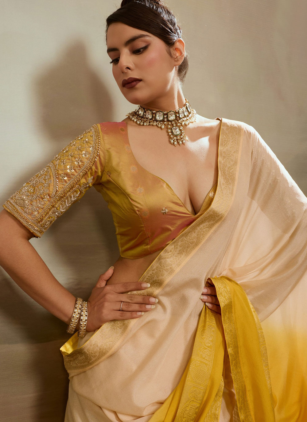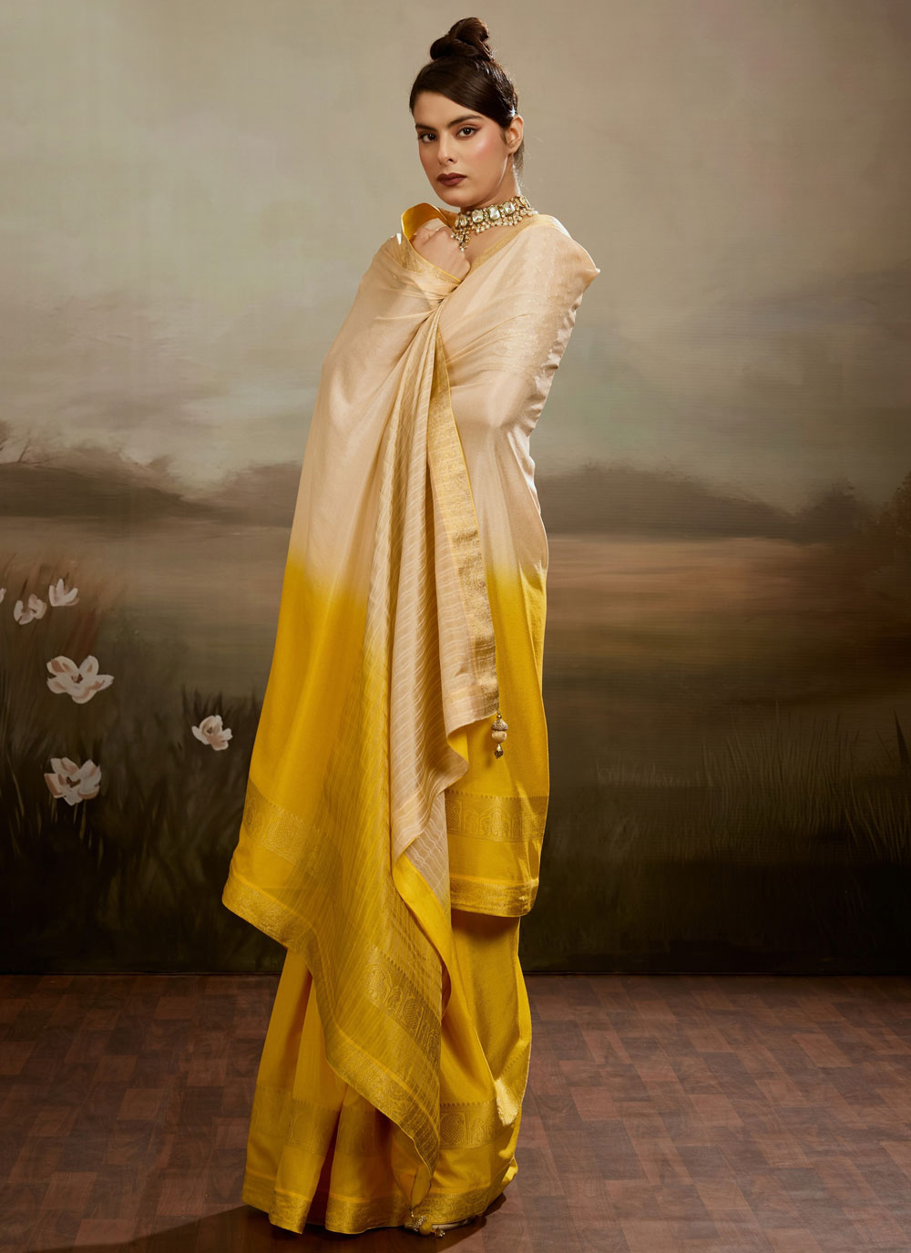 Elegant and stylish, this Cream and Yellow Woven Chiffon Contemporary Saree reflects a perfect balance of tradition and modern design. Comes with matching blouse.