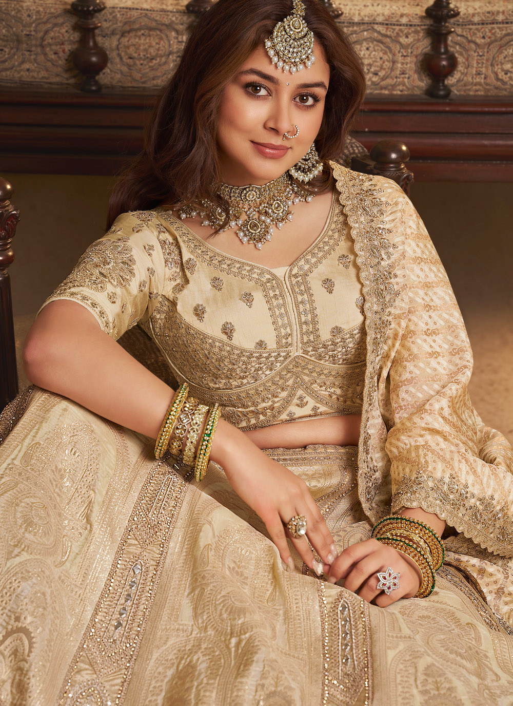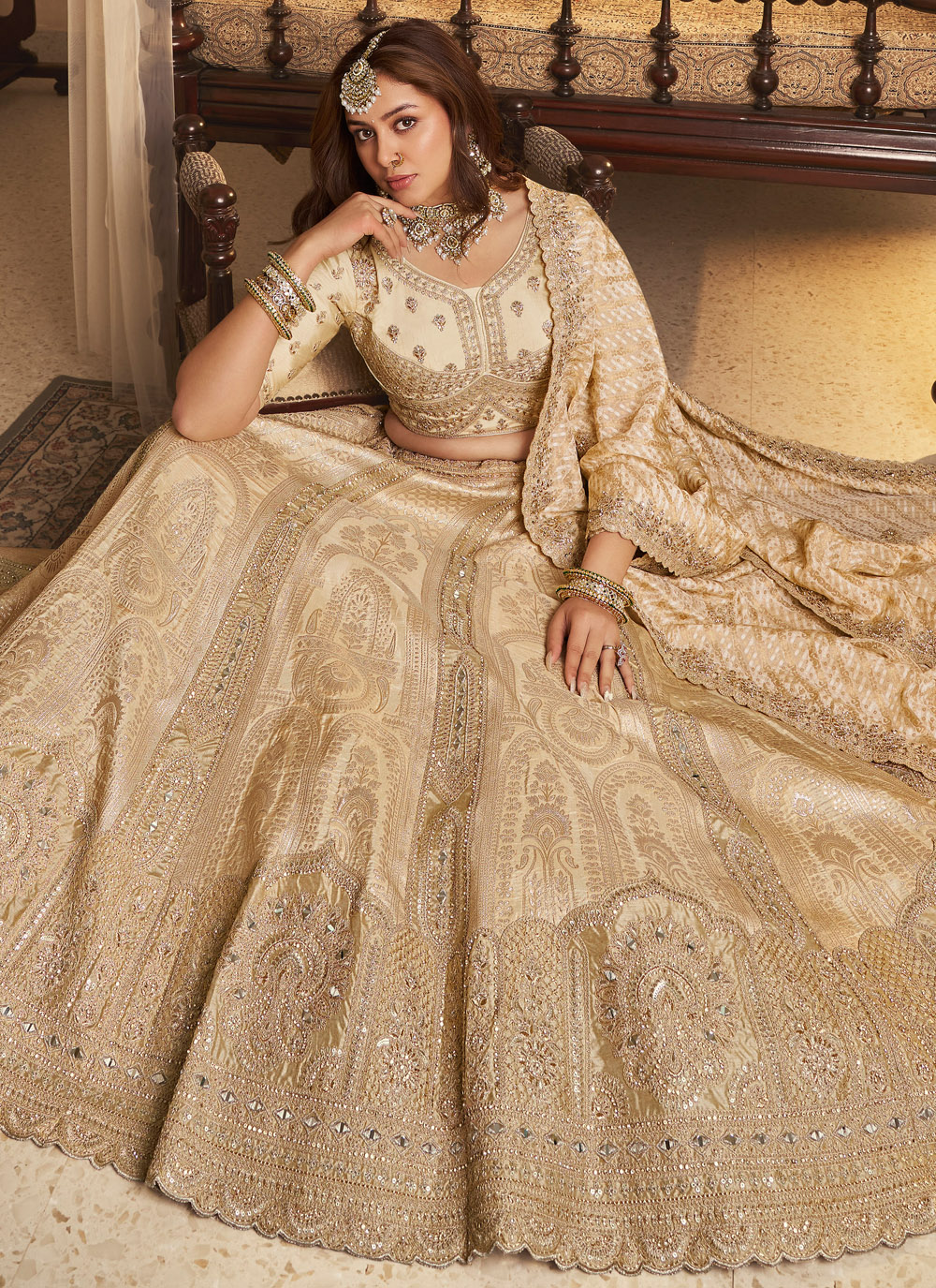 This Cream Banarasi Silk Reception Lehenga Choli, adorned with intricate zari embroidery, sparkling Swarovski crystals, sequins, and delicate stone work. The luxurious Banarasi silk fabric drapes gracefully, creating a sophisticated and regal look perfect for reception events. Comes with matching choli and dupatta.