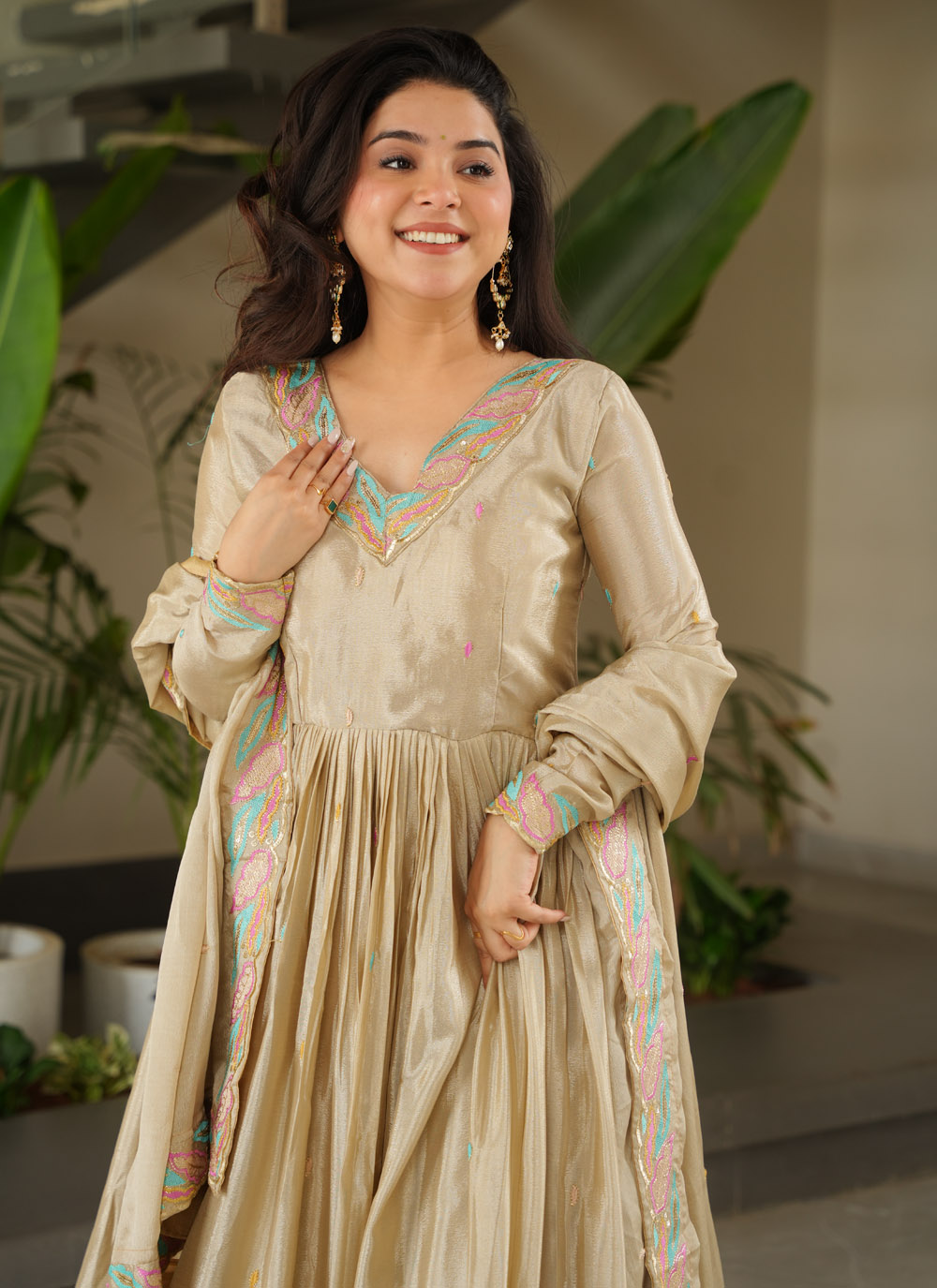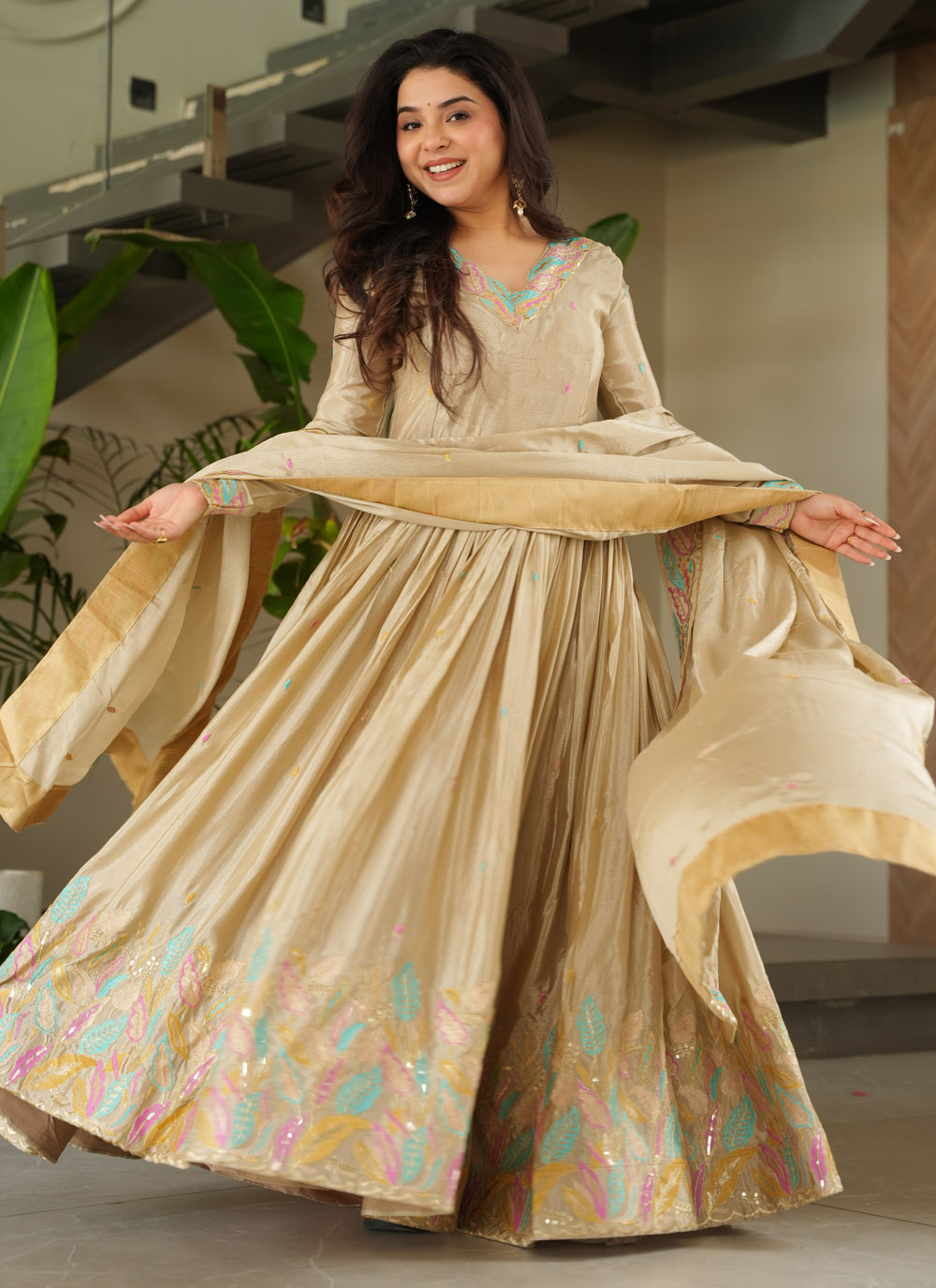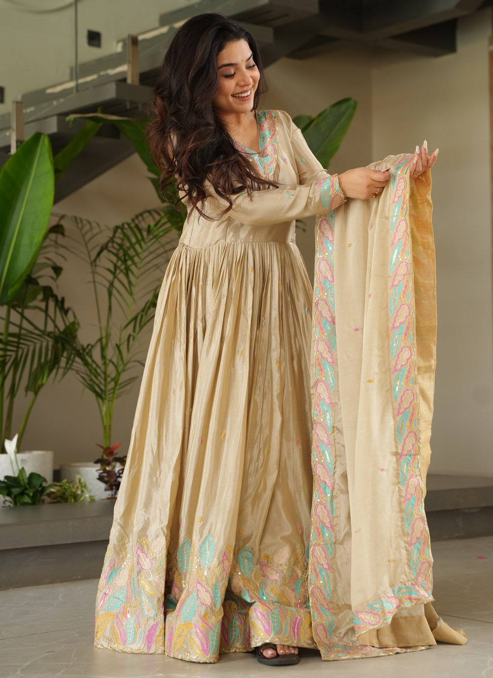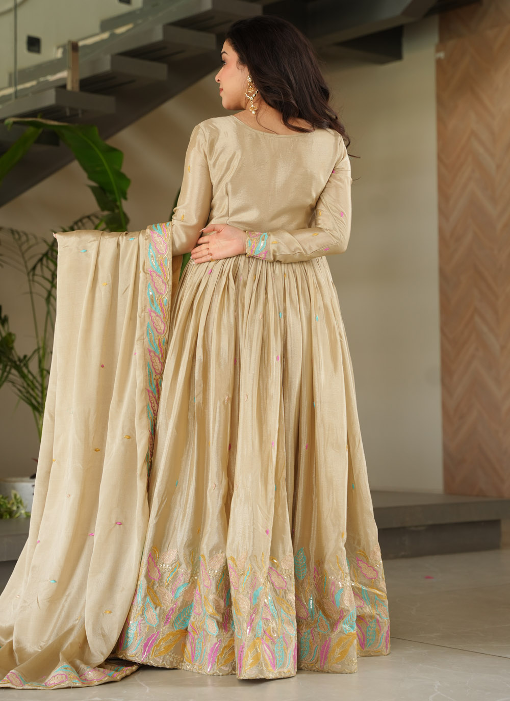 Step into refined elegance with this cream Chinon gown, beautifully adorned with shimmering sequins and multi-thread embroidery. Its flowing silhouette and intricate detailing make it perfect for receptions, engagement parties, or festive evenings. Comes with matching dupatta.