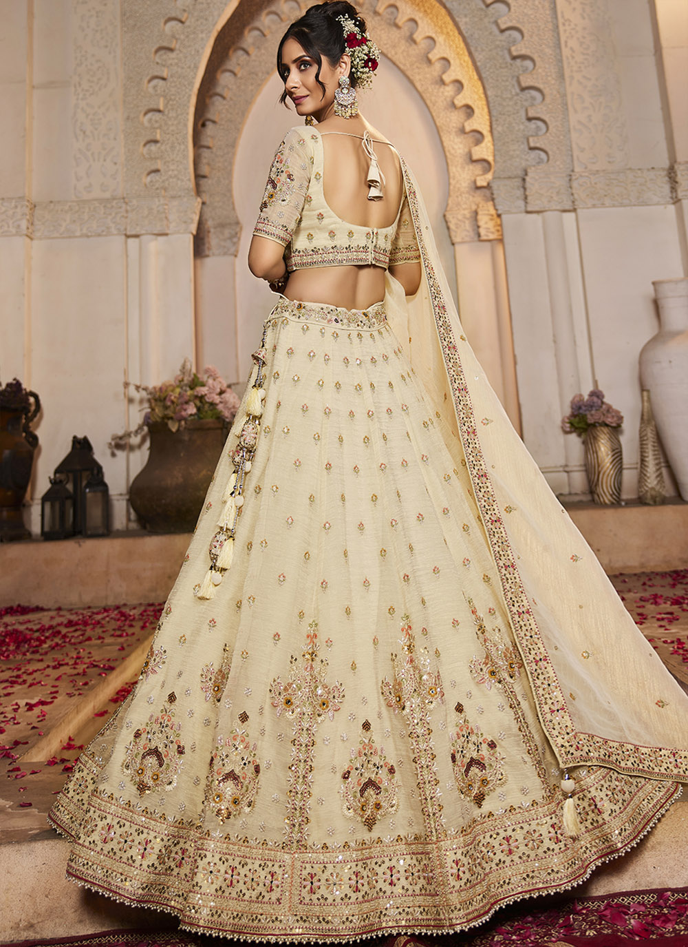 Step into the spotlight with this luxurious cream tissue lehenga choli, exquisitely embroidered with sequins, stones, beads, and zari. The intricate work adds a touch of opulence to the lightweight, airy fabric, creating a stunning contrast between the soft tissue and the dazzling embellishments. Perfect for weddings, receptions, or festive occasions, this lehenga choli will ensure you look elegant and radiant from every angle.