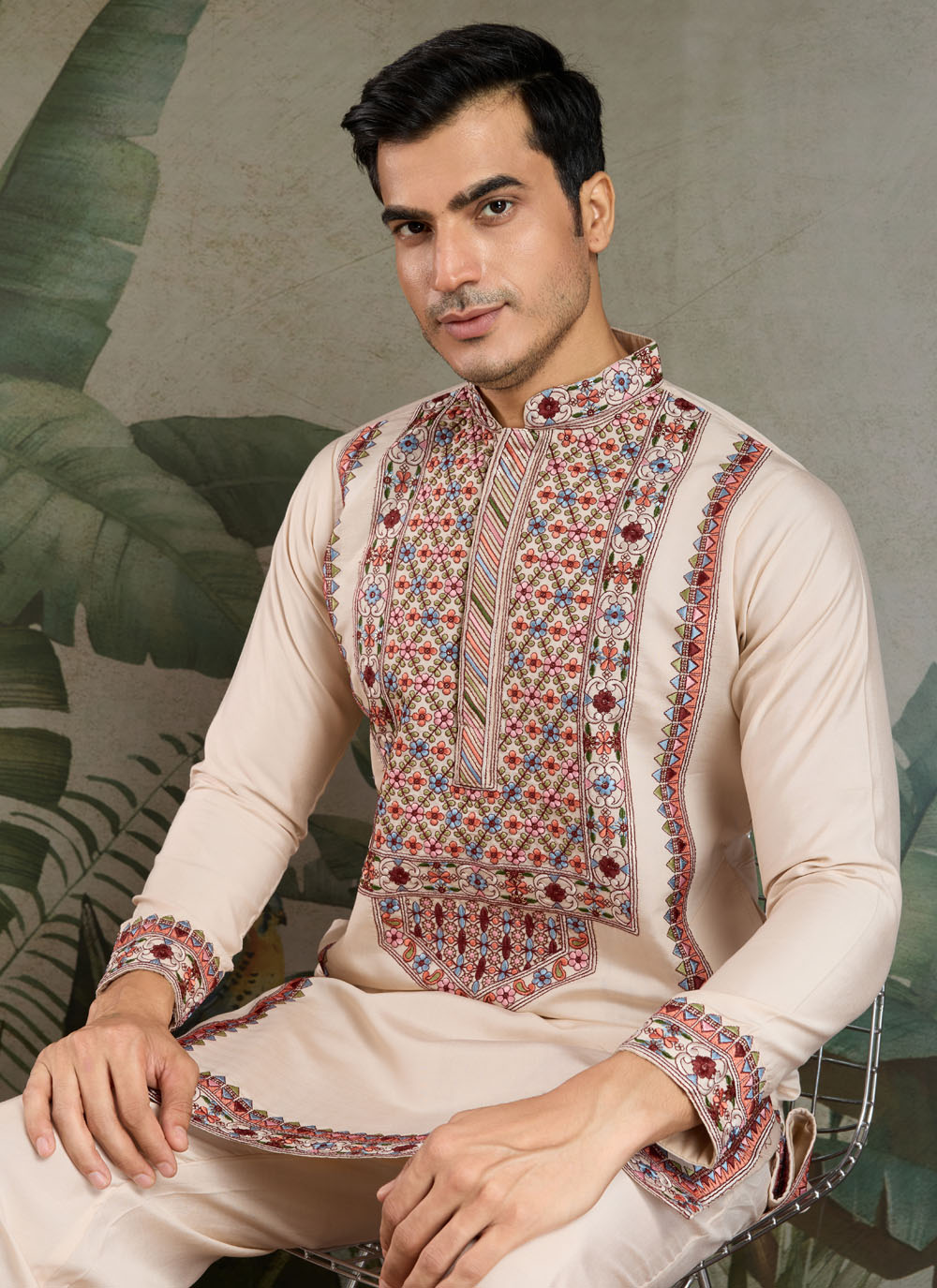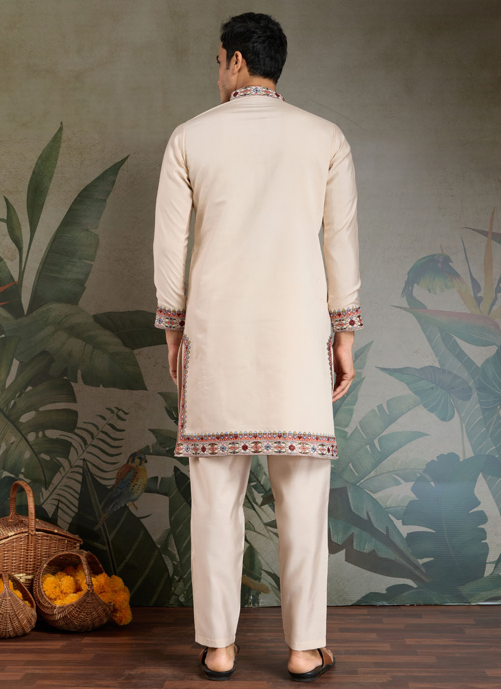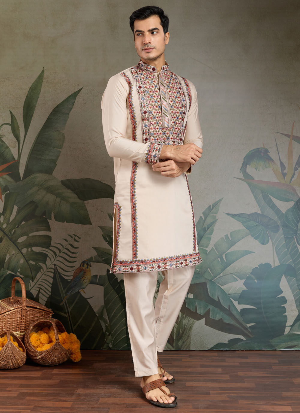 Bring understated sophistication to your ethnic wardrobe with this Cream Embroidered Kurta Pyjama in Viscose Fabric. Designed for the modern gentleman who appreciates tradition, this kurta features fine embroidery work that elevates its elegant cream base.