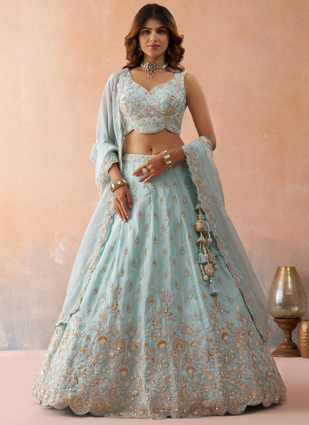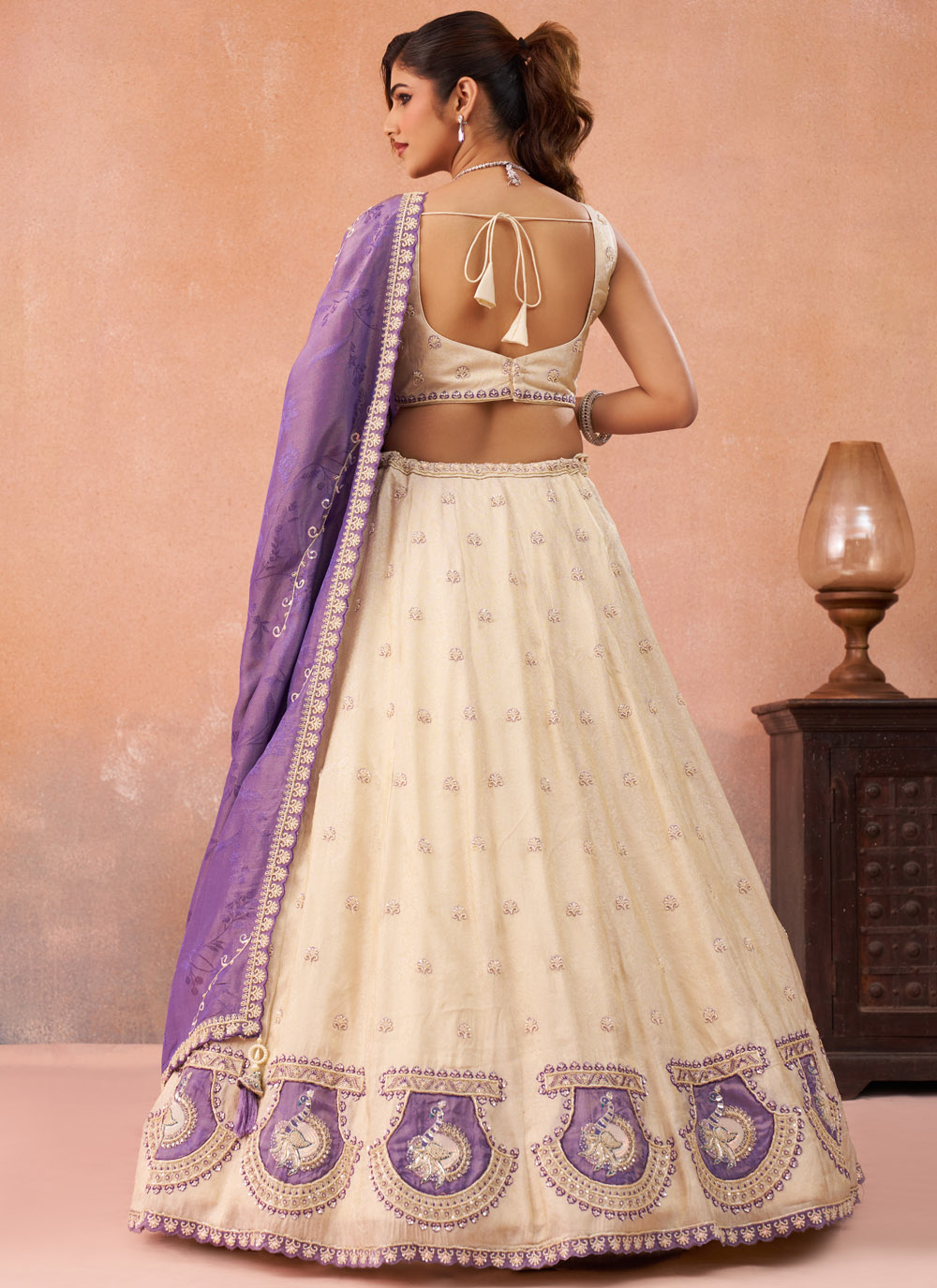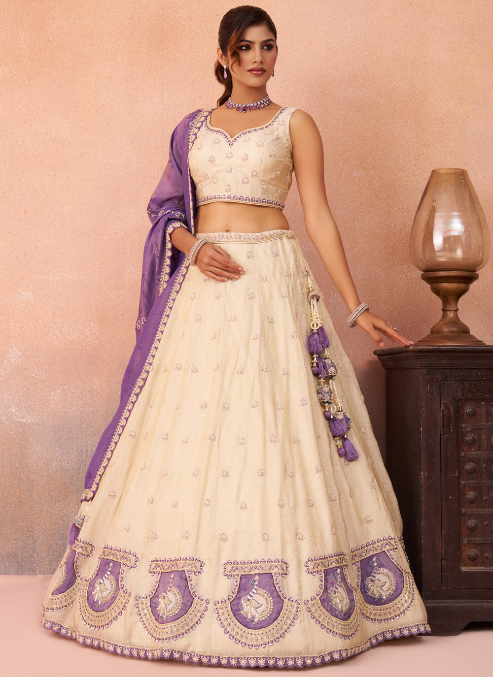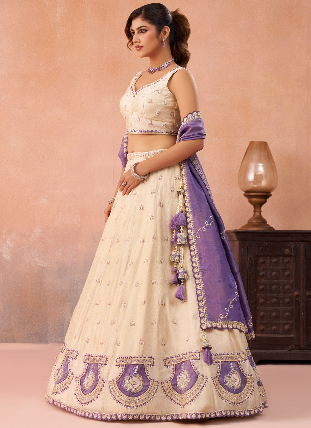 Celebrate special moments in style with this Cream Jacquard Embroidered Ceremonial Lehenga Choli. The intricate beadwork and sparkling sequins enhance the detailed jacquard texture, offering a rich and refined look. Comes with matching choli and dupatta.