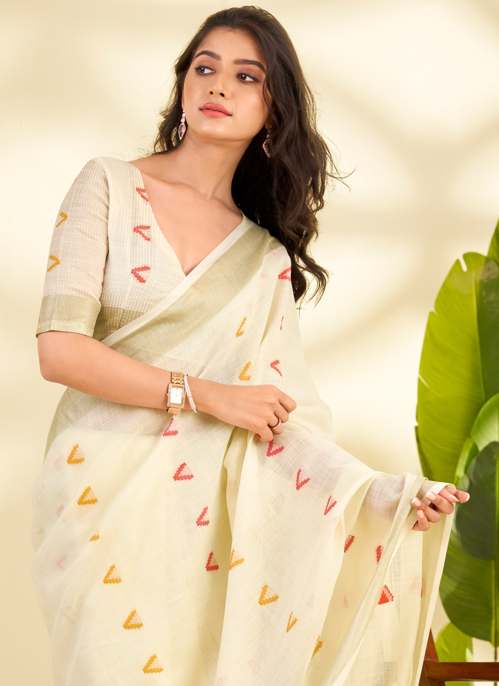 Drape yourself in the timeless grace of this Cream Linen Saree adorned with beautifully woven border work. Its lightweight, breathable fabric ensures comfort, while the refined cream tone brings sophistication to any gathering. Comes with matching blouse.