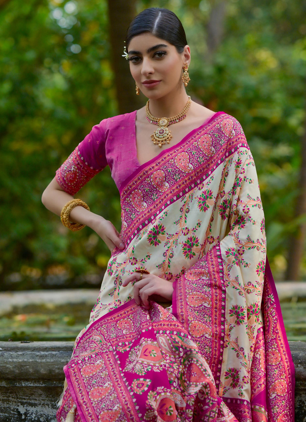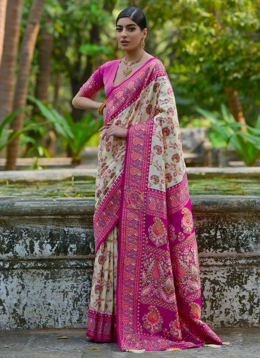 This trendy saree celebrates Kashmir’s timeless artistry. Made from premium cream pashmina silk, it features colorful Meena work inspired by traditional Kashmiri motifs. Perfect for festive gatherings, winter weddings, or elegant evening occasions. Comes with matching blouse.