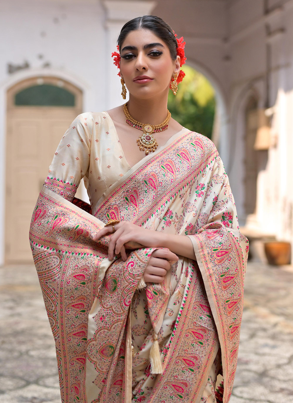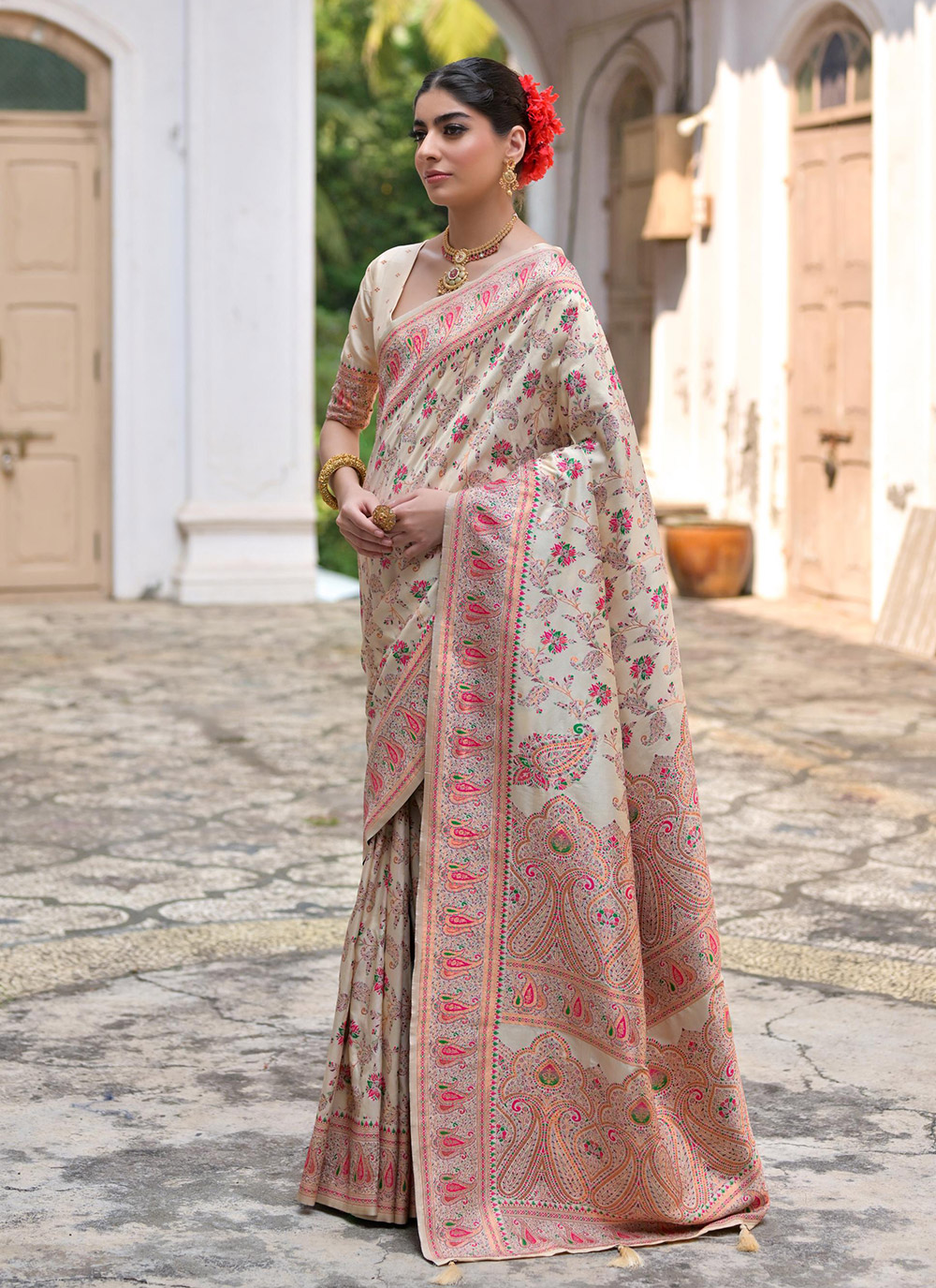 Elevate your style with the Cream Pashmina Silk Printed Trendy Saree. Featuring a chic print and crafted from premium Pashmina silk, this saree comes with a matching blouse, making it perfect for special events, parties, and festive occasions.