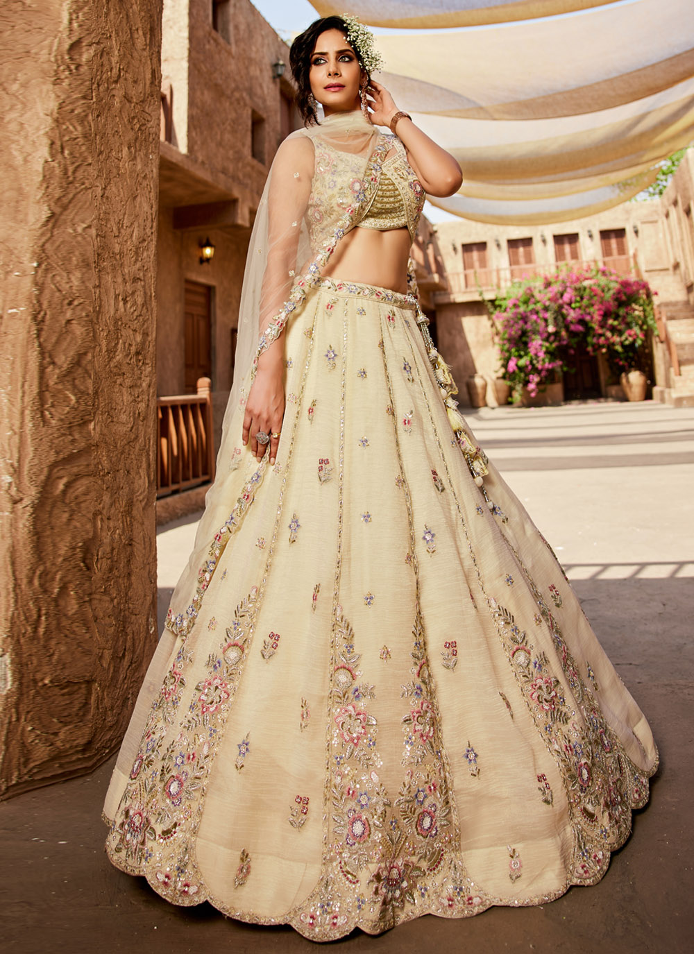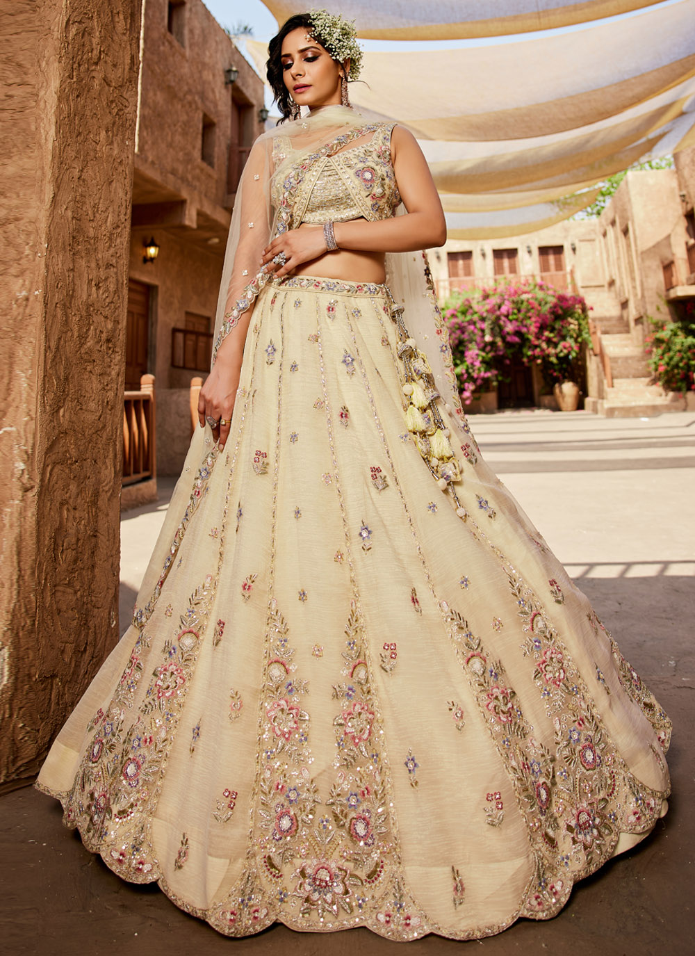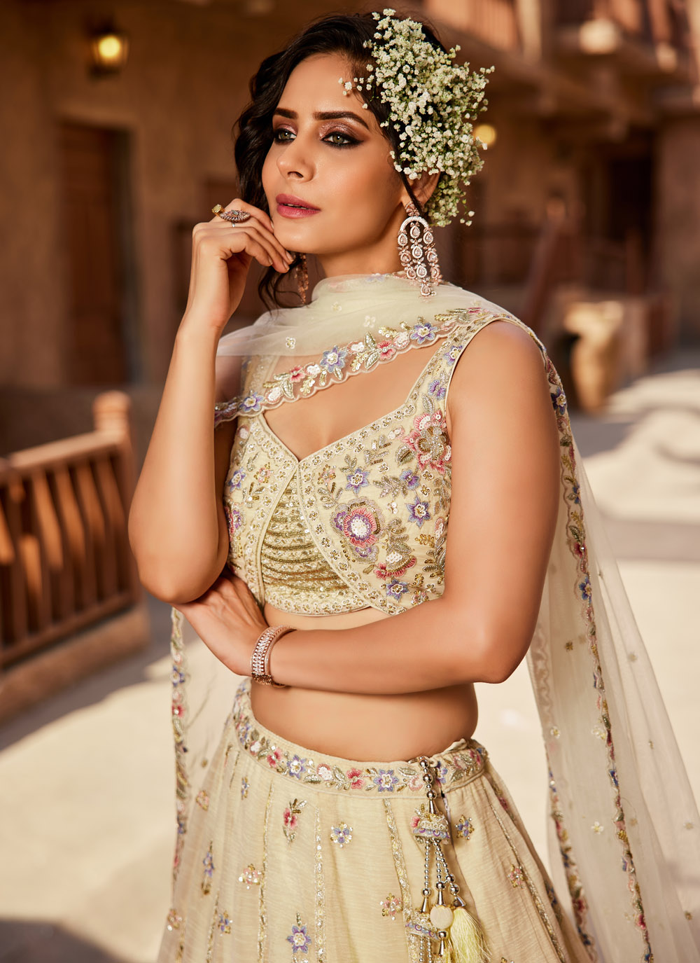 Add a touch of royalty to your collection with this Cream Tissue Lehenga Choli, featuring intricate zari embroidery, sparkling sequins, and delicate bead embellishments. Designed for elegant women who love timeless fashion, this lehenga is ideal for festive occasions and special gatherings. Comes with matching choli and dupatta.