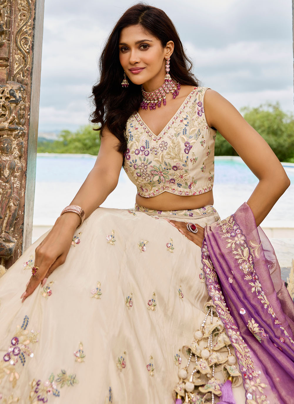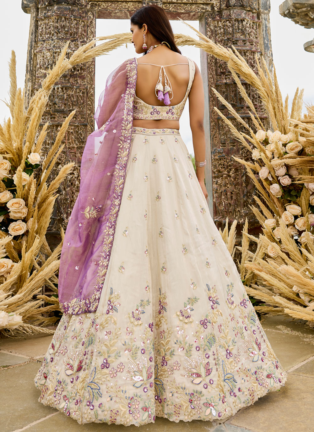 Elevate your ethnic wardrobe with this cream sequins and stone embroidered tissue lehenga choli. The soft fabric glows with elegance, while the detailed thread embroidery adds a delicate charm. This lehenga choli ensures a classy and elegant statement. Comes with matching choli and dupatta.