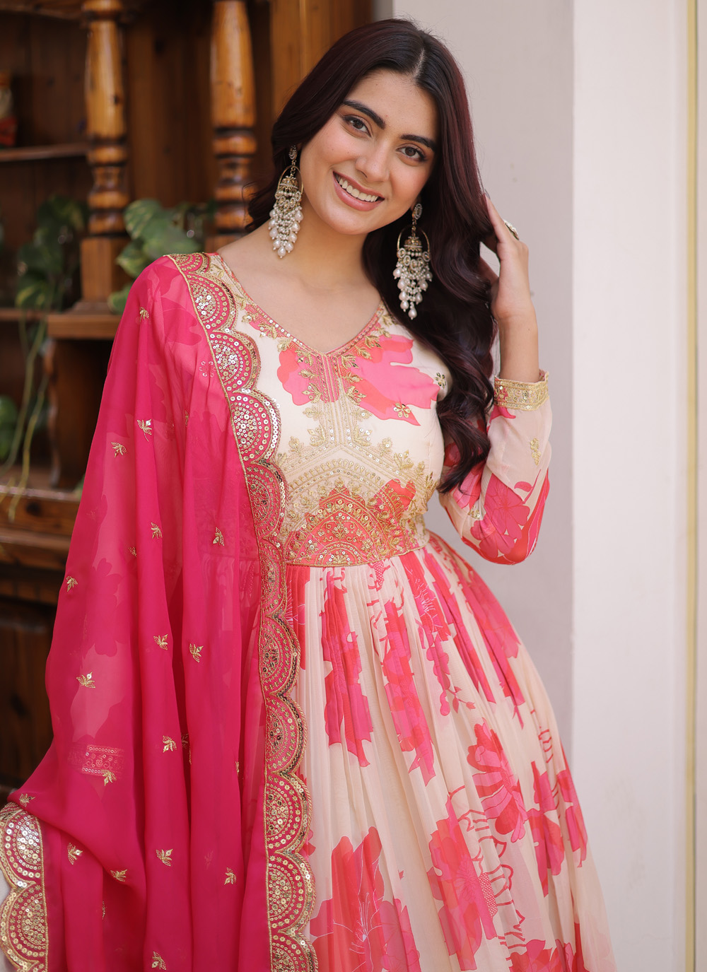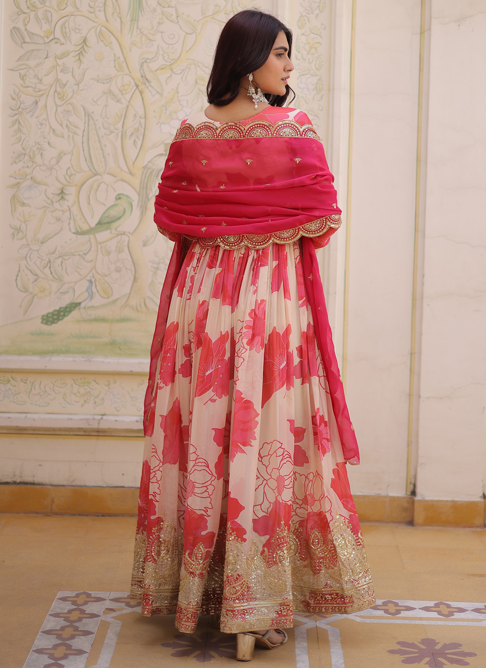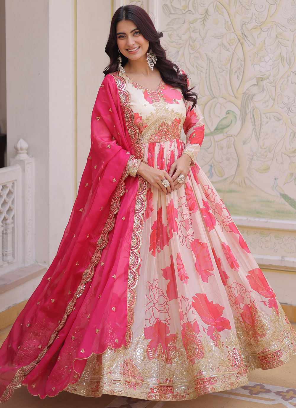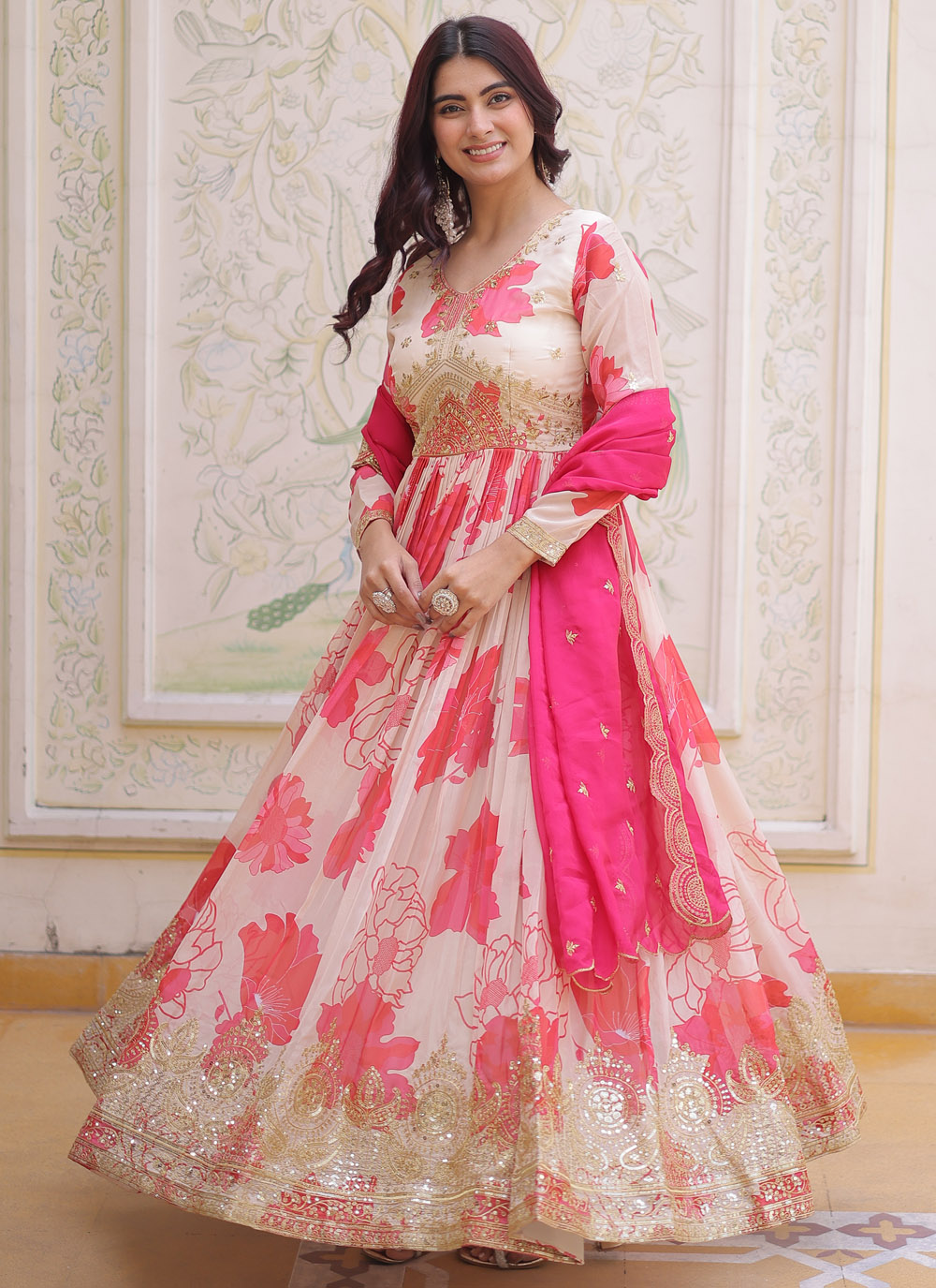 This Cream Silk Digital Print Gown showcases a graceful blend of modern printing techniques and classic embroidery.