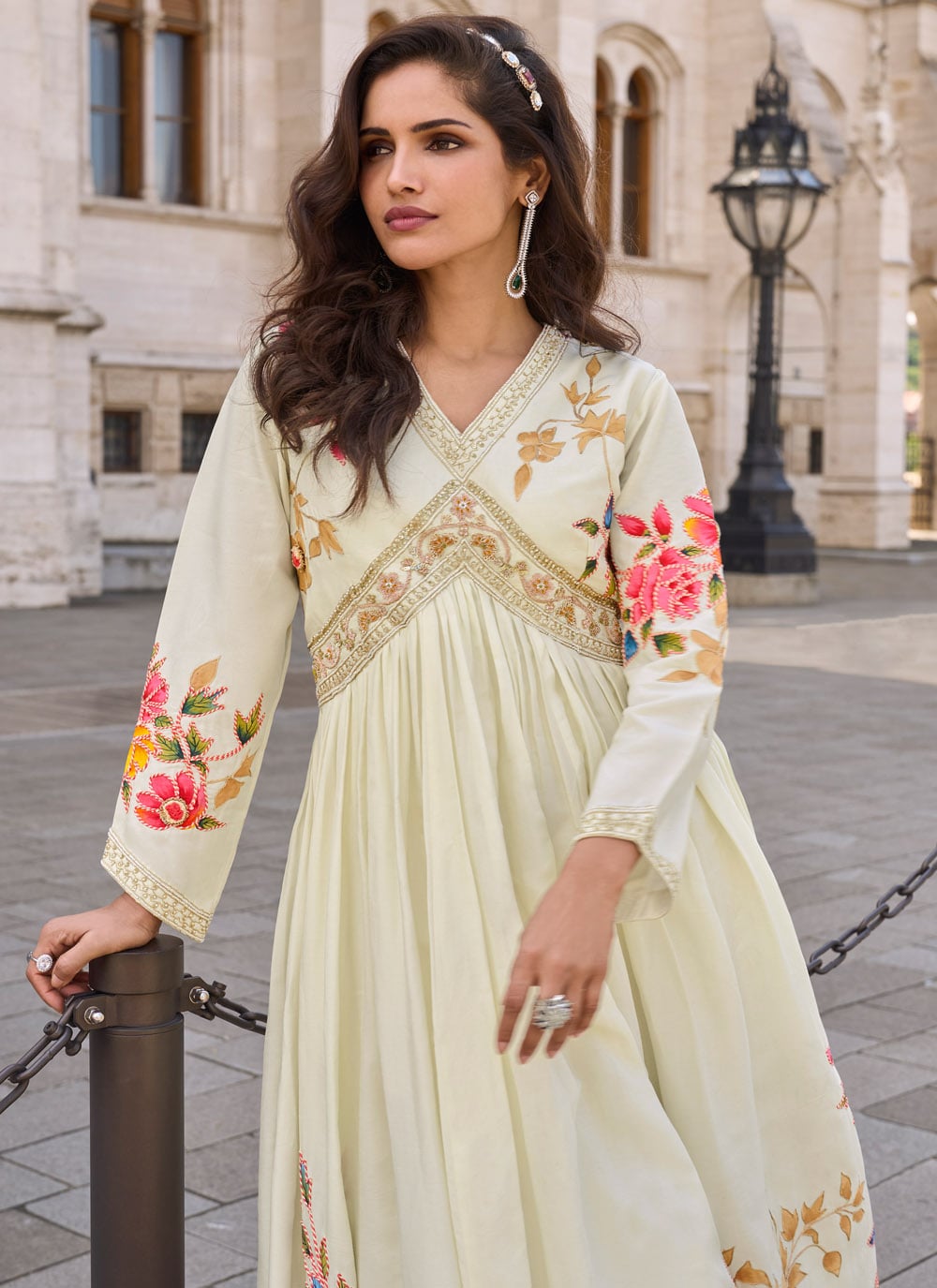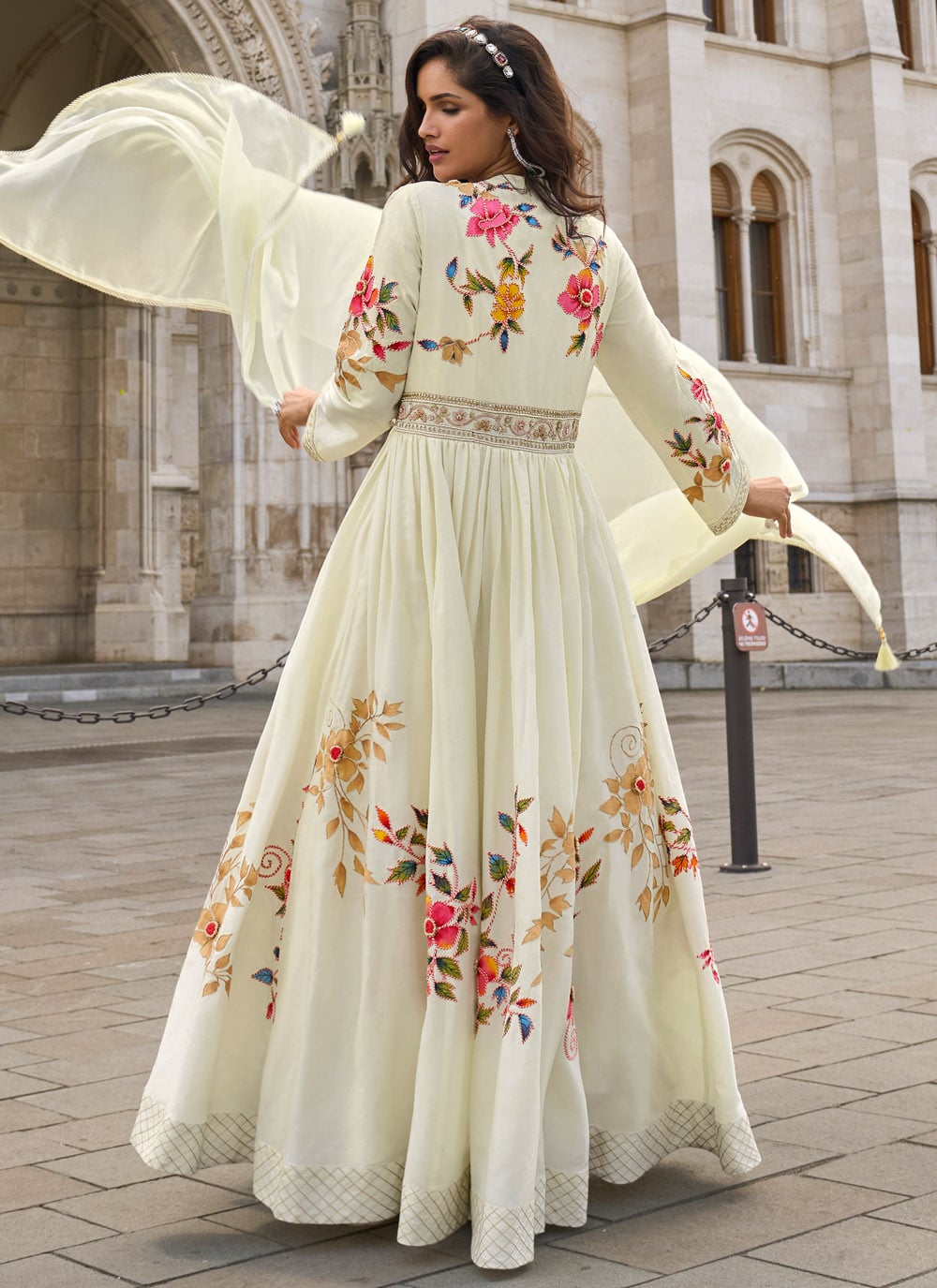 Elevate your special occasion style with this designer embroidered gown in cream silk, featuring beautifully detailed patterns. Its rich fabric and graceful fall create a stunning and refined appearance.