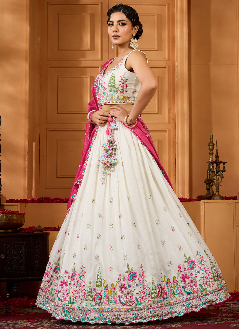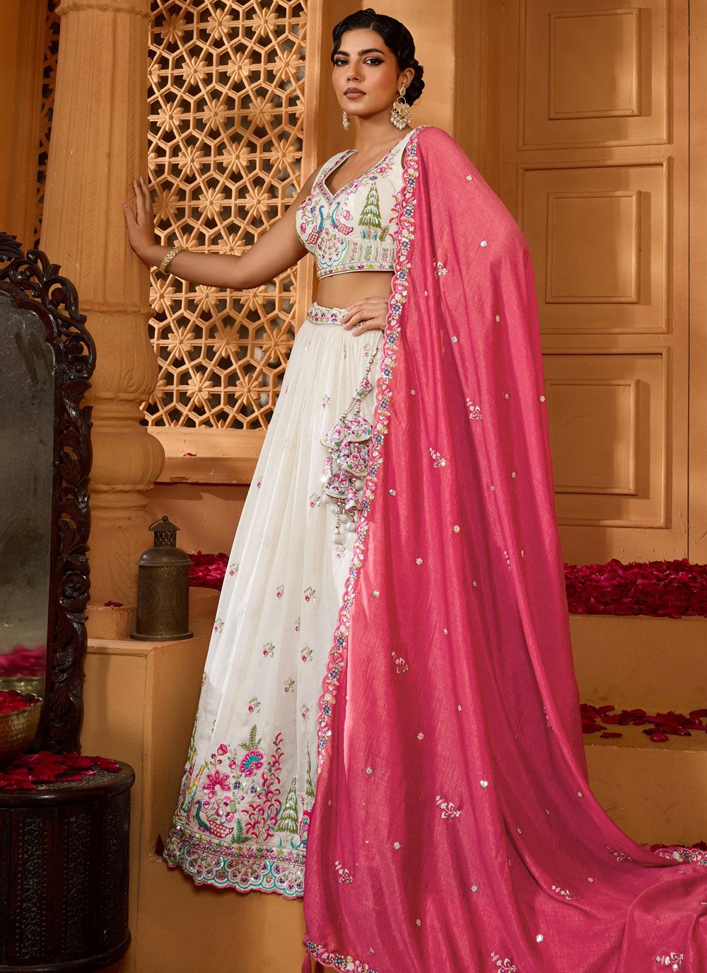 A fusion of contemporary design and traditional embroidery, this cream lehenga choli boasts sequins, stones, thread embroidery, and cut work across its rich silk fabric. Its designer flair makes it a perfect choice for ceremonial and festive occasions. Comes with matching choli and dupatta.