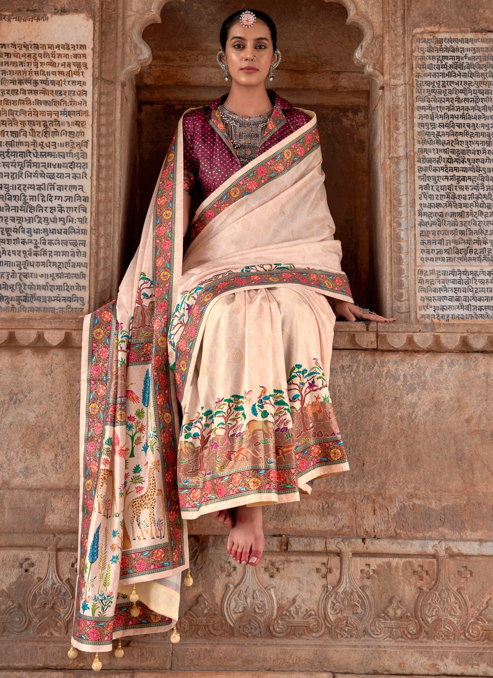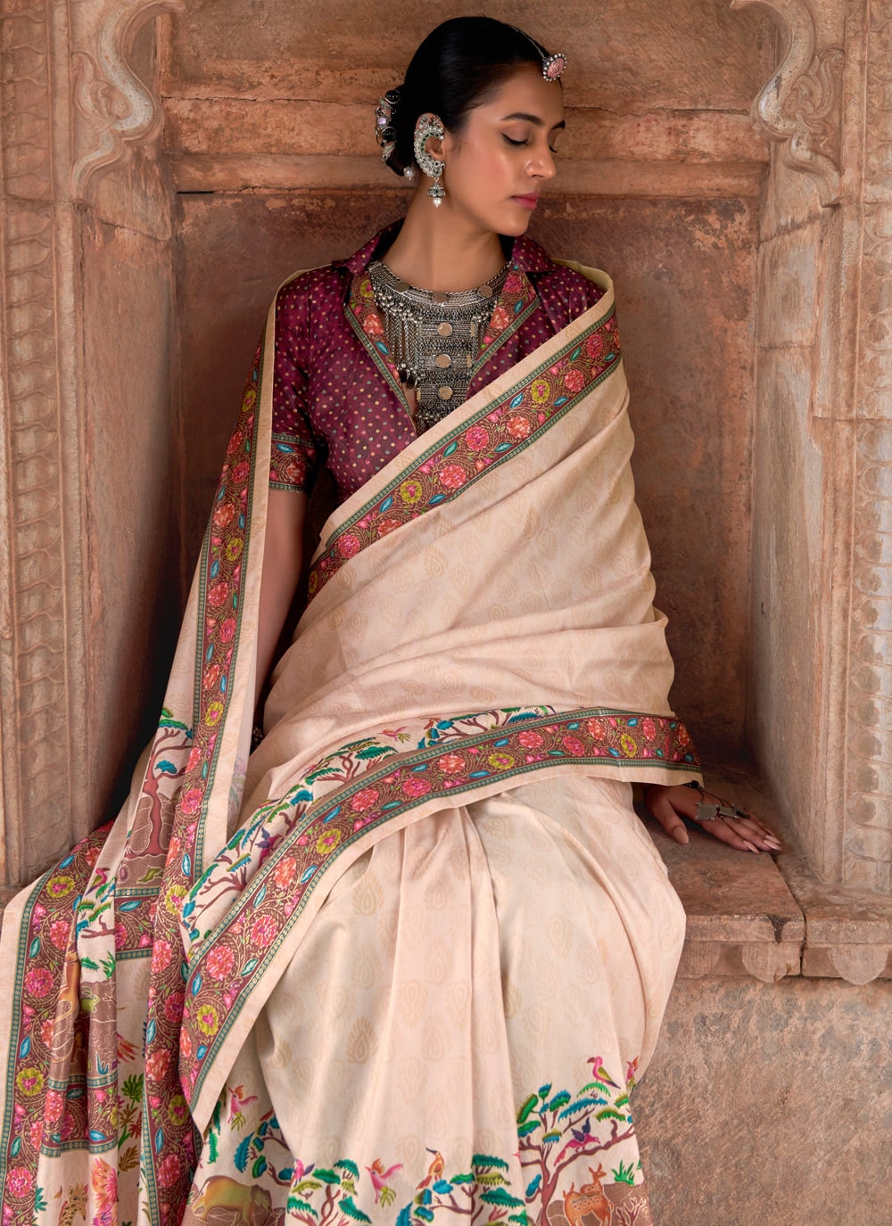 Celebrate elegance with this cream silk festival saree, highlighted with charming print work that gives it a graceful touch. The soft silk fabric drapes beautifully, while the prints add a modern twist to a timeless ethnic piece. Comes with matching blouse.