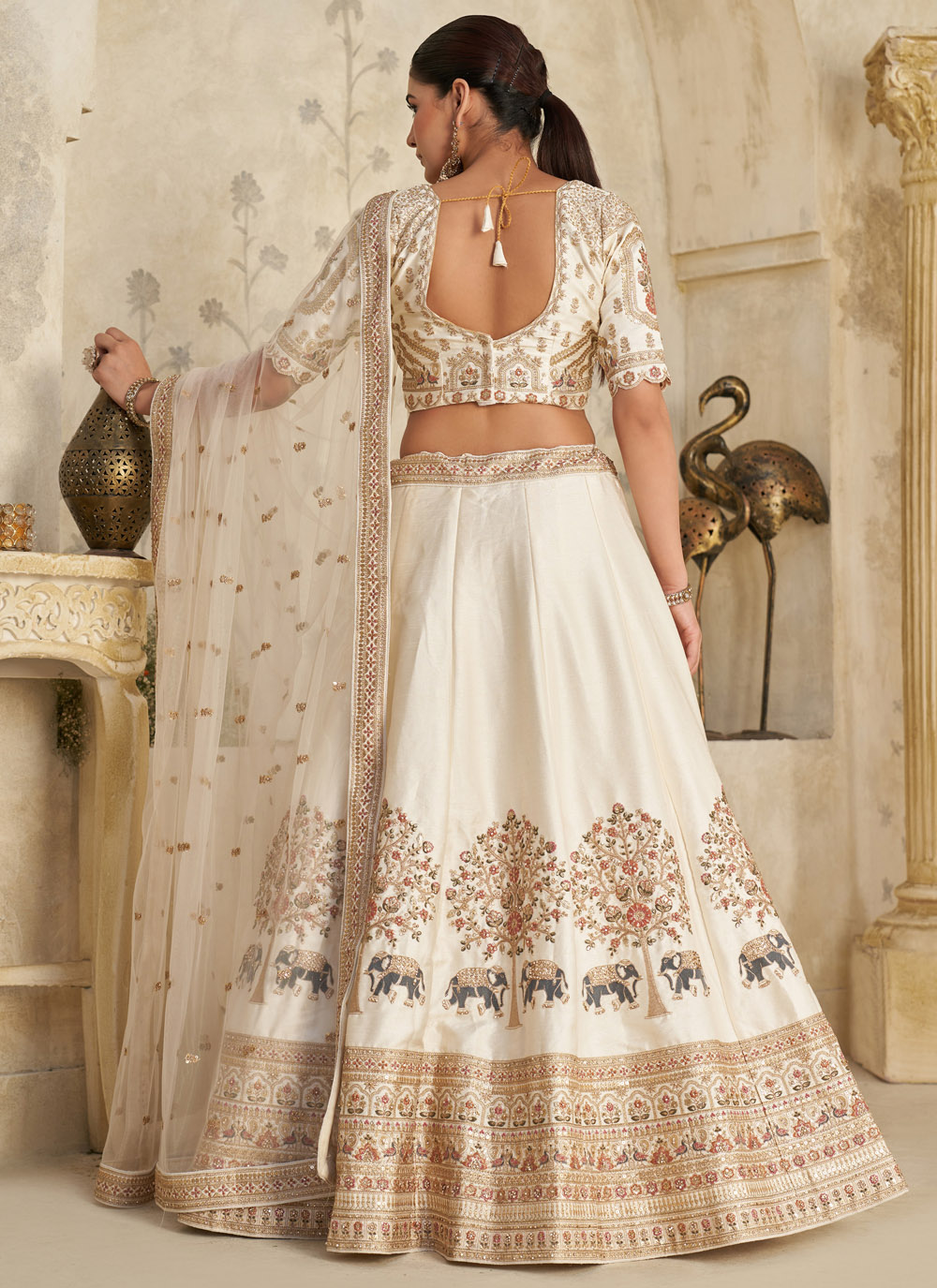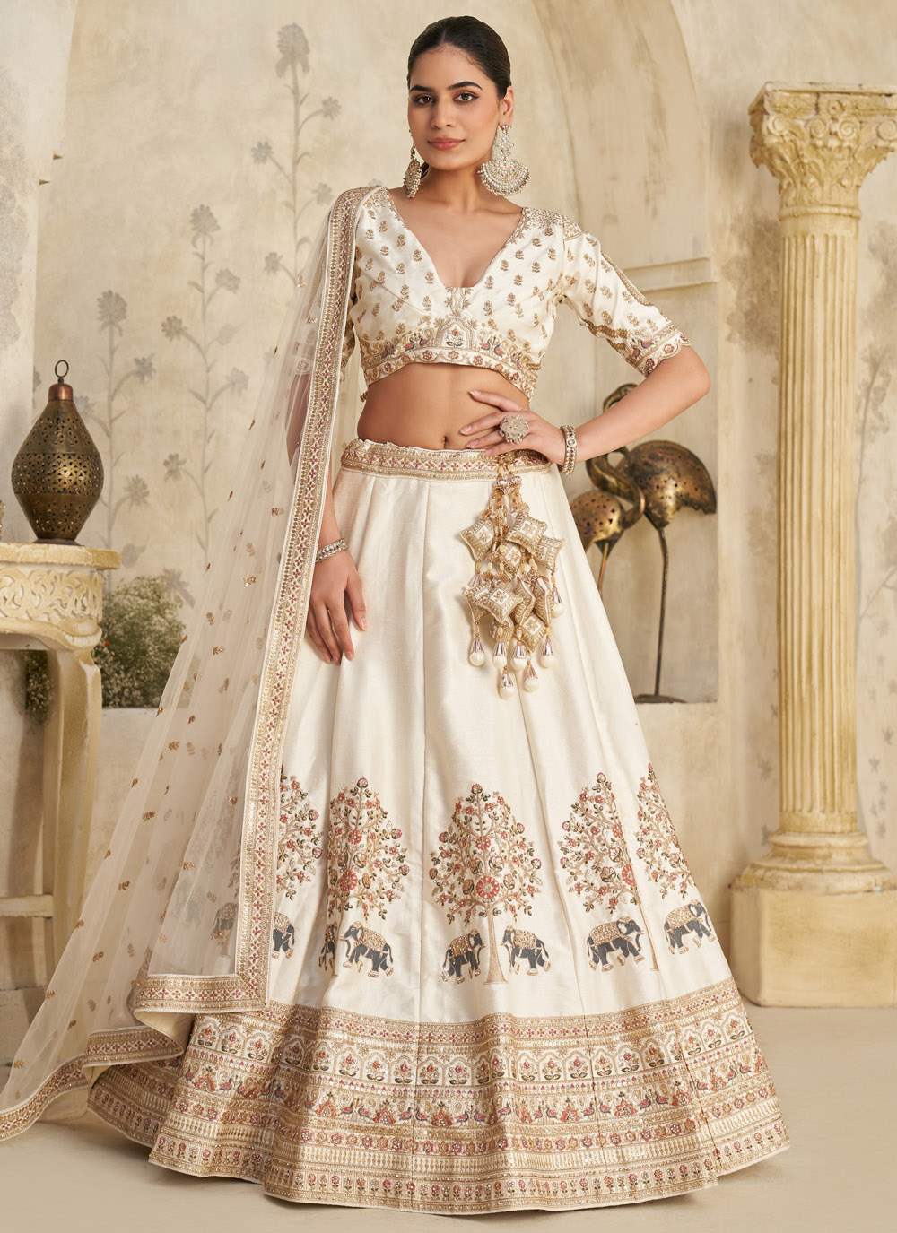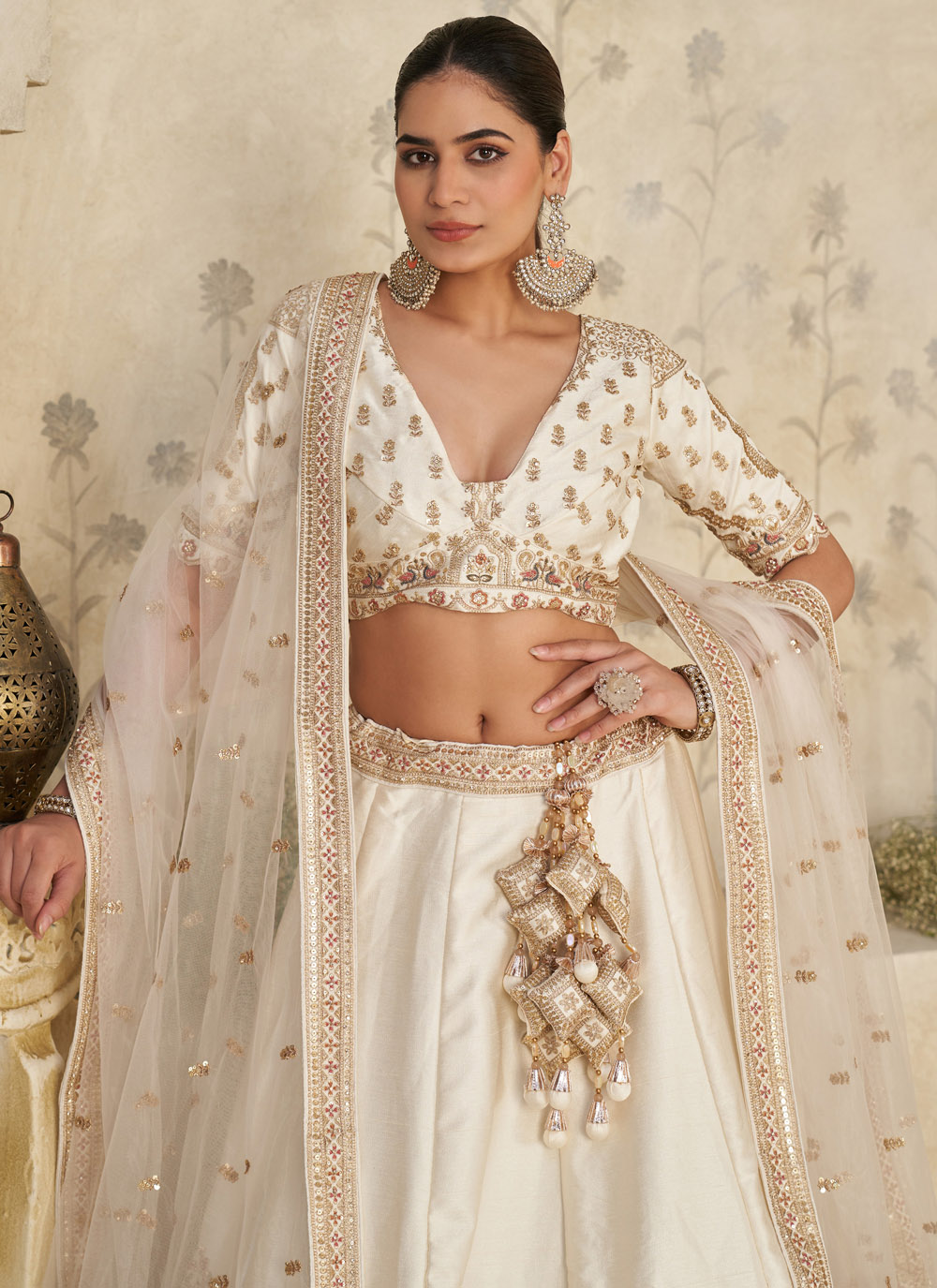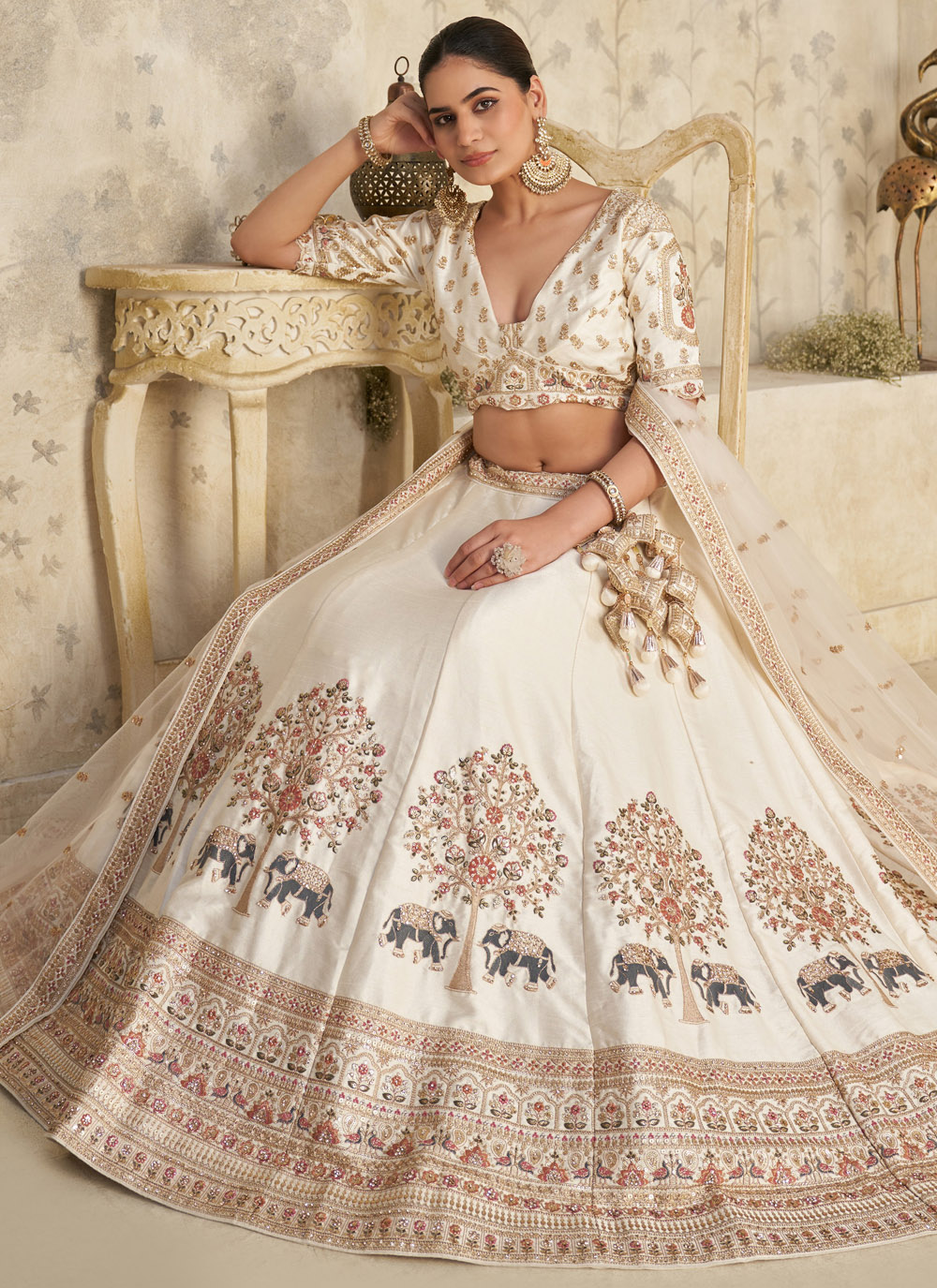 This cream lehenga choli blends delicate sequins and fine stone work on a smooth silk fabric. The neutral shade enhances the detailed embroidery, giving you a royal appearance suited for engagement ceremonies and elegant evening events. Comes with matching choli and dupatta.