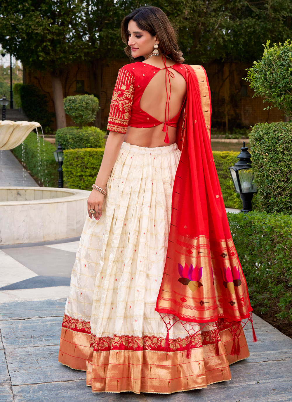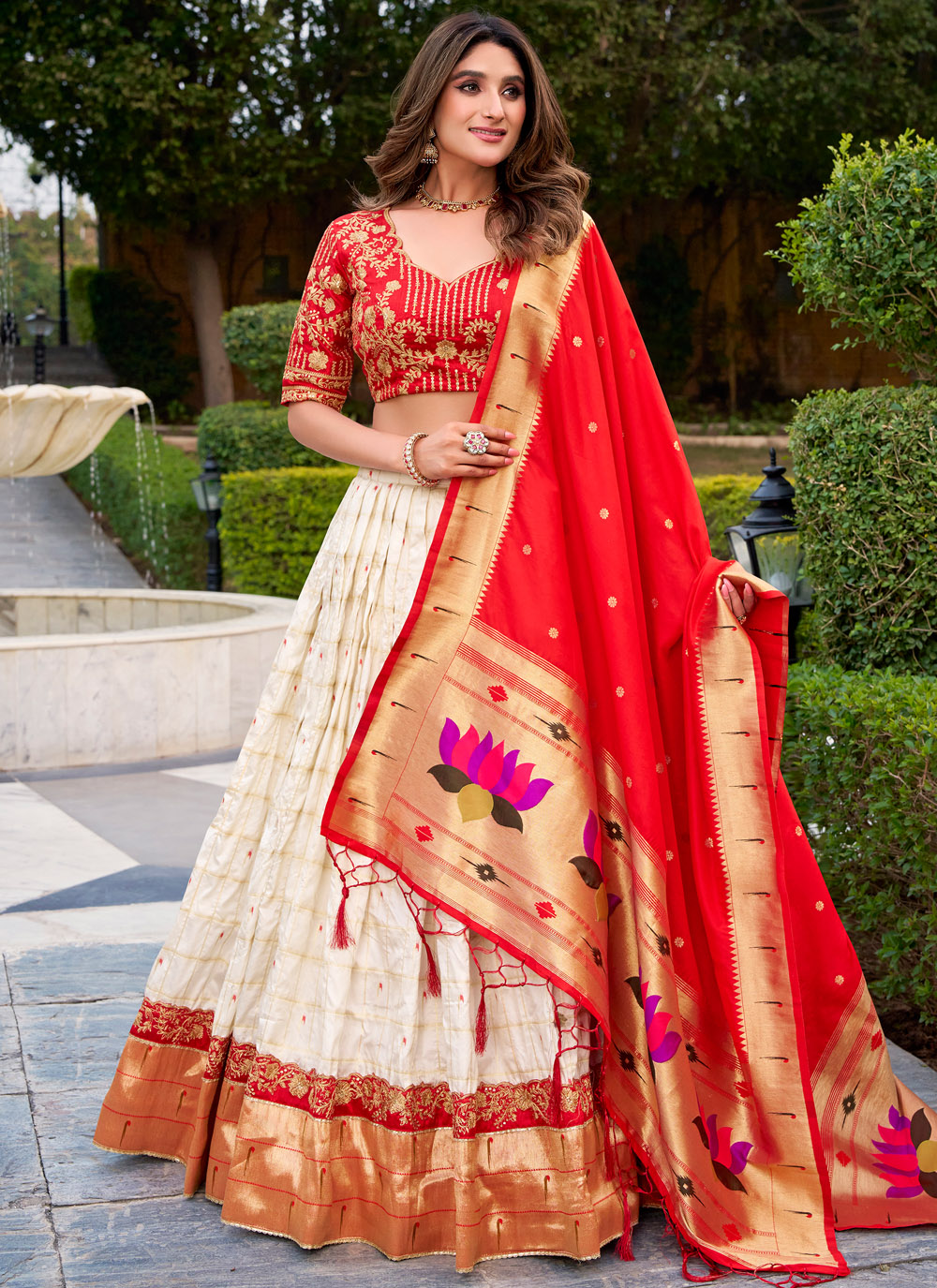 Add refined charm to your wedding wardrobe with this silk lehenga choli in a graceful cream tone. The detailed zari weaving and embroidery highlight traditional craftsmanship, while the premium silk fabric ensures a rich and comfortable drape. Comes with matching choli and dupatta.
